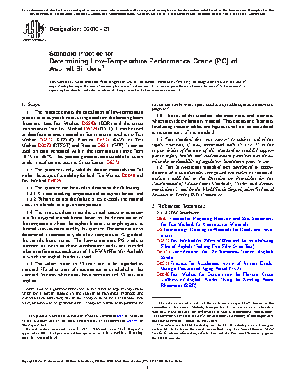 1.1 This practice covers the calculation of low-temperature properties of asphalt binders using data from the bending beam rheometer (see Test Method D6648) (BBR) and the direct tension tester (see Test Method D6723) (DTT). It can be used on data from unaged material or from material aged using Test Method D2872 (RTFOT), Practice D6521 (PAV), or Test Method D2872 (RTFOT) and Practice D6521 (PAV). It can be used on data generated within the temperature range from +6 °C to –36 °C. This practice generates data suitable for use in binder specifications such as Specification D6373.