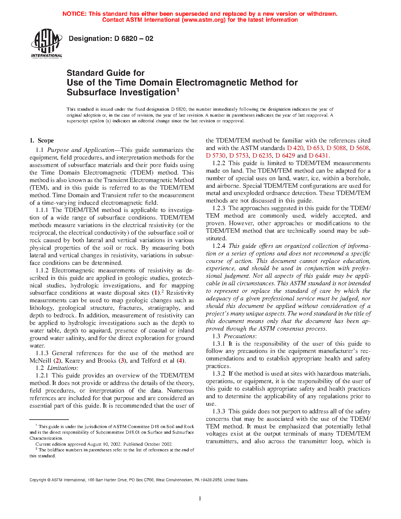 1.2.1 This guide provides an overview of the TDEM/TEM method. It does not provide or address the details of the theory, field procedures, or interpretation of the data. Numerous references are included for that purpose and are considered an essential part of this guide. It is recommended that the user of the TDEM/TEM method be familiar with the references cited and with the ASTM standards D420, D653, D5088, D5608, D5730, D5753, D6235, D6429 and D6431.
