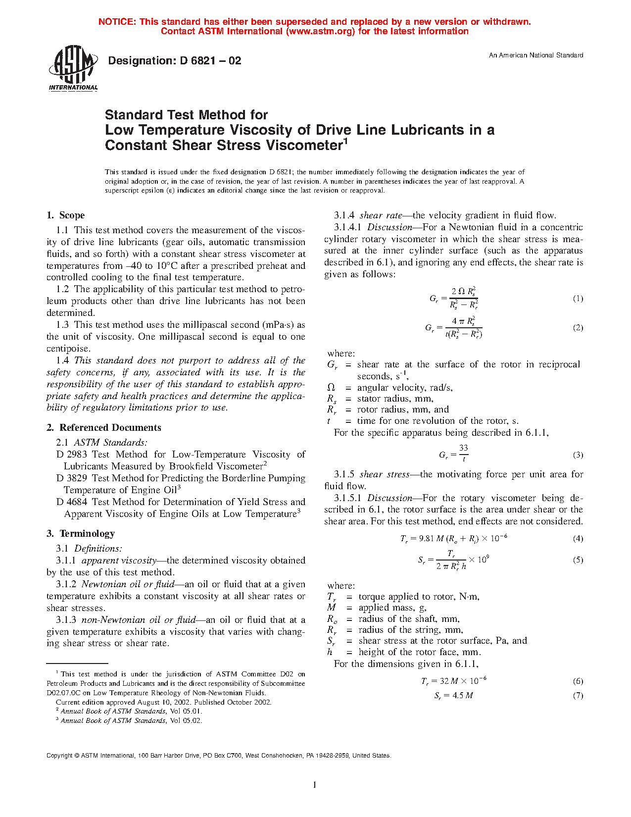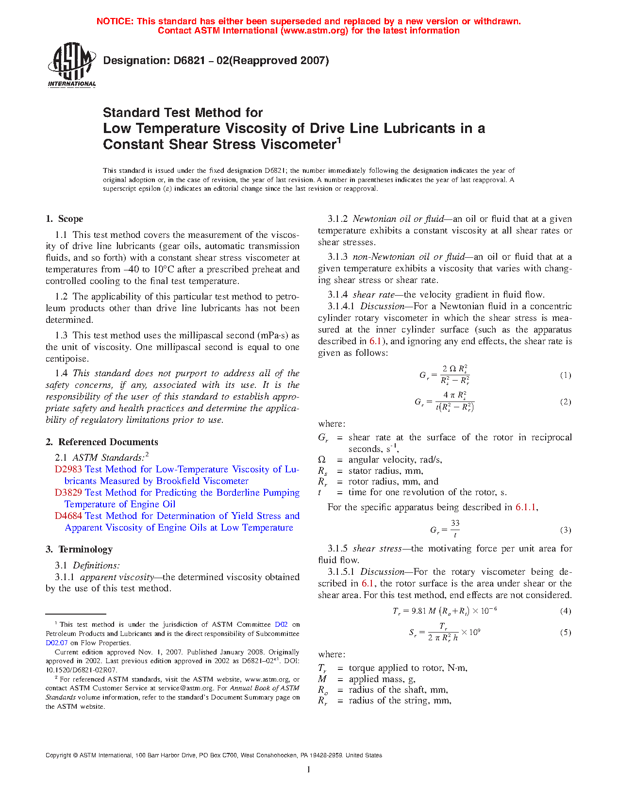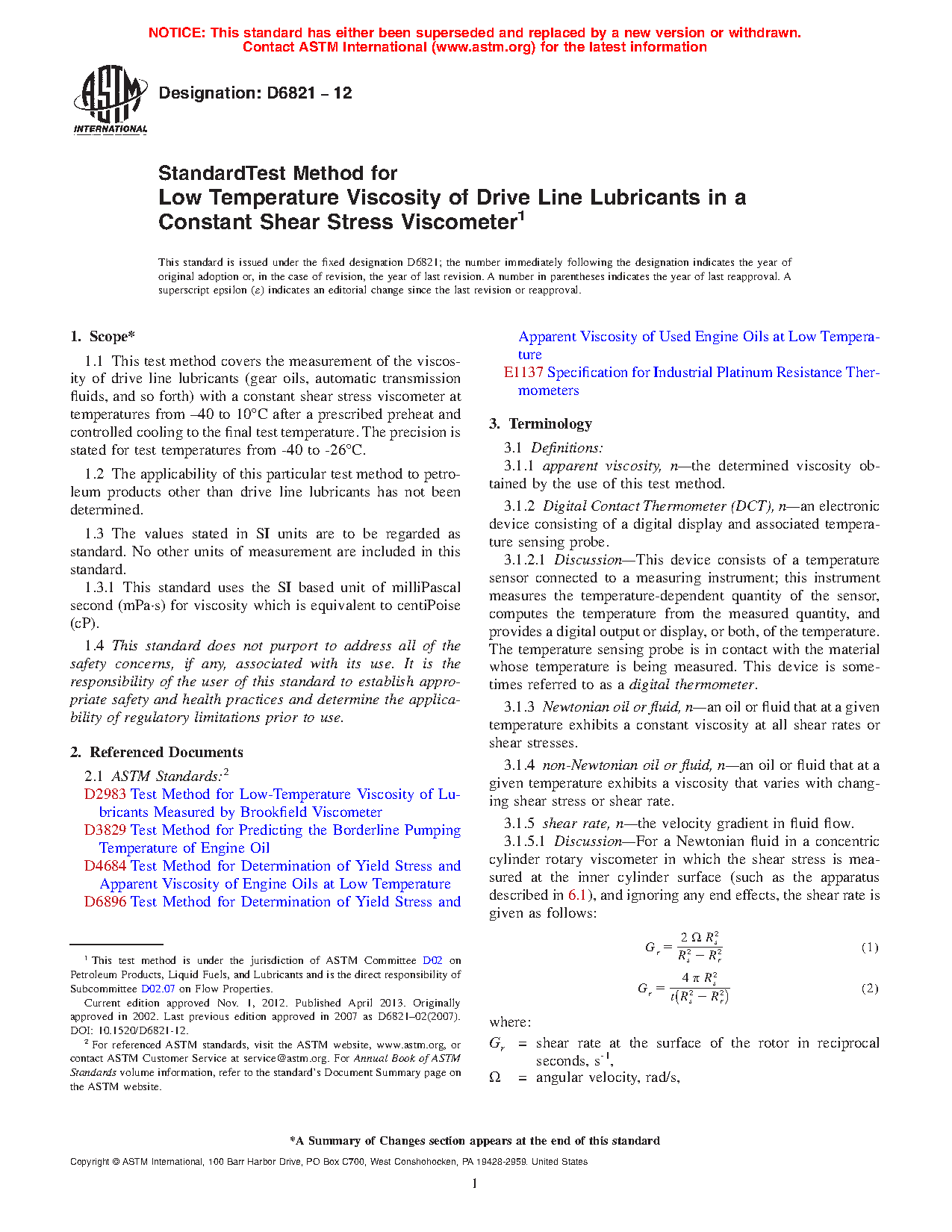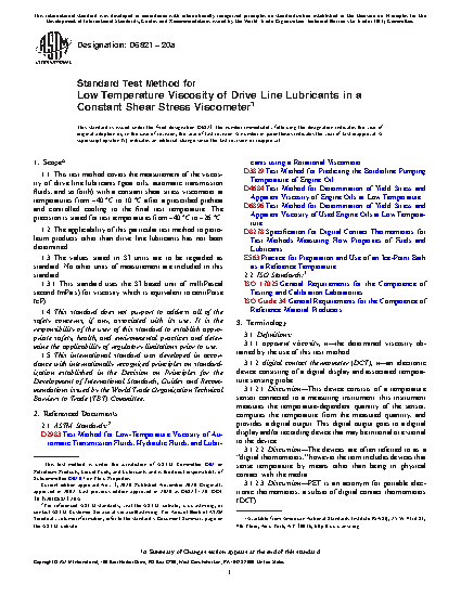 1.1 This test method covers the measurement of the viscosity of drive line lubricants (gear oils, automatic transmission fluids, and so forth) with a constant shear stress viscometer at temperatures from –40 °C to 10 °C after a prescribed preheat and controlled cooling to the final test temperature. The precision is stated for test temperatures from –40 °C to –26 °C.