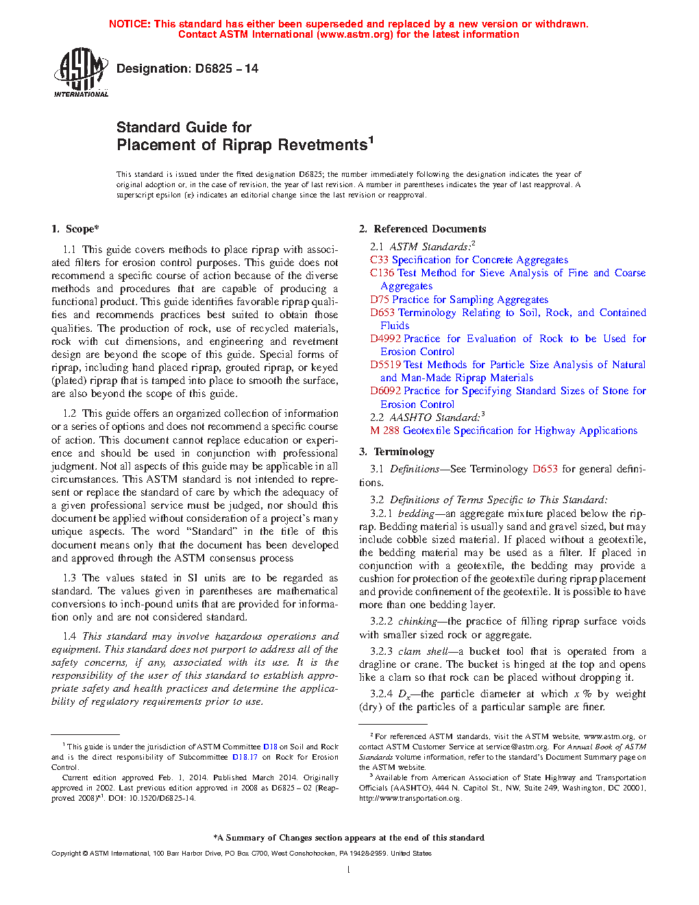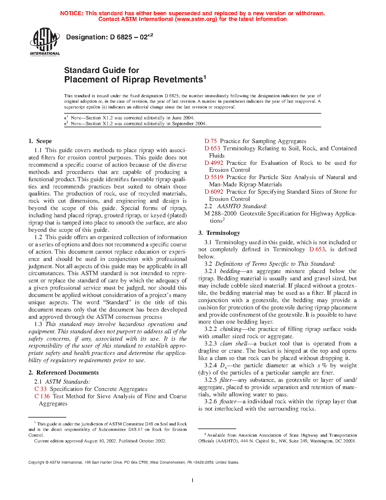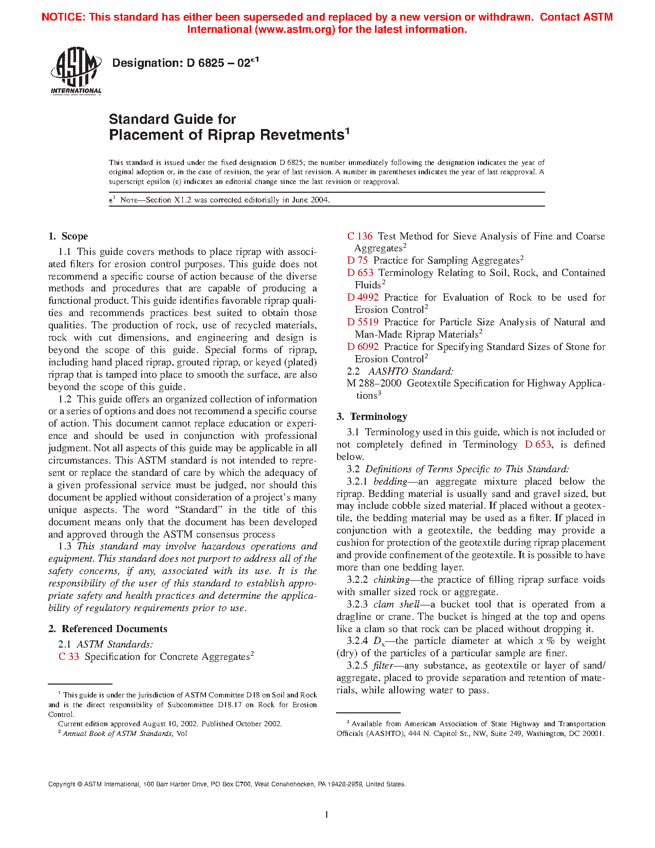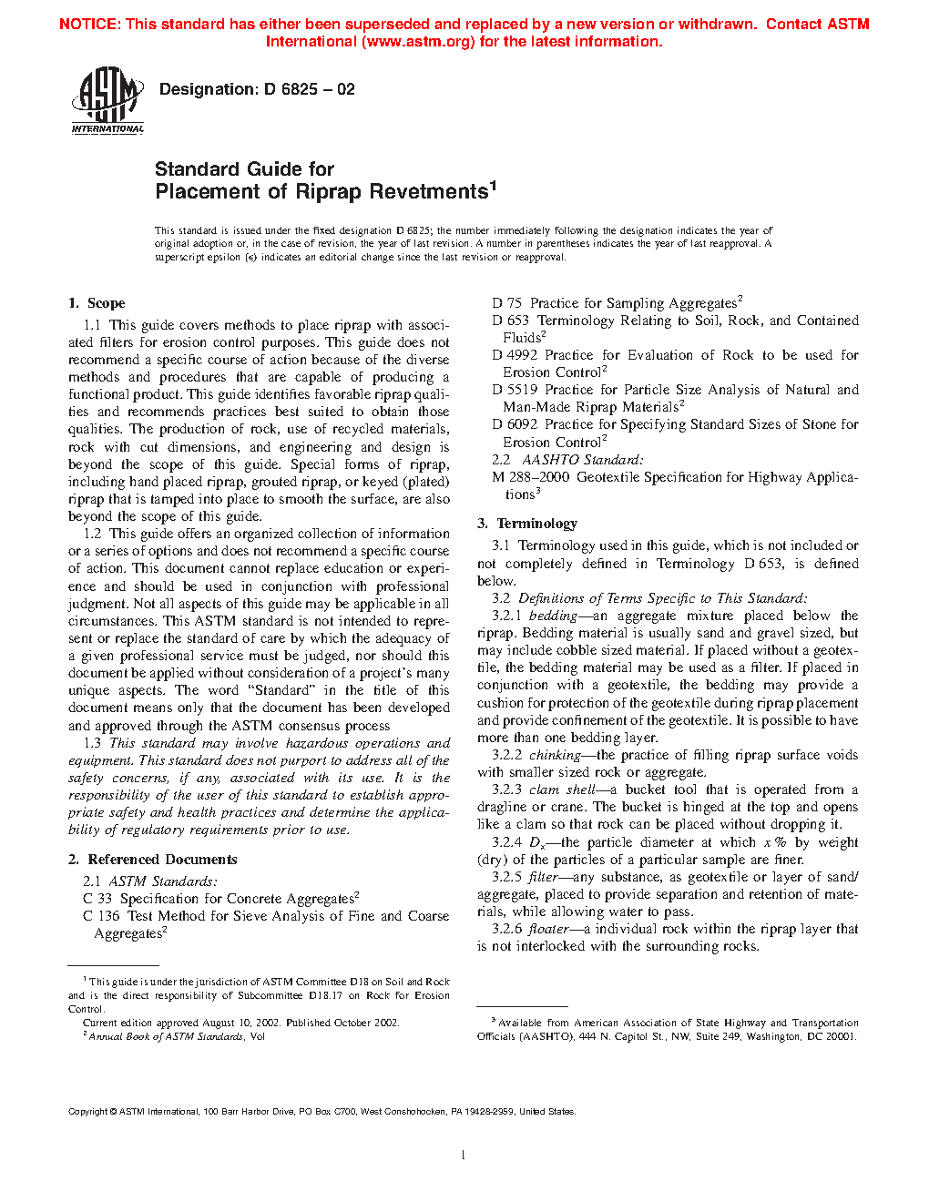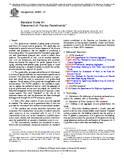 1.1 This guide covers methods to place riprap with associated filters for erosion control purposes. This guide does not recommend a specific course of action because of the diverse methods and procedures that are capable of producing a functional product. This guide identifies favorable riprap qualities and recommends practices best suited to obtain those qualities. The production of rock, use of recycled materials, rock with cut dimensions, and engineering and revetment design are beyond the scope of this guide. Special forms of riprap, including hand placed riprap, grouted riprap, or keyed (plated) riprap that is tamped into place to smooth the surface, are also beyond the scope of this guide.