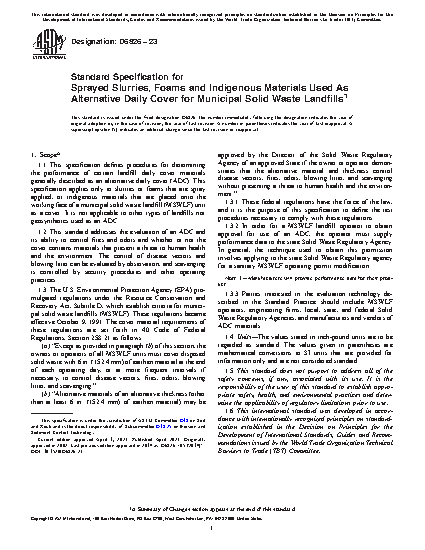 1.1 This specification defines procedures for determining the performance of certain landfill daily cover materials generally described as an alternative daily cover (ADC). This specification applies only to slurries that are sprayed, foams that are spray applied, or indigenous materials that are placed onto the working face of a Municipal Solid Waste Landfill (MSWLF) unit as a cover. It is not applicable to other types of landfills. It does not apply to geosynthetics used as an ADC.
