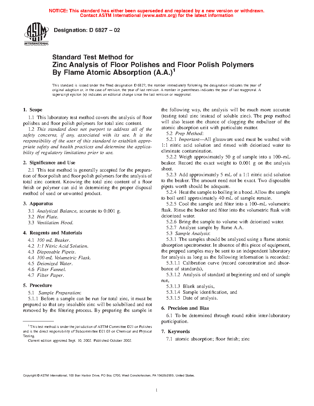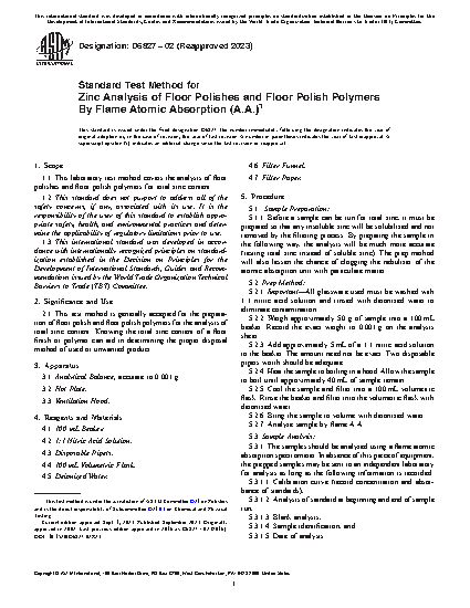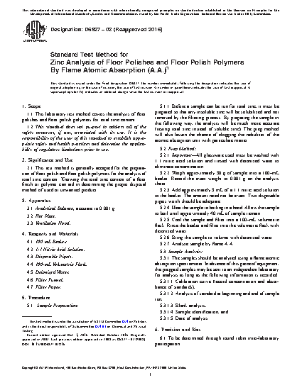 2.1 This test method is generally accepted for the preparation of floor polish and floor polish polymers for the analysis of total zinc content. Knowing the total zinc content of a floor finish or polymer can aid in determining the proper disposal method of used or unwanted product.