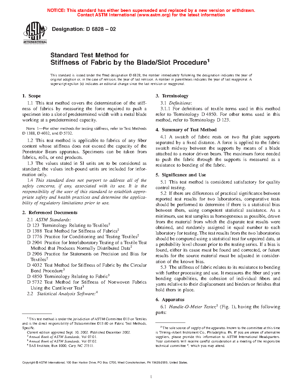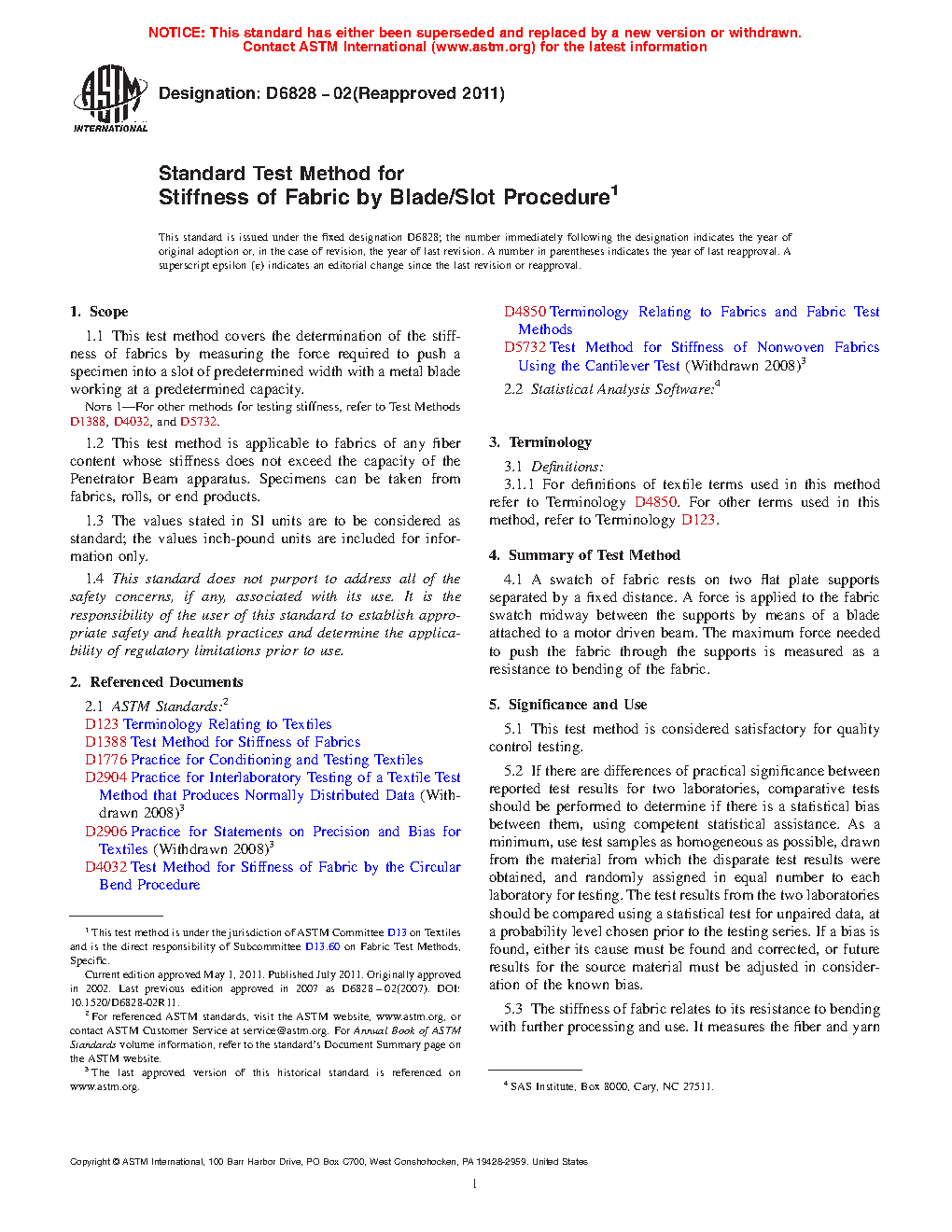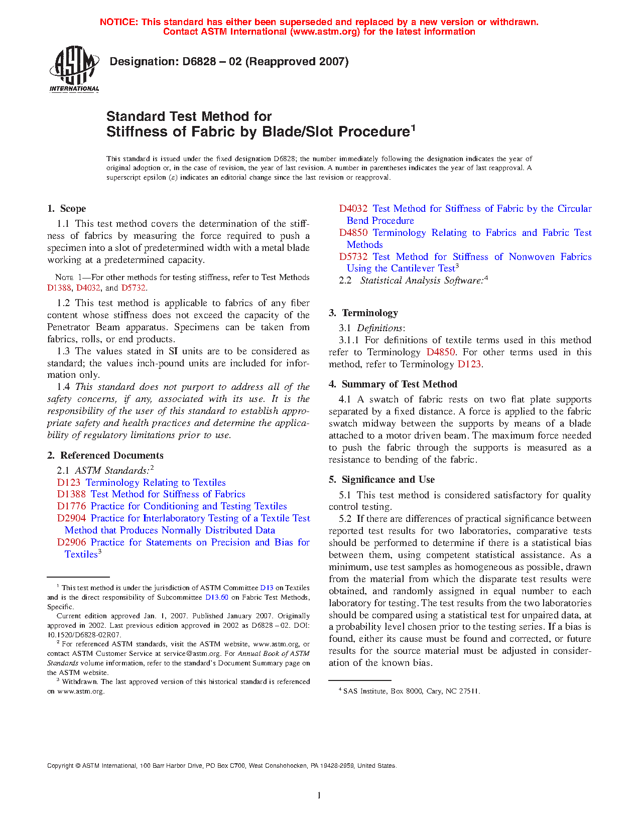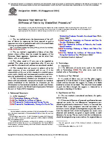1.1 This test method covers the determination of the stiffness of fabrics by measuring the force required to push a specimen into a slot of predetermined width with a metal blade working at a predetermined capacity.
