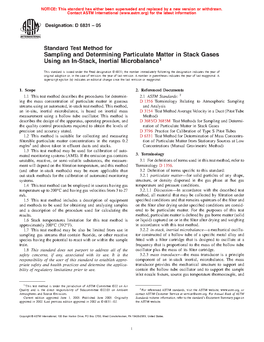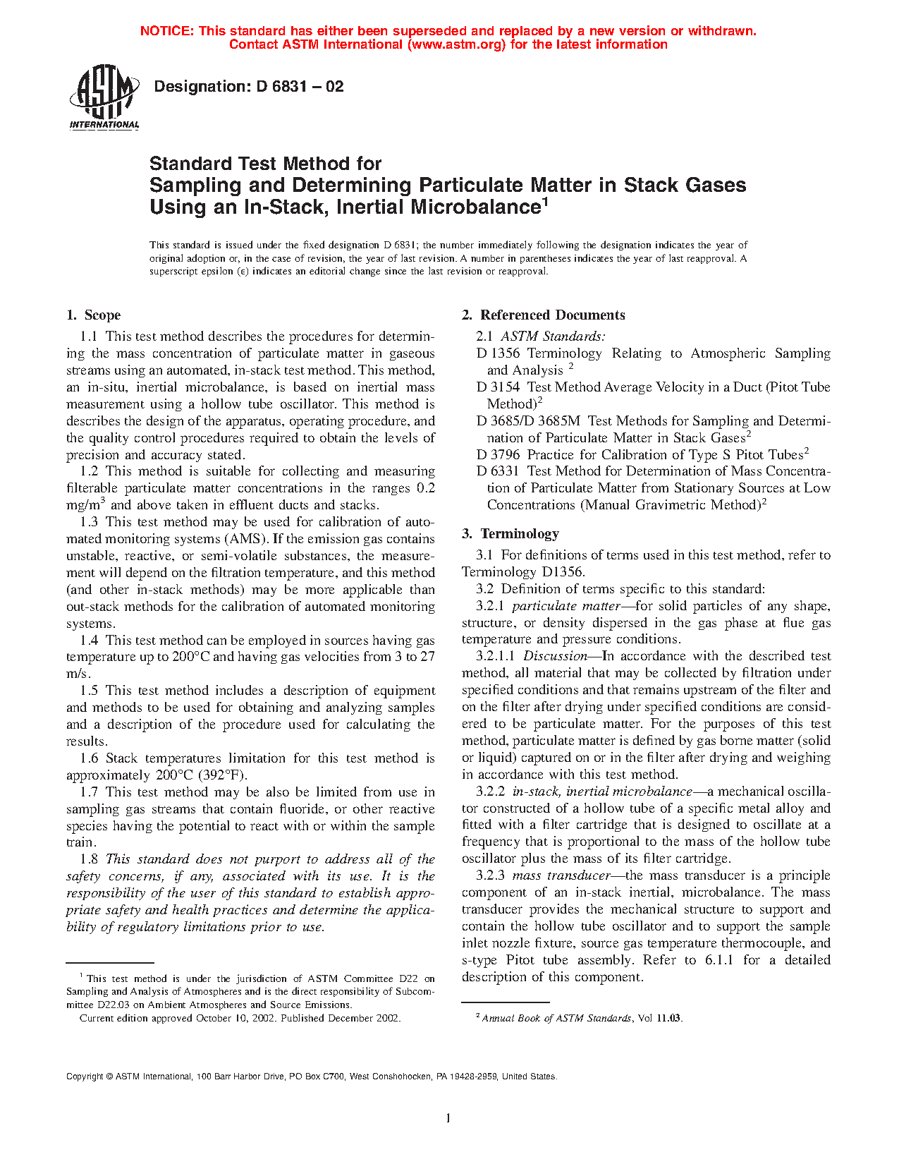 1.1 This test method describes procedures for determining the mass concentration of particulate matter in gaseous streams using an automated, in-stack test procedure. This test method, which employs an in-situ, inertial microbalance, is based on inertial mass measurement using a hollow tube oscillator. This test method describes the design of the apparatus, operating procedure, and the quality control procedures required to obtain results of a known precision and accuracy.