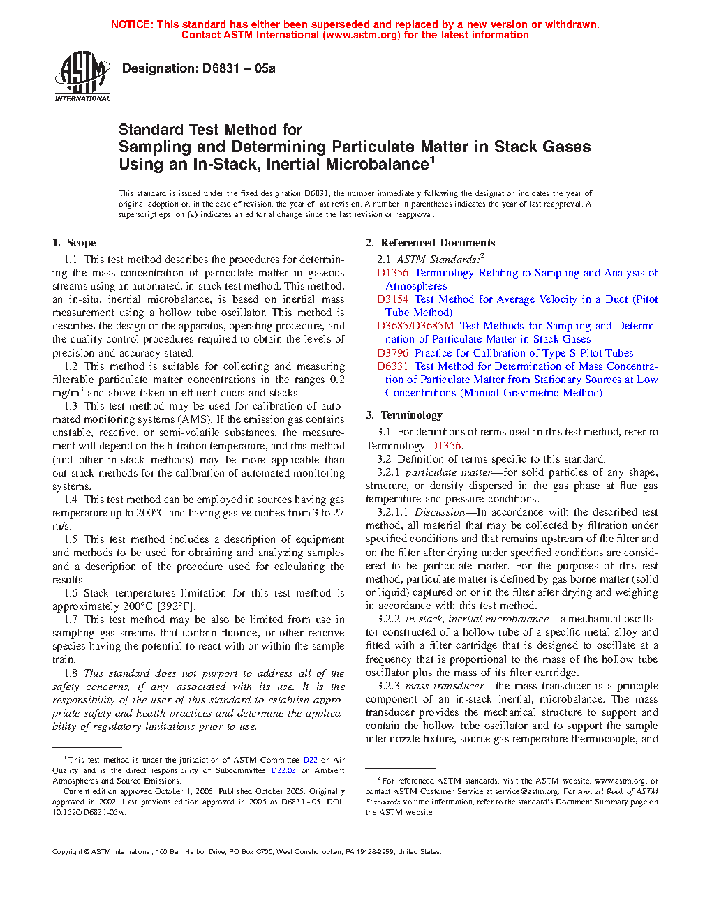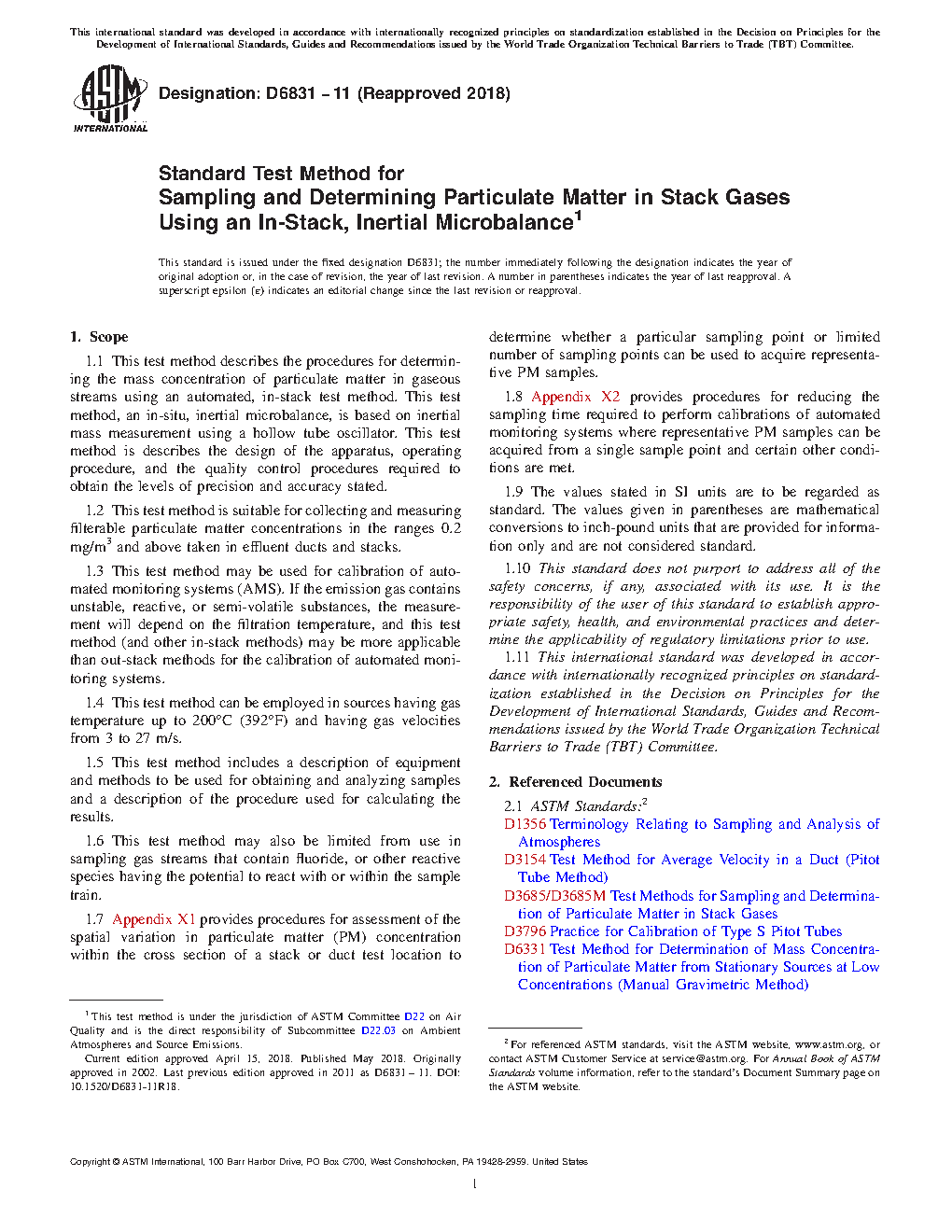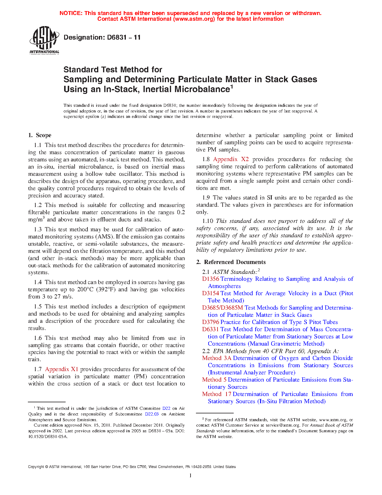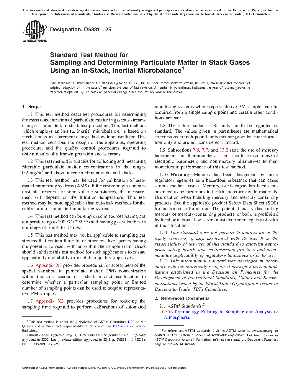 1.9 Subsections 7.6, 7.7, and 13.2 state the use of mercury barometers and thermometers. Users should consider use of electronic barometers and non-mercury alternatives to thermometers in performance of this test method.