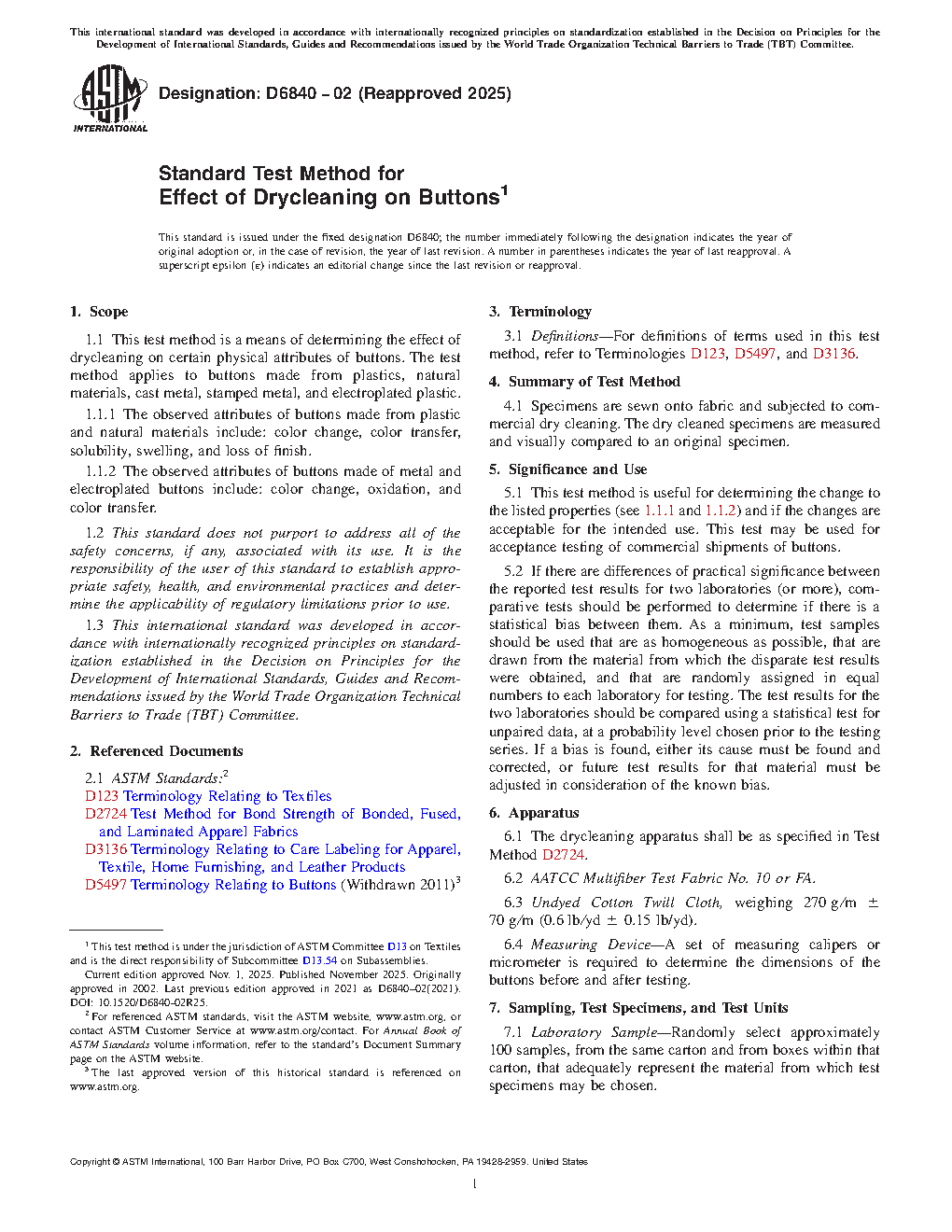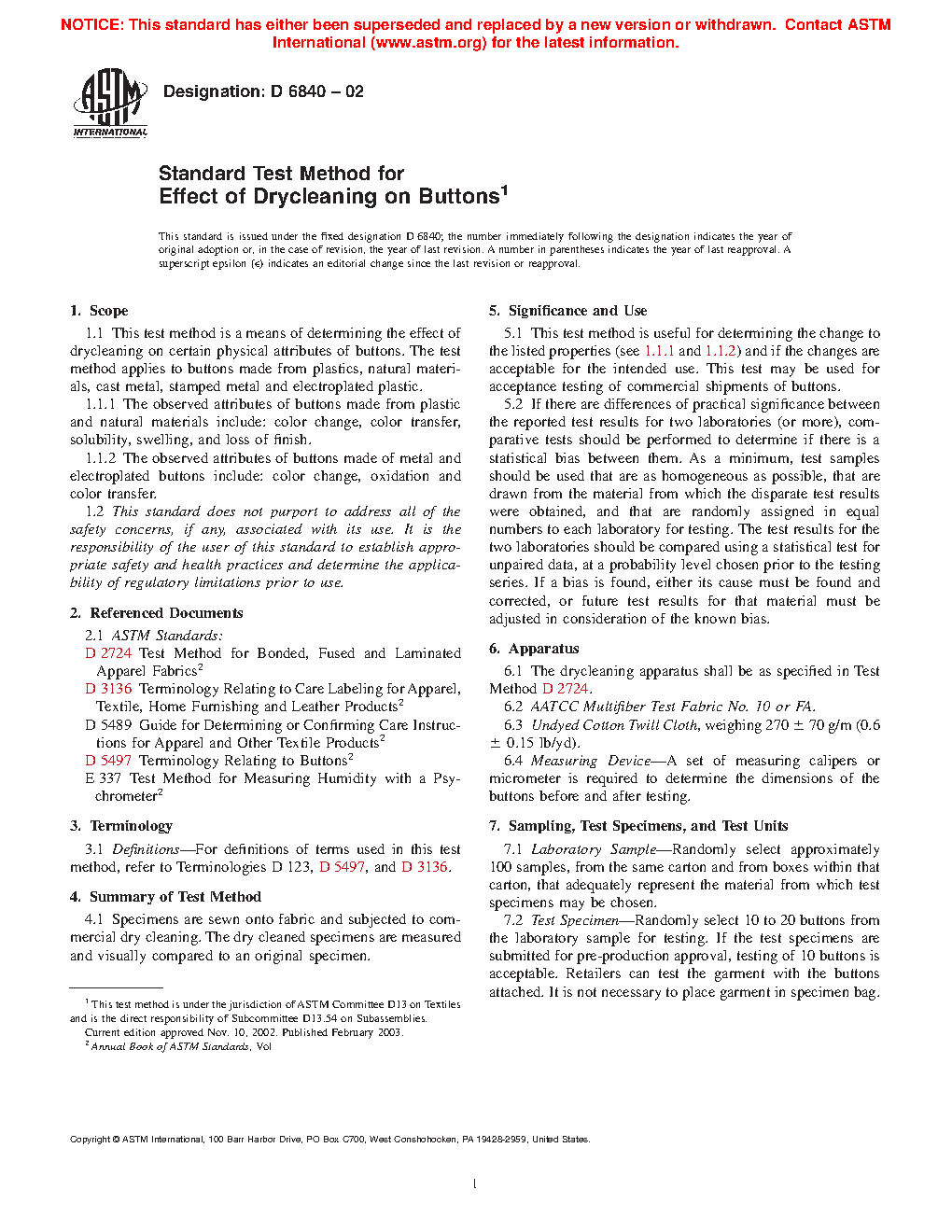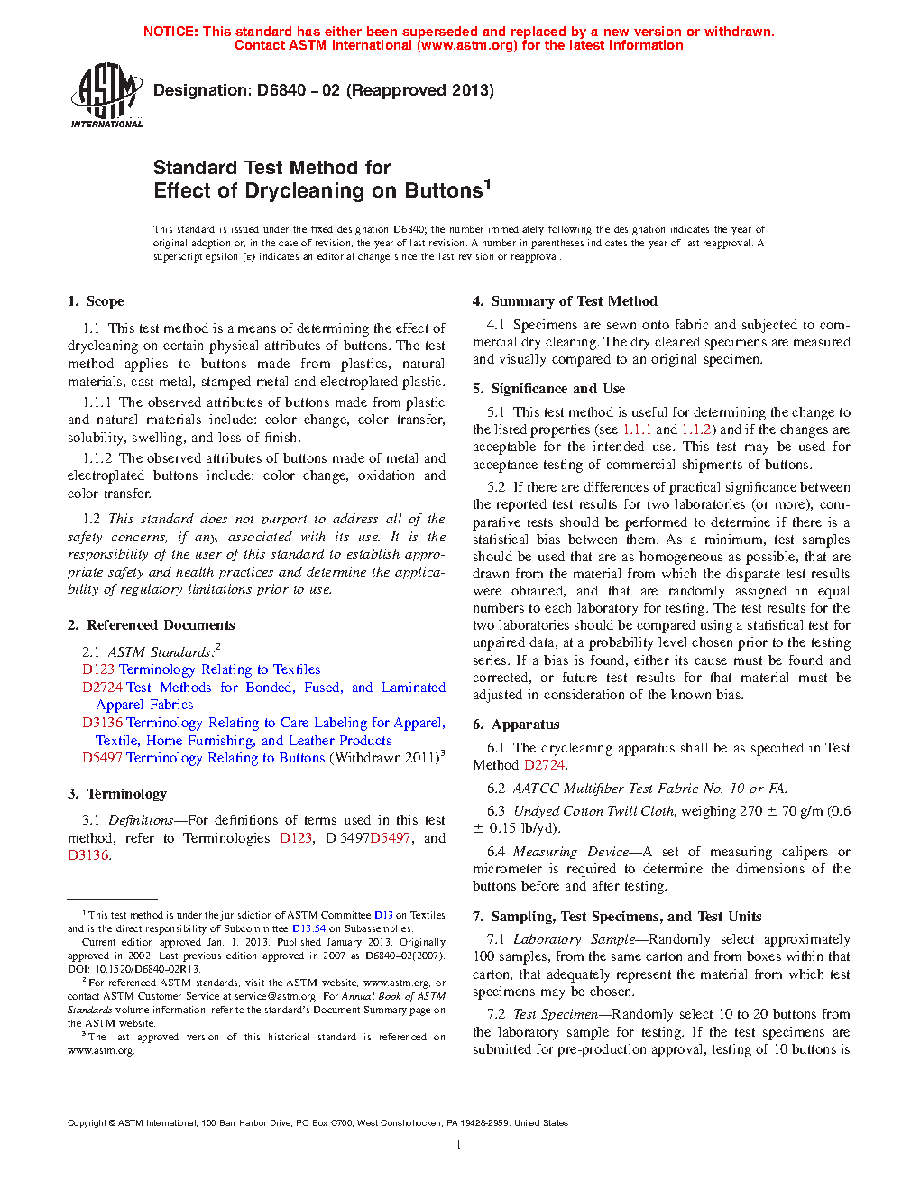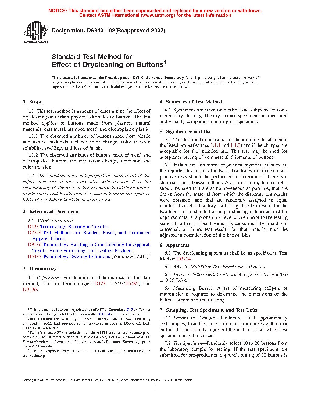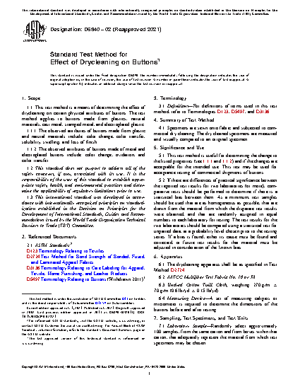 1.1 This test method is a means of determining the effect of drycleaning on certain physical attributes of buttons. The test method applies to buttons made from plastics, natural materials, cast metal, stamped metal, and electroplated plastic.