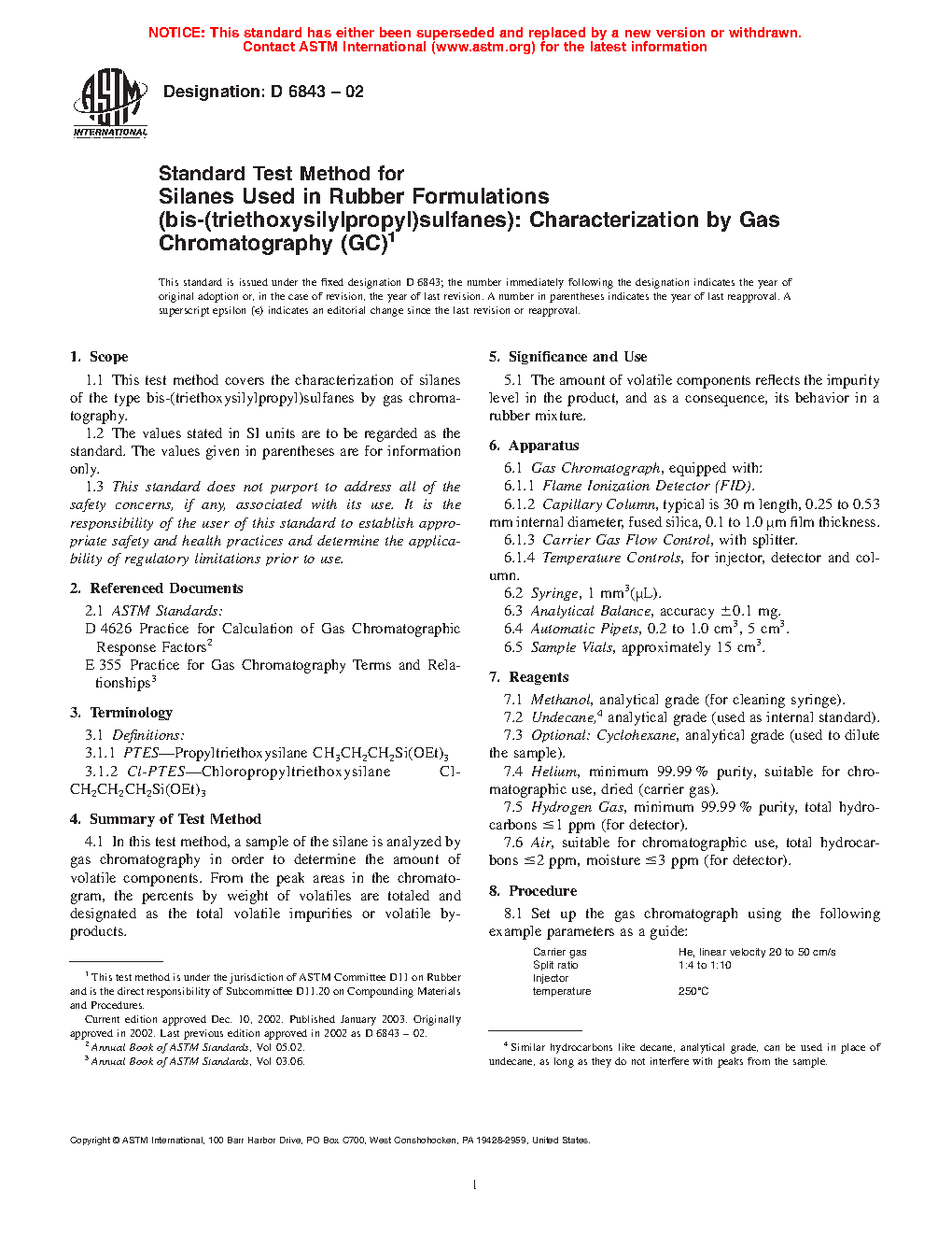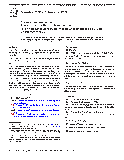 Standard Test Method for Silanes Used in Rubber Formulations (bis-(triethoxysilylpropyl)sulfanes): Characterization by Gas Chromatography (GC)