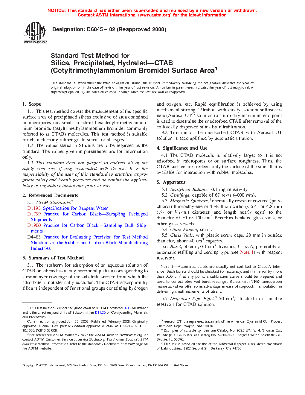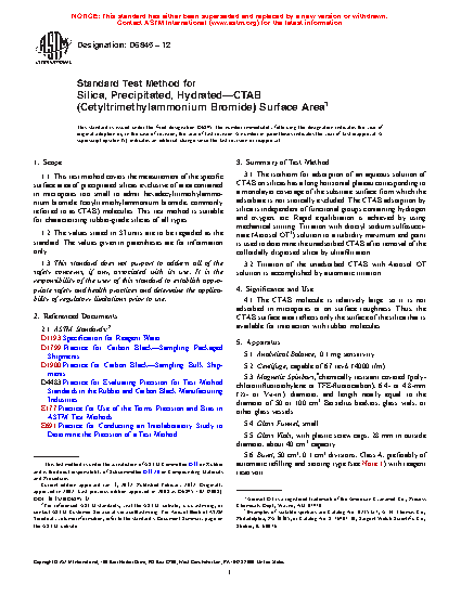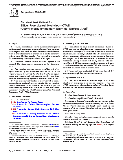 1.1 This test method covers the measurement of the specific surface area of precipitated silicas exclusive of area contained in micropores too small to admit hexadecyltrimethylammonium bromide (cetyltrimethylammonium bromide, commonly referred to as CTAB) molecules. This test method is suitable for characterizing rubber-grade silicas of all types.