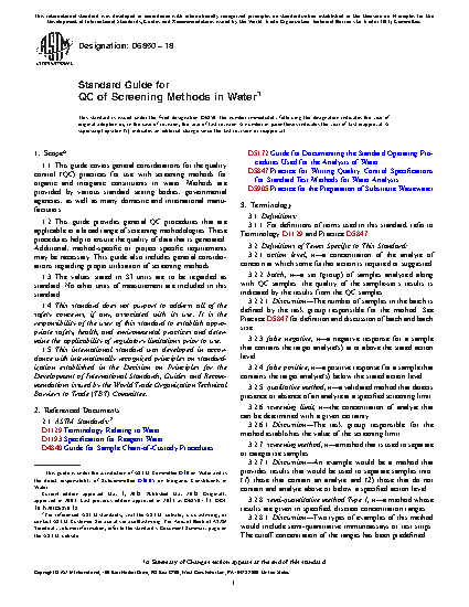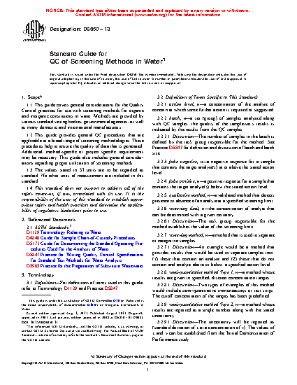 1.1 This guide covers general considerations for the quality control (QC) practices for use with screening methods for organic and inorganic constituents in water. Methods are provided by various standard setting bodies, governmental agencies, as well as many domestic and international manufacturers.