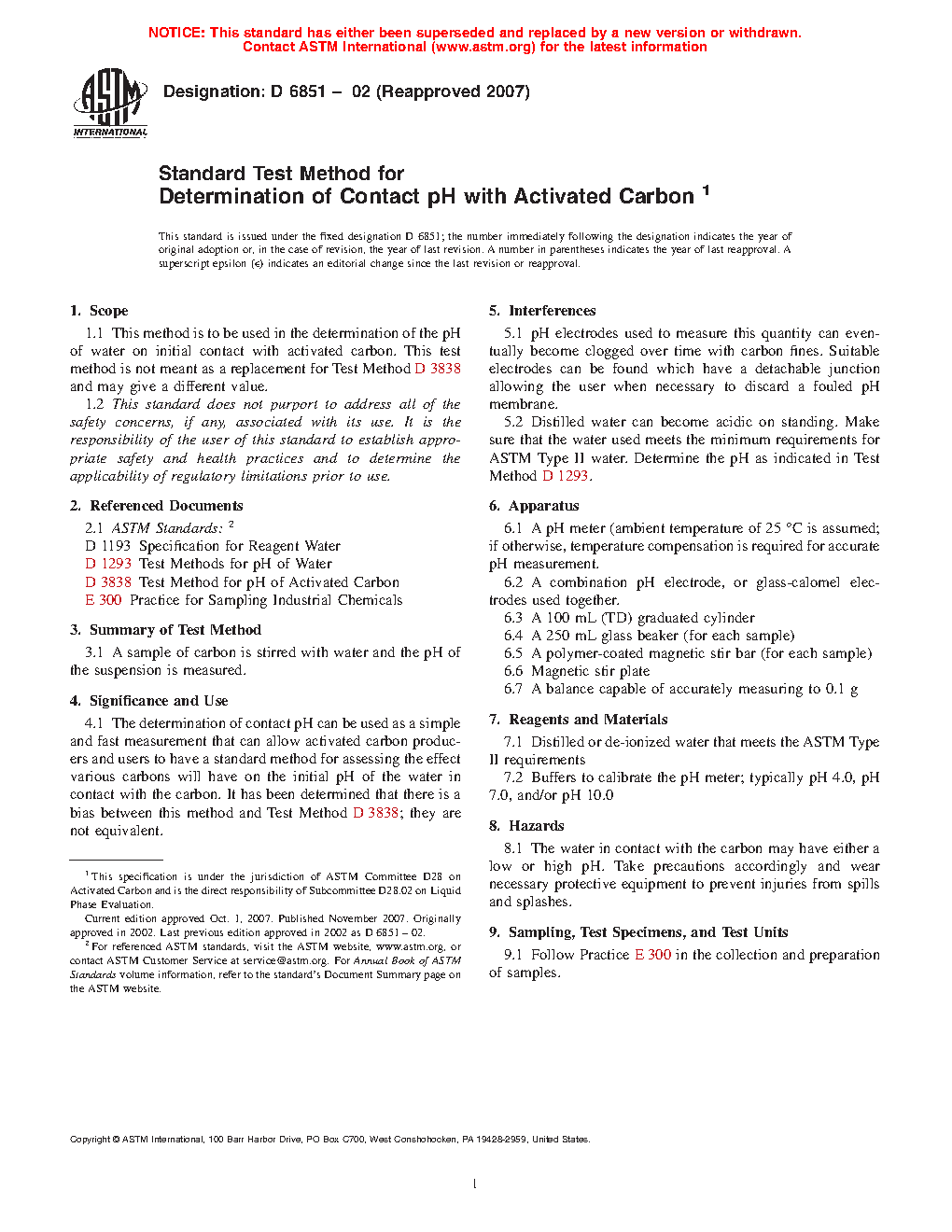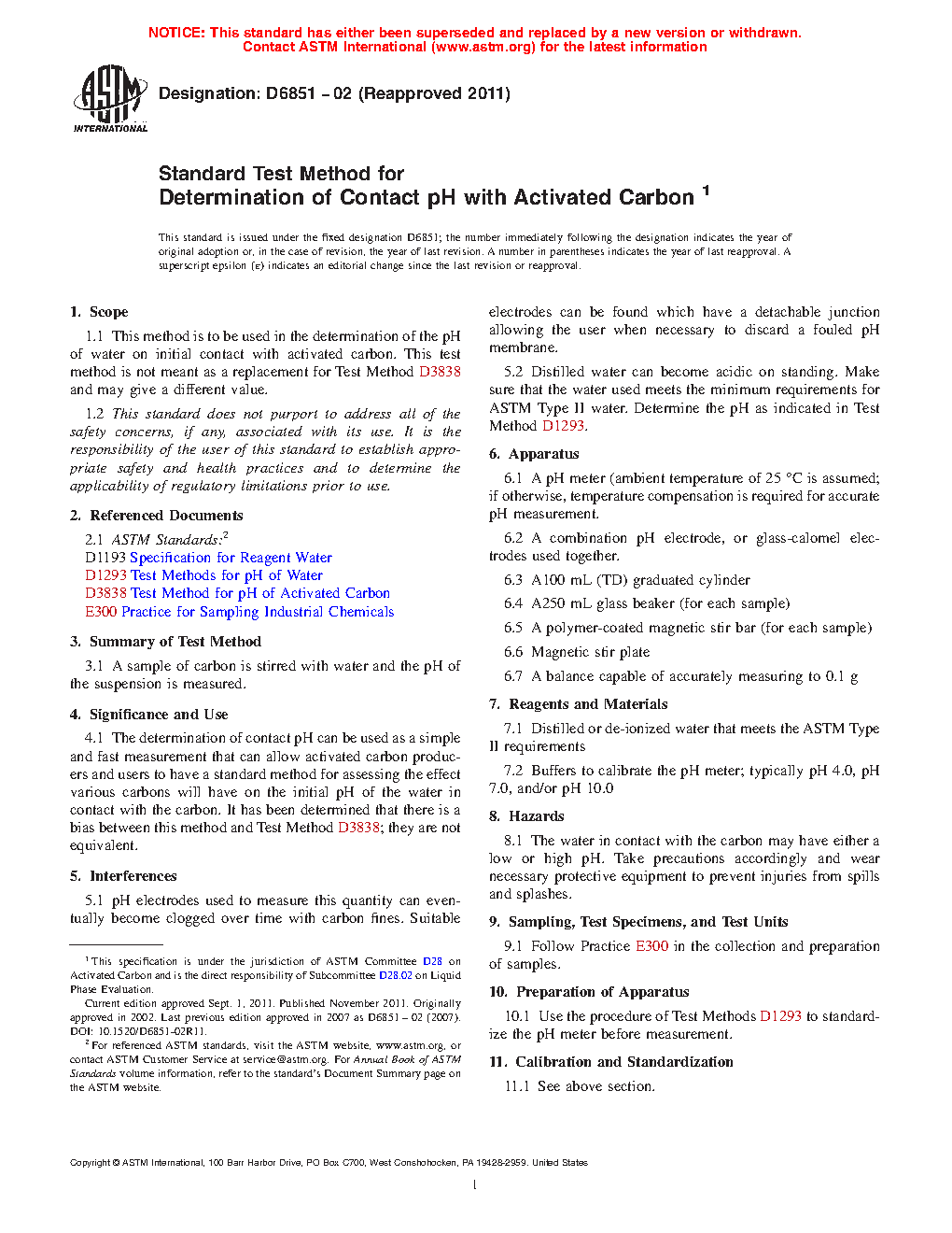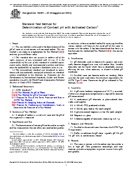 1.1 This method is to be used in the determination of the pH of water on initial contact with activated carbon. This test method is not meant as a replacement for Test Method D 3838 and may give a different value.