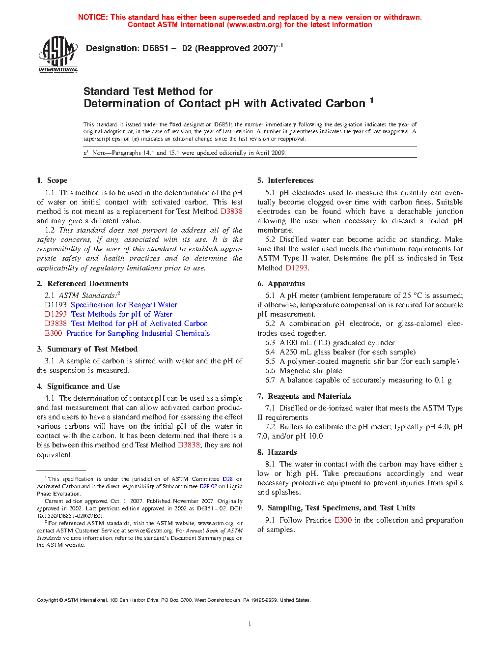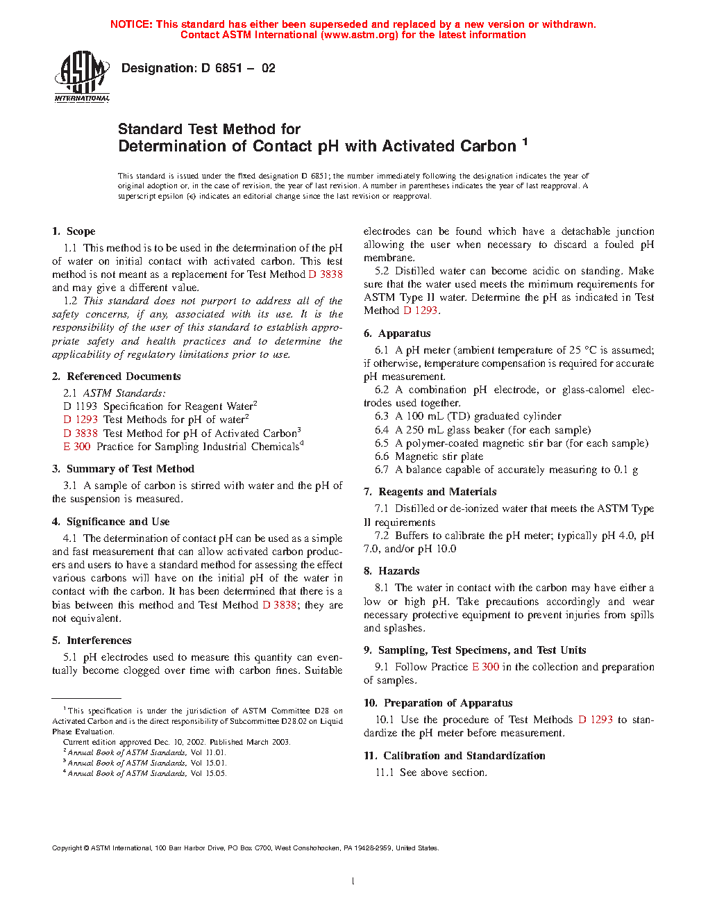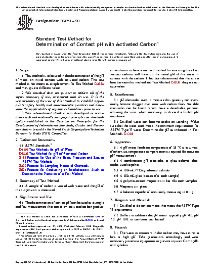 1.1 This method is to be used in the determination of the pH of water on initial contact with activated carbon. This test method is not meant as a replacement for Test Method D3838 and may give a different value.