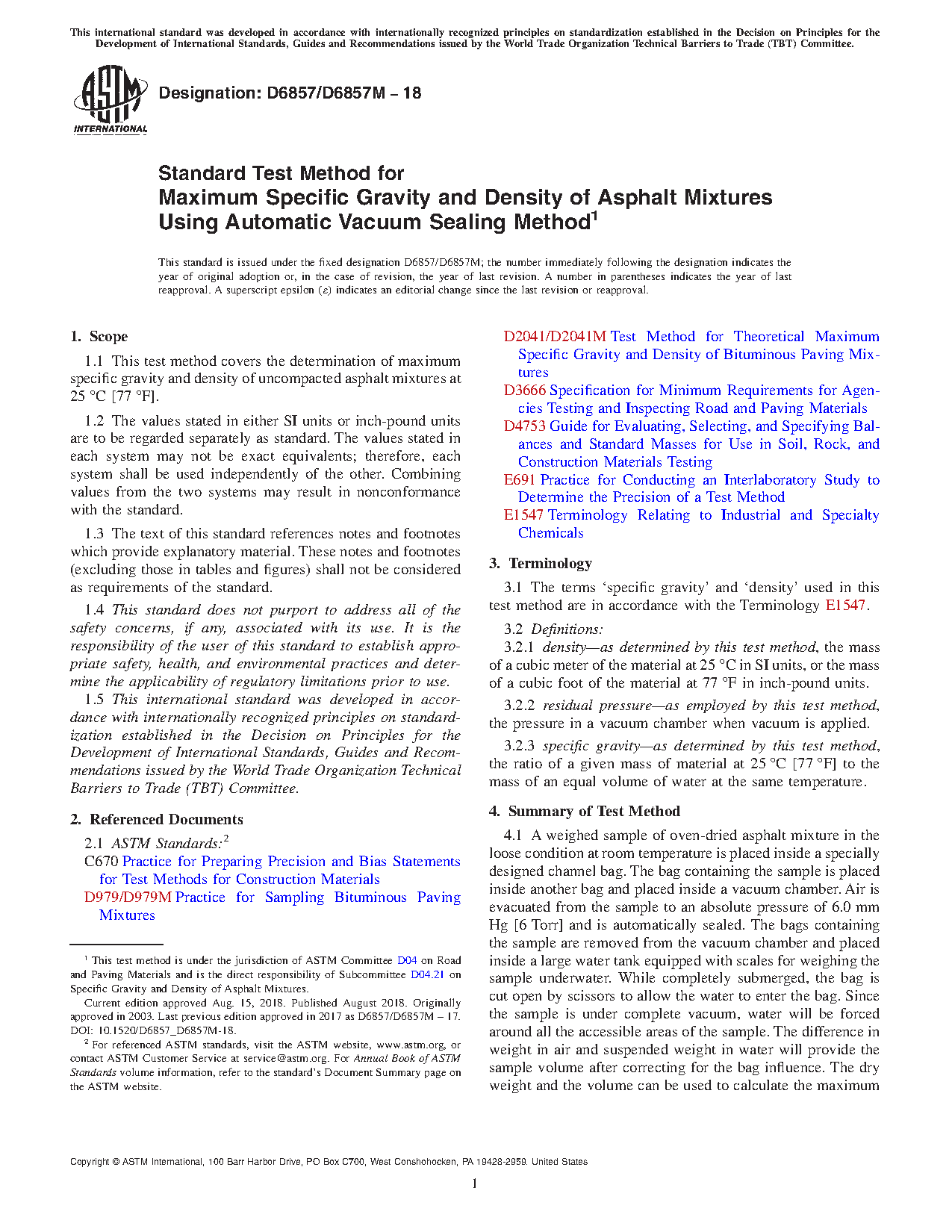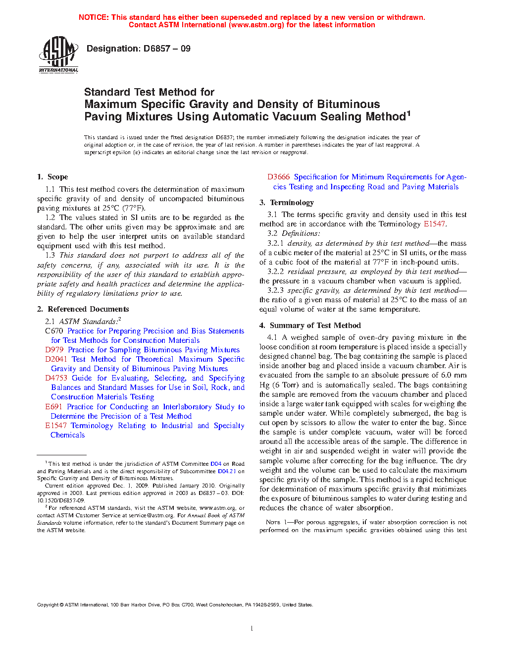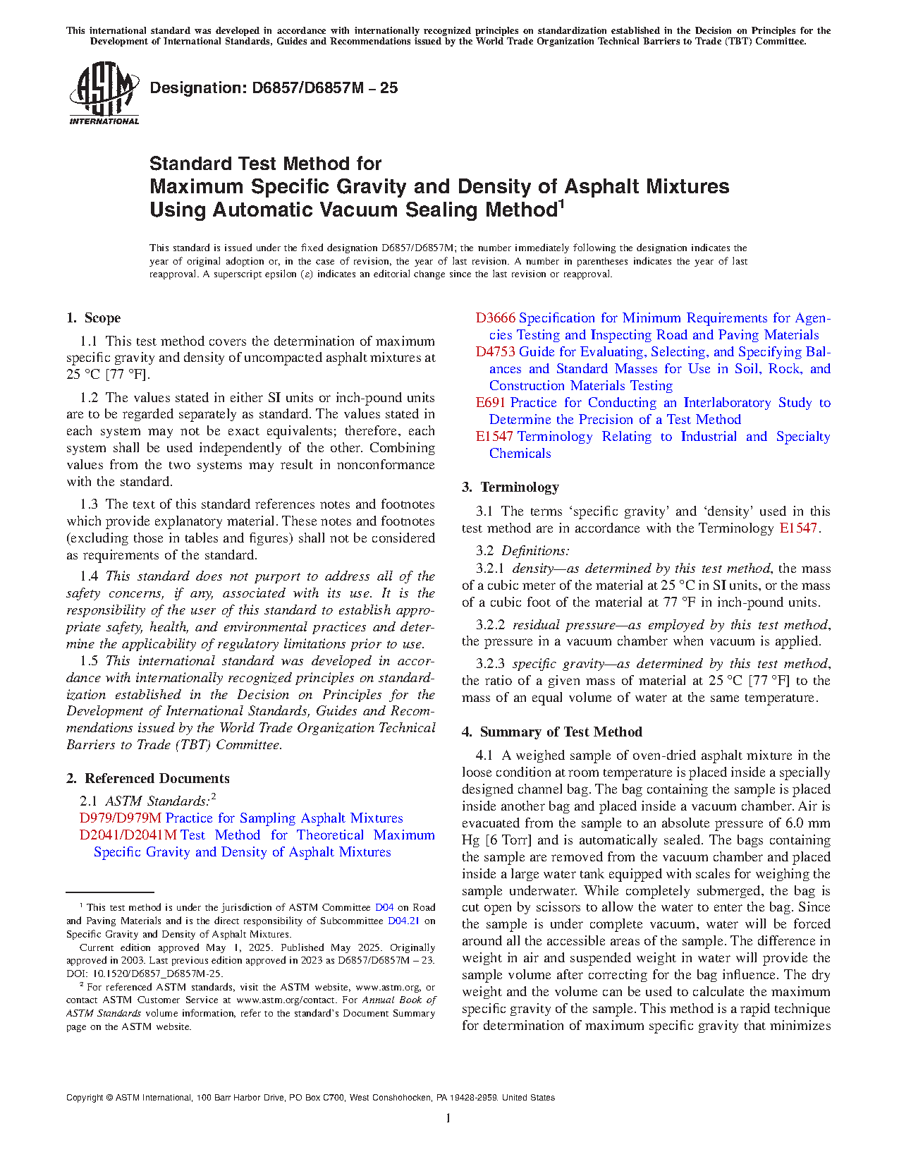 1.1 This test method covers the determination of maximum specific gravity of and density of uncompacted bituminous paving mixtures at 25°C [77°F].
