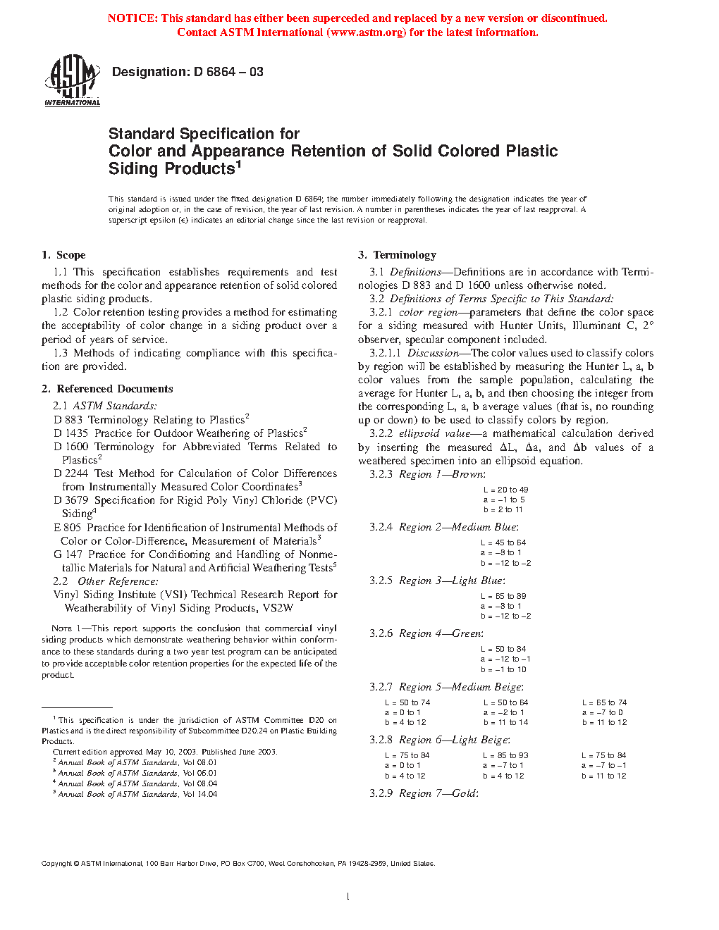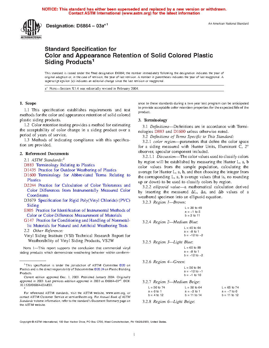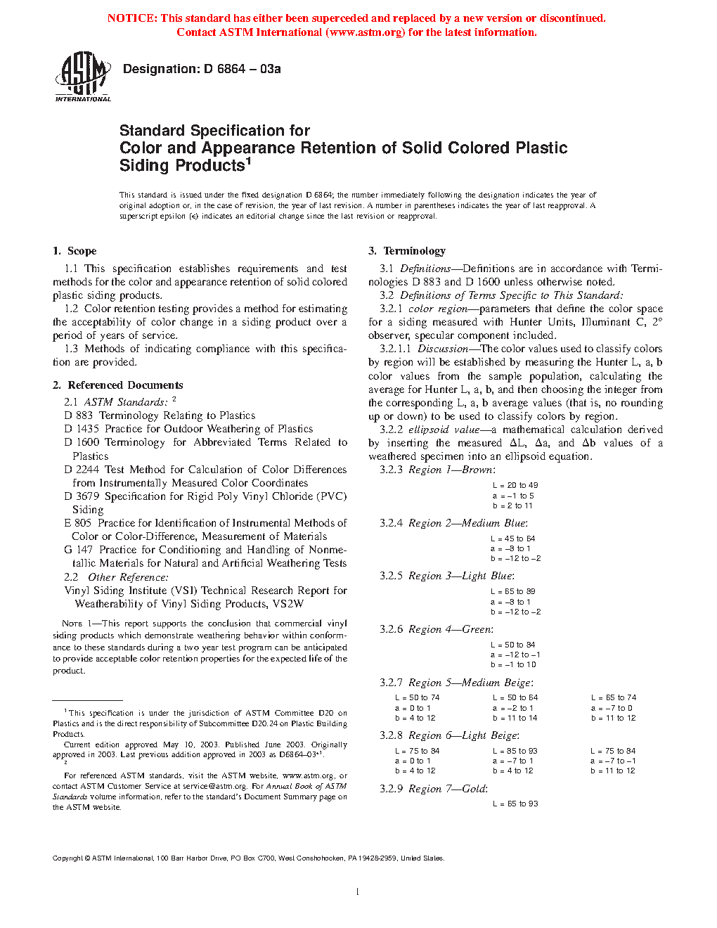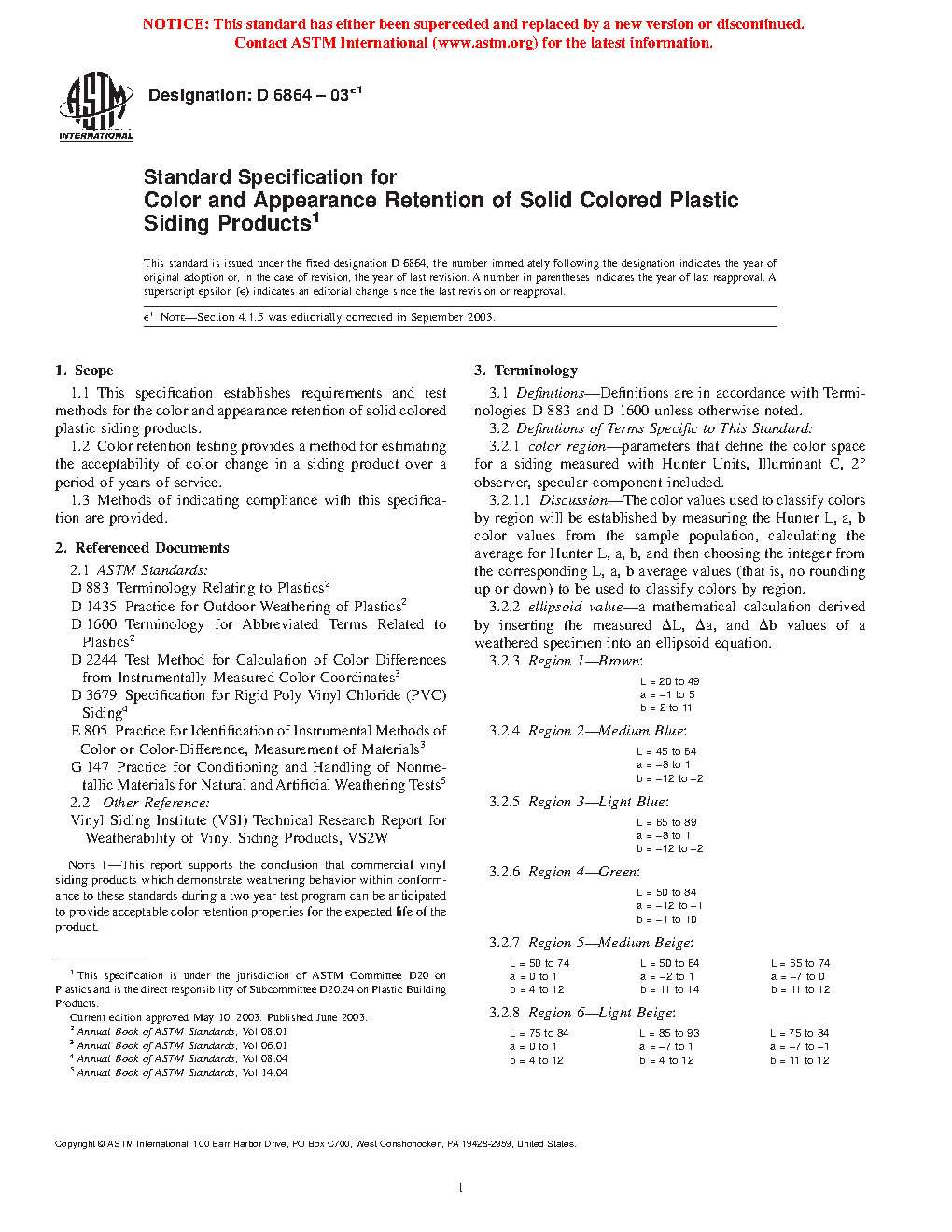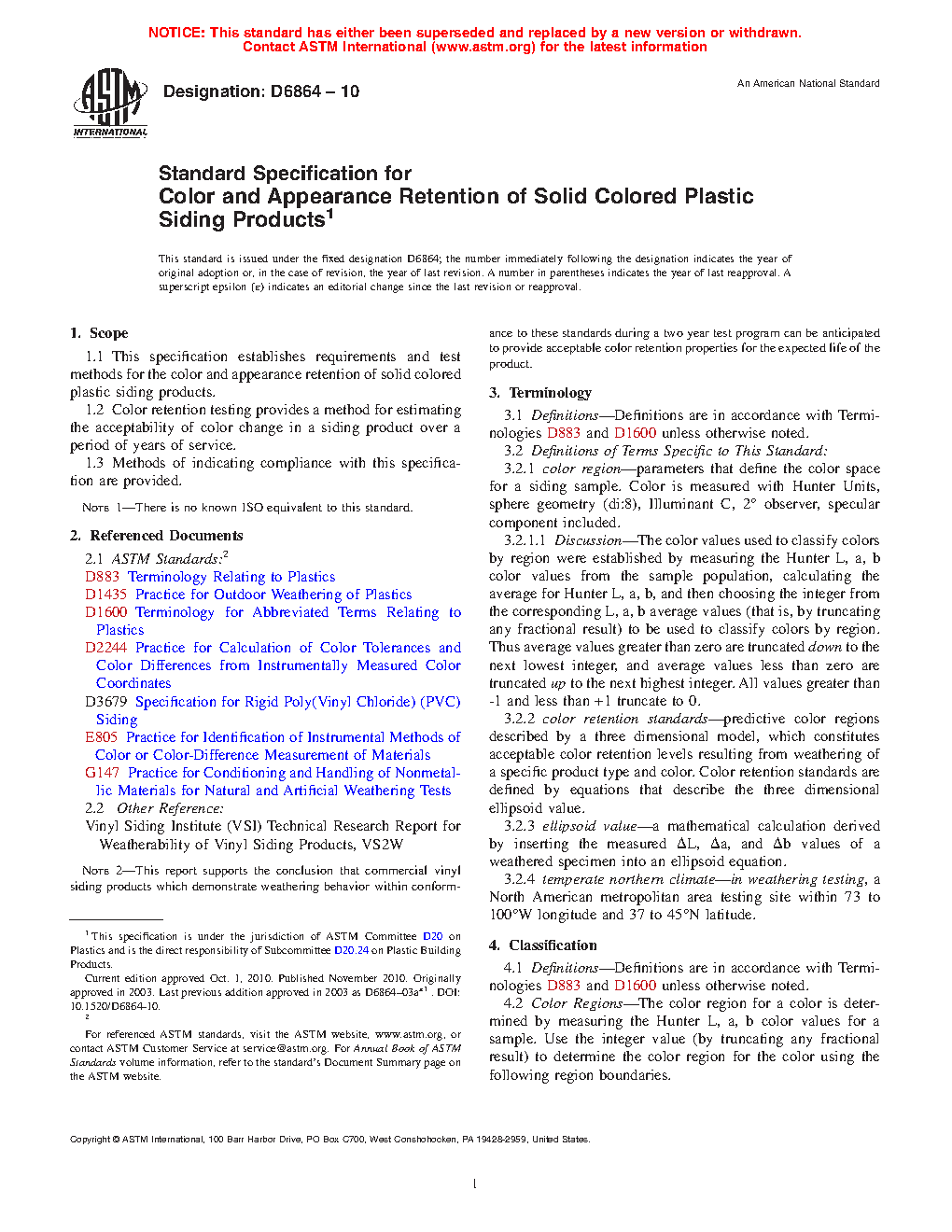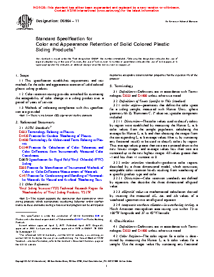 1.1 This specification establishes requirements and test methods for the color and appearance retention of solid colored plastic siding products.