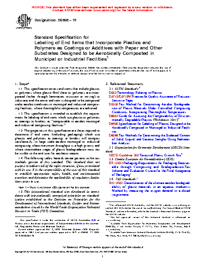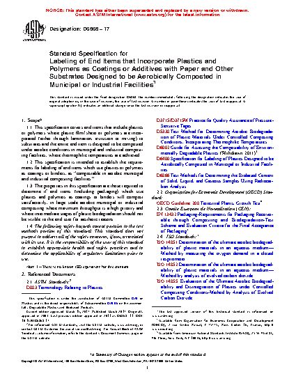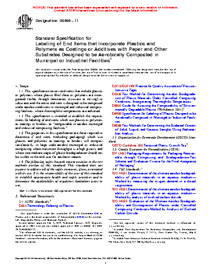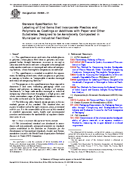 1.2 This specification is intended to establish the requirements for labeling of end items which use plastics or polymers as coatings or binders, as “compostable in aerobic municipal and industrial composting facilities.”
