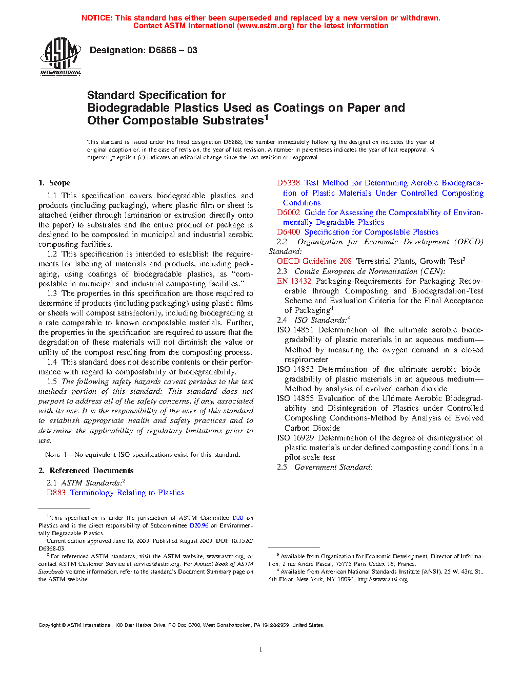 This specification establishes the requirements for labelling of materials and products (including packaging), wherein a biodegradable plastic film or coating is attached (either through lamination or extrusion directly onto the paper) to compostable substrates and the entire product or package is designed to be composted in municipal and industrial aerobic composting facilities. This specification, however, does not describe the contents of the product or their performance with regards to compostability or biodegradability. In order to compost satisfactorily, the product must demonstrate each of the three characteristics as follows: (1) proper disintegration during composting; (2) adequate level of inherent biodegradation; and (3) no adverse impacts on the ability of composts to support plant growth.