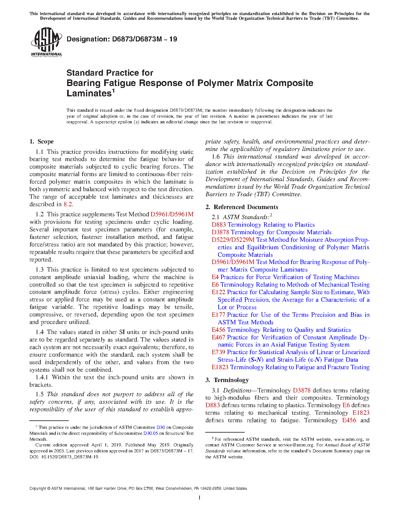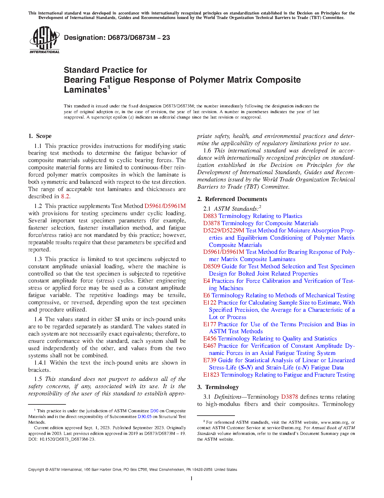 1.2 This practice supplements Test Method D5961/D5961M with provisions for testing specimens under cyclic loading. Several important test specimen parameters (for example, fastener selection, fastener installation method, and fatigue force/stress ratio) are not mandated by this practice; however, repeatable results require that these parameters be specified and reported.