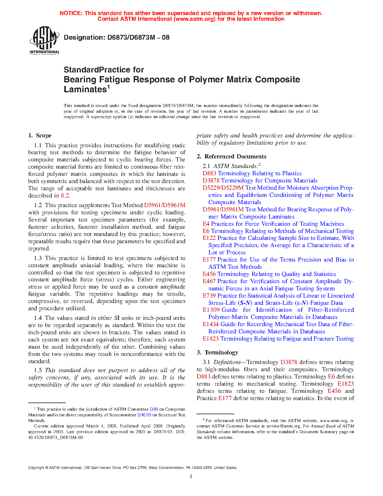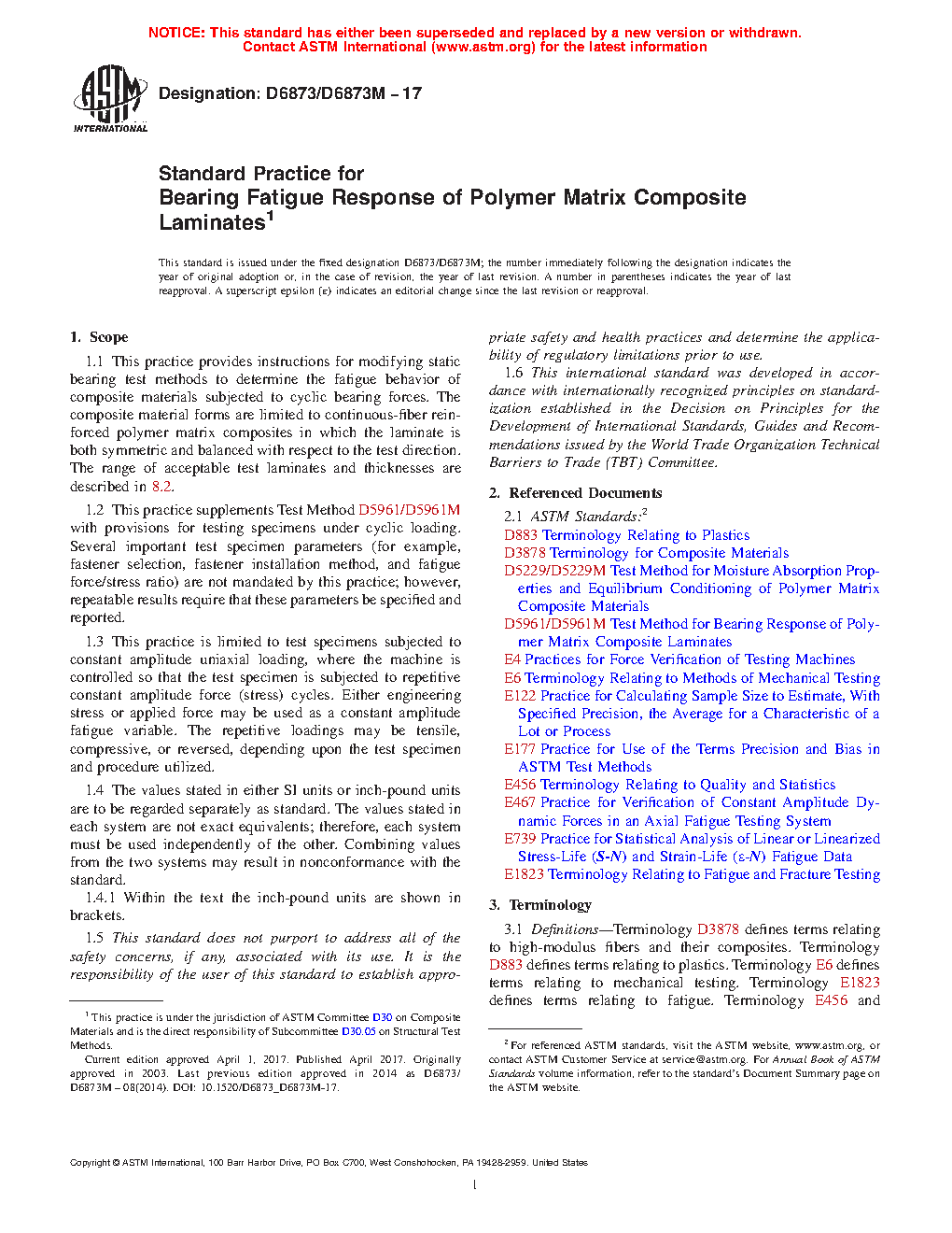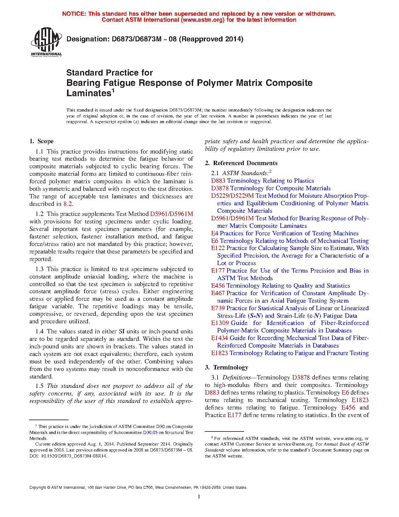 1.1 This practice provides instructions for modifying static bearing test methods to determine the fatigue behavior of composite materials subjected to cyclic bearing forces. The composite material forms are limited to continuous-fiber reinforced polymer matrix composites in which the laminate is both symmetric and balanced with respect to the test direction. The range of acceptable test laminates and thicknesses are described in 8.2.