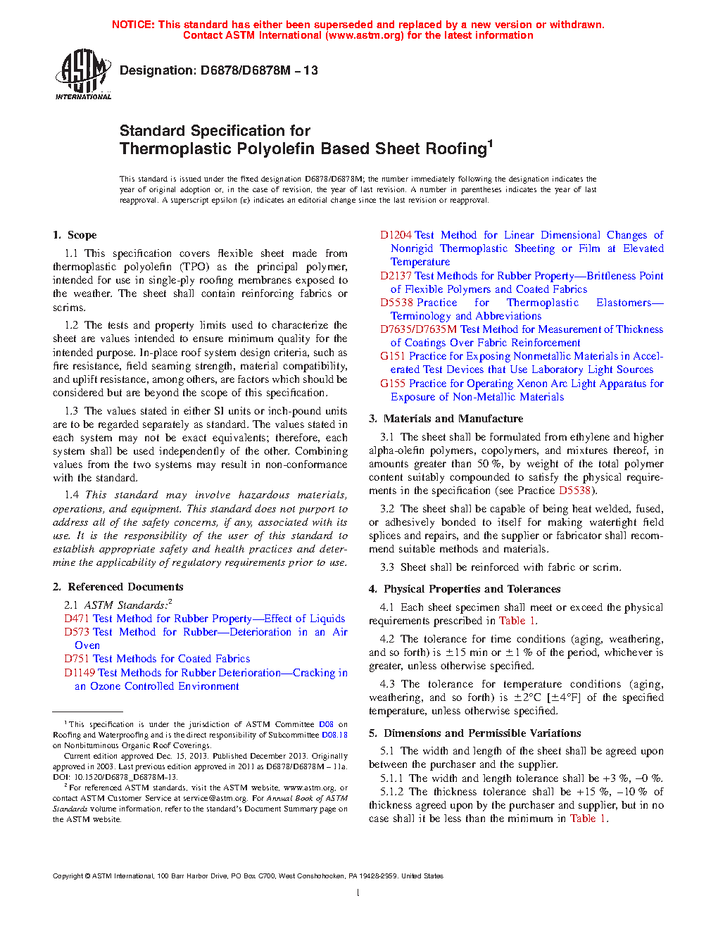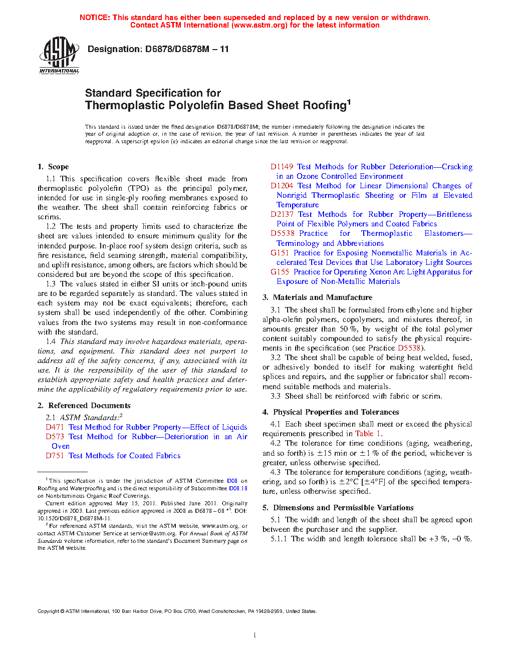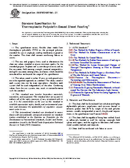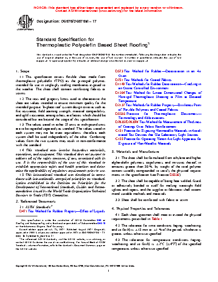 1.1 This specification covers flexible sheet made from thermoplastic polyolefin (TPO) as the principal polymer, intended for use in single-ply roofing membranes exposed to the weather. The sheet shall contain reinforcing fabrics or scrims.