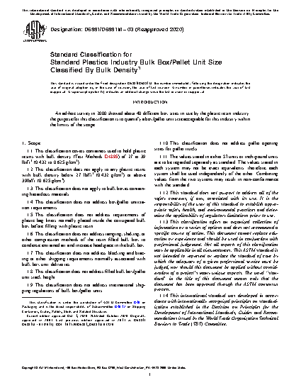 1.1 This classification covers containers used to hold plastic resins with bulk density (Test Methods D1895) of 27 to 39 lb/ft3 (0.432 to 0.625 g/cm3).