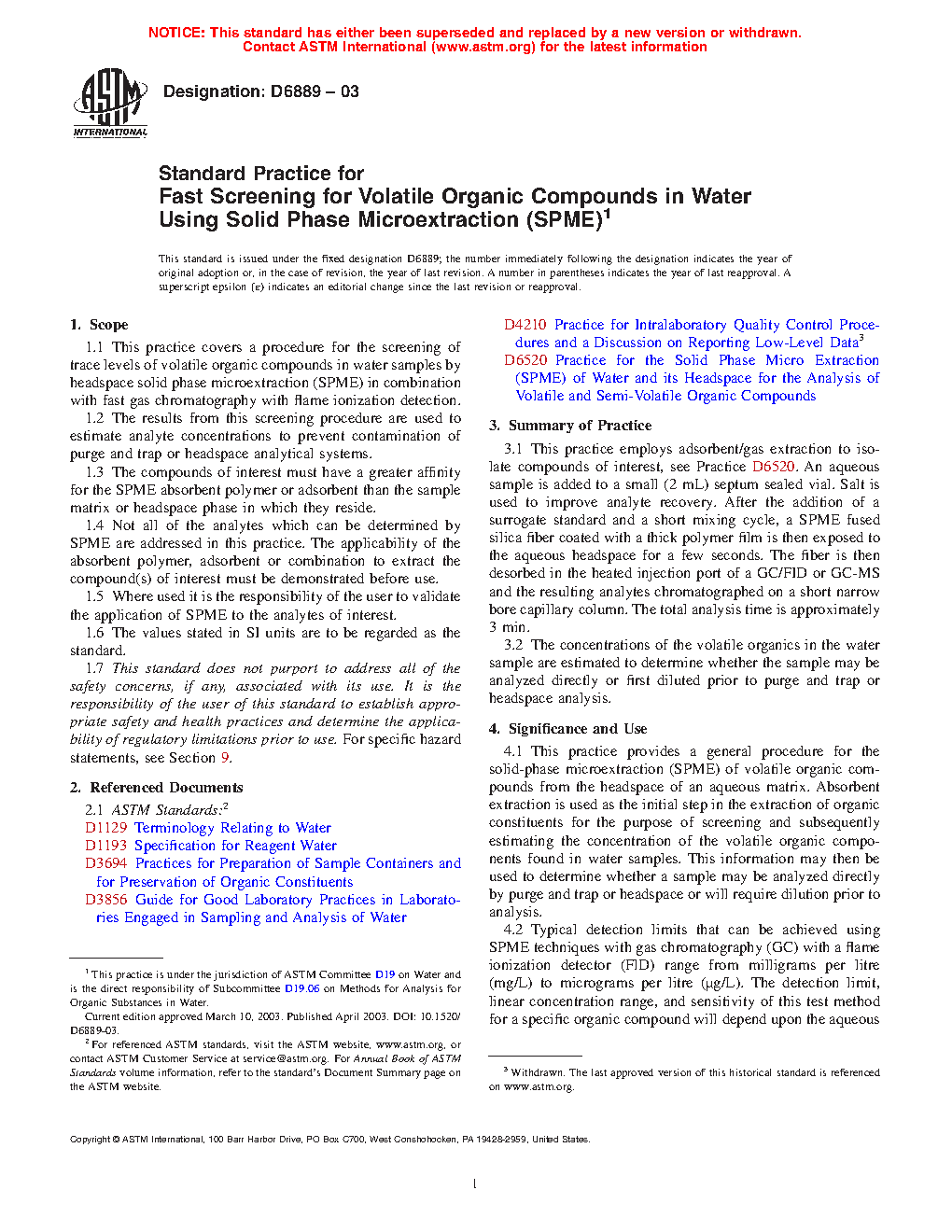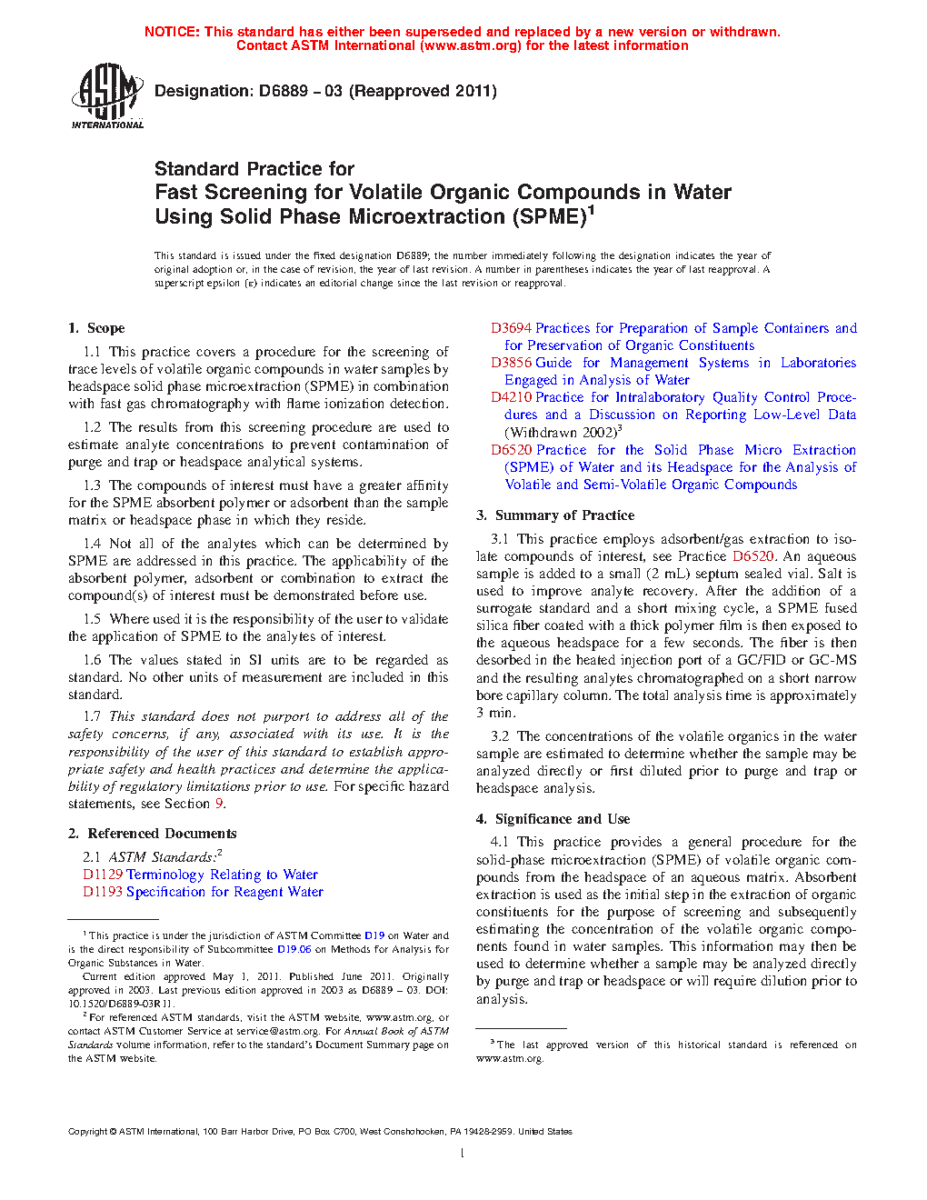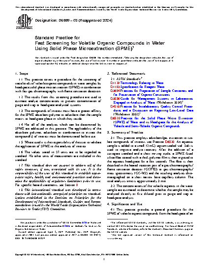 1.1 This practice covers a procedure for the screening of trace levels of volatile organic compounds in water samples by headspace solid phase microextraction (SPME) in combination with fast gas chromatography with flame ionization detection.