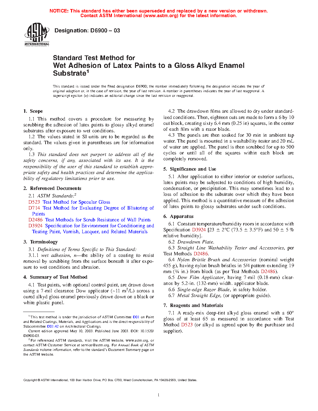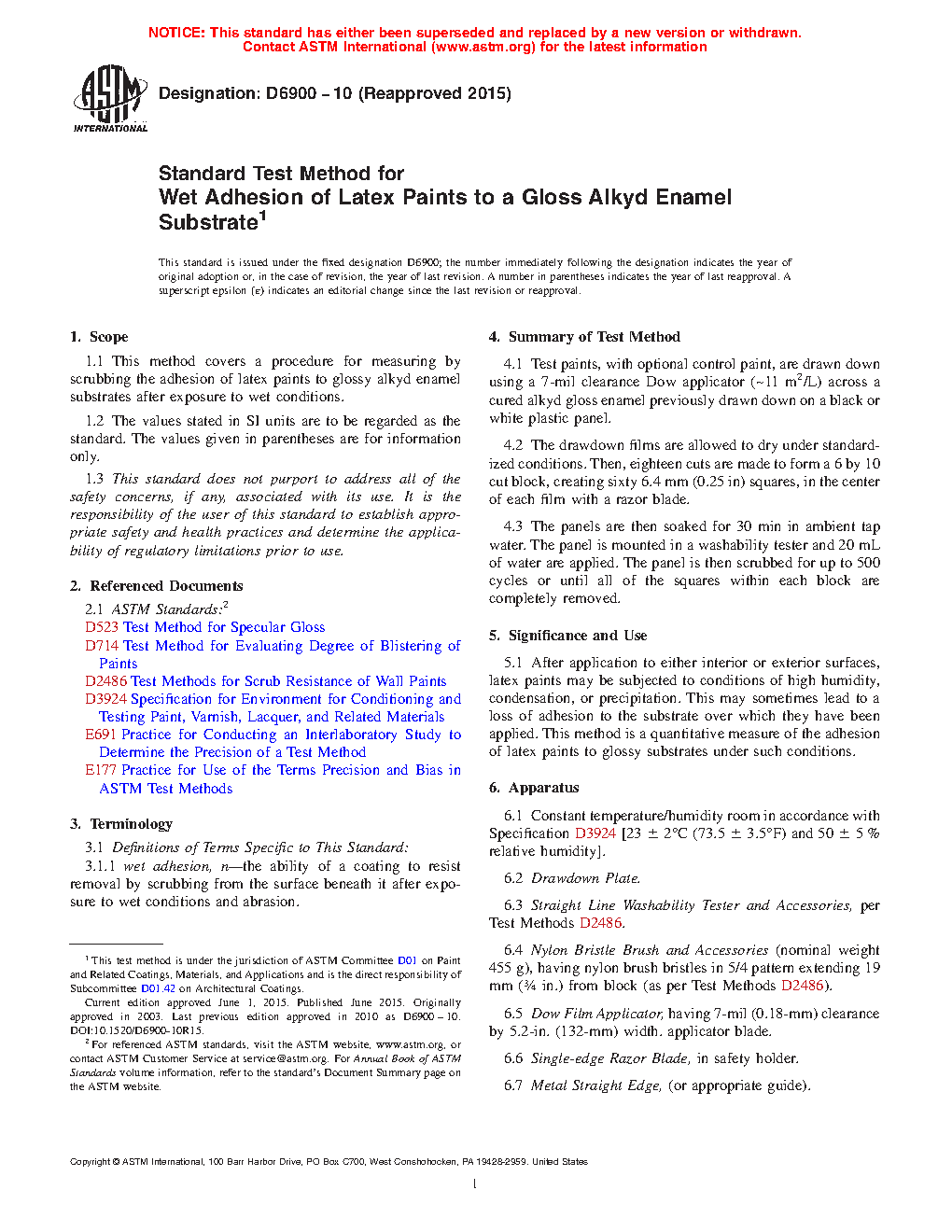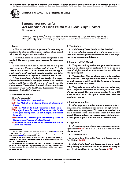 1.1 This method covers a procedure for measuring by scrubbing the adhesion of latex paints to glossy alkyd enamel substrates after exposure to wet conditions.