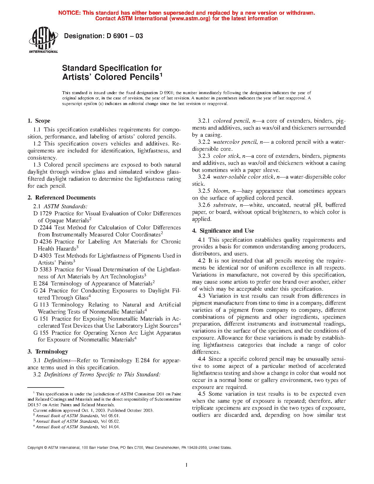 1.1 This specification establishes requirements for composition, performance, and labeling of artists’ colored pencils.
