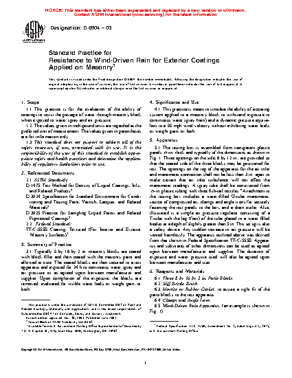 1.1 This practice is for the evaluation of the ability of coatings to resist the passage of water through masonry block when exposed to water spray and air pressure.