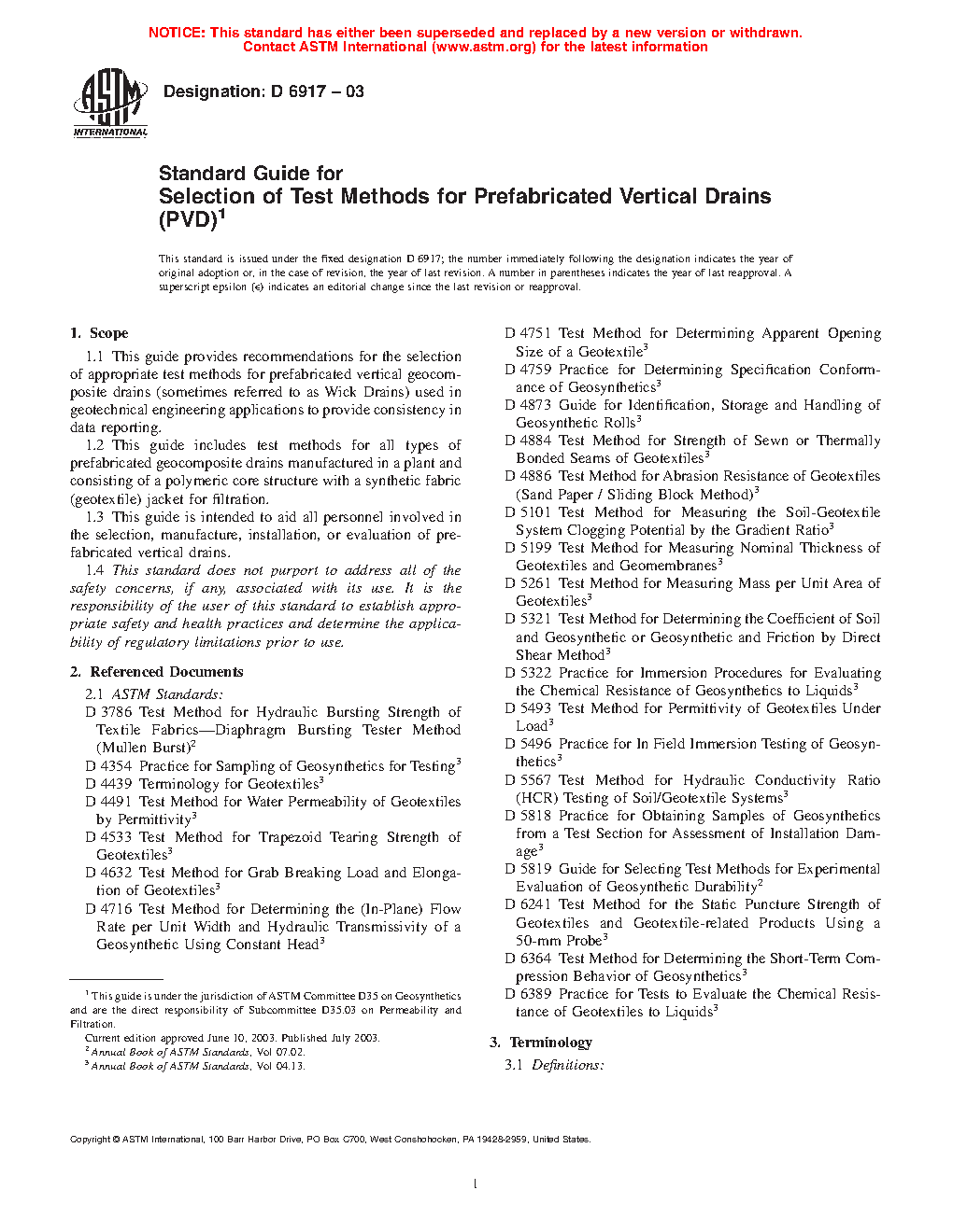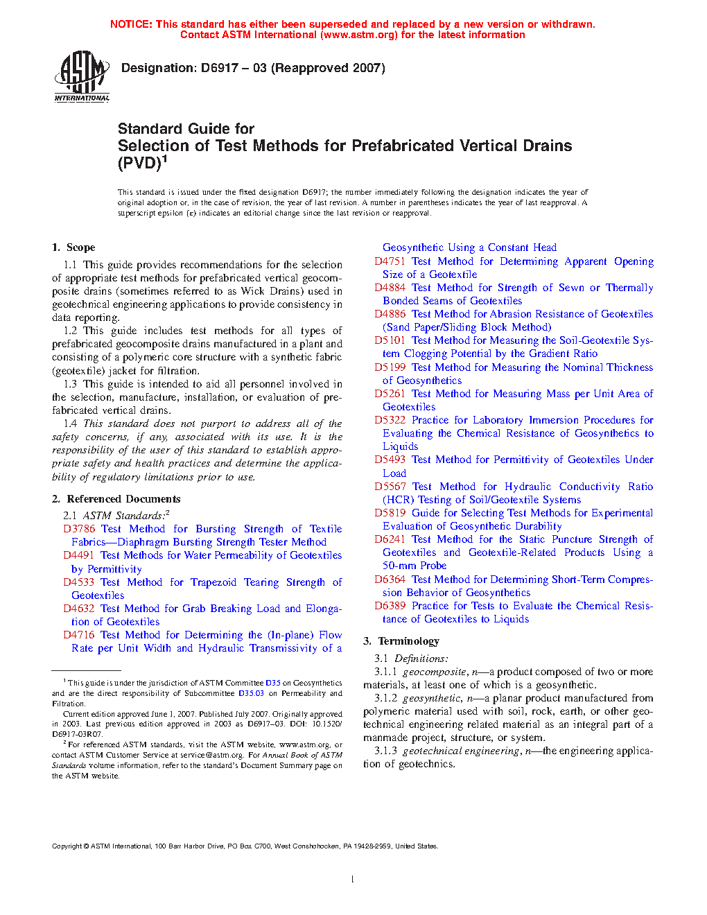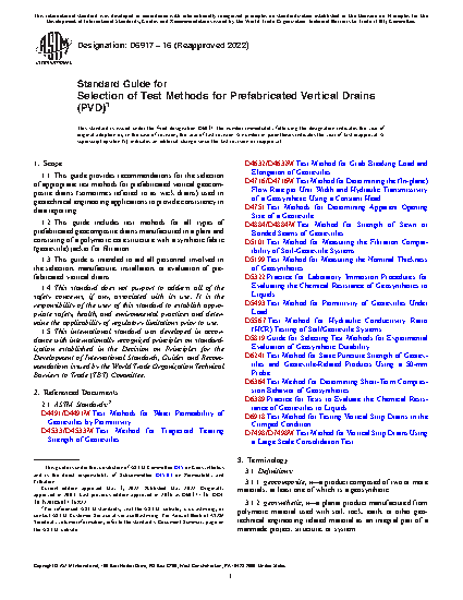 1.1 This guide provides recommendations for the selection of appropriate test methods for prefabricated vertical geocomposite drains (sometimes referred to as wick drains) used in geotechnical engineering applications to provide consistency in data reporting.