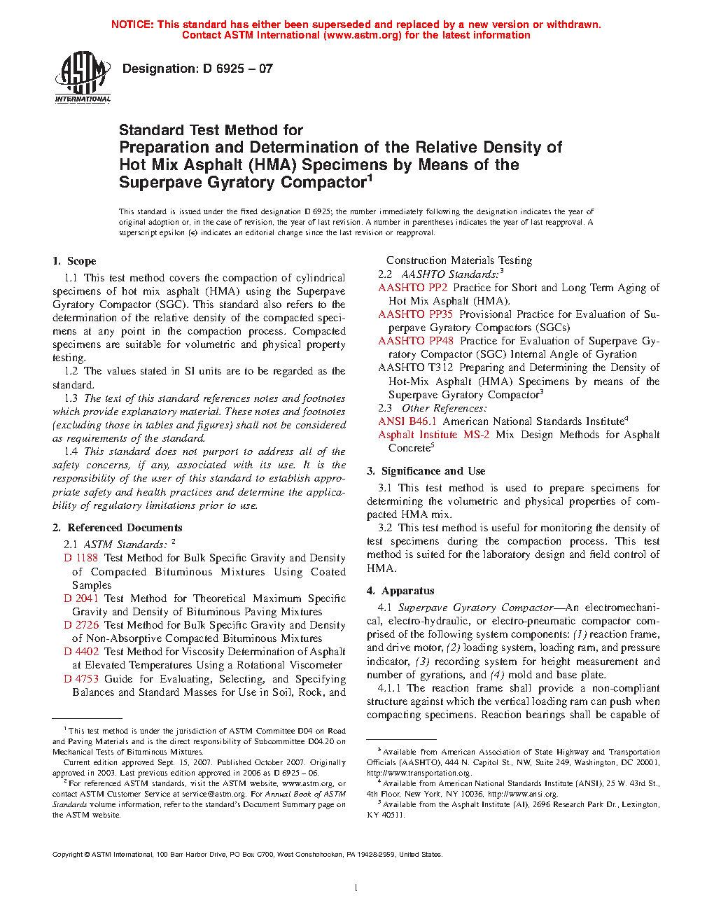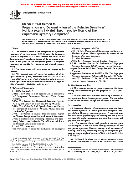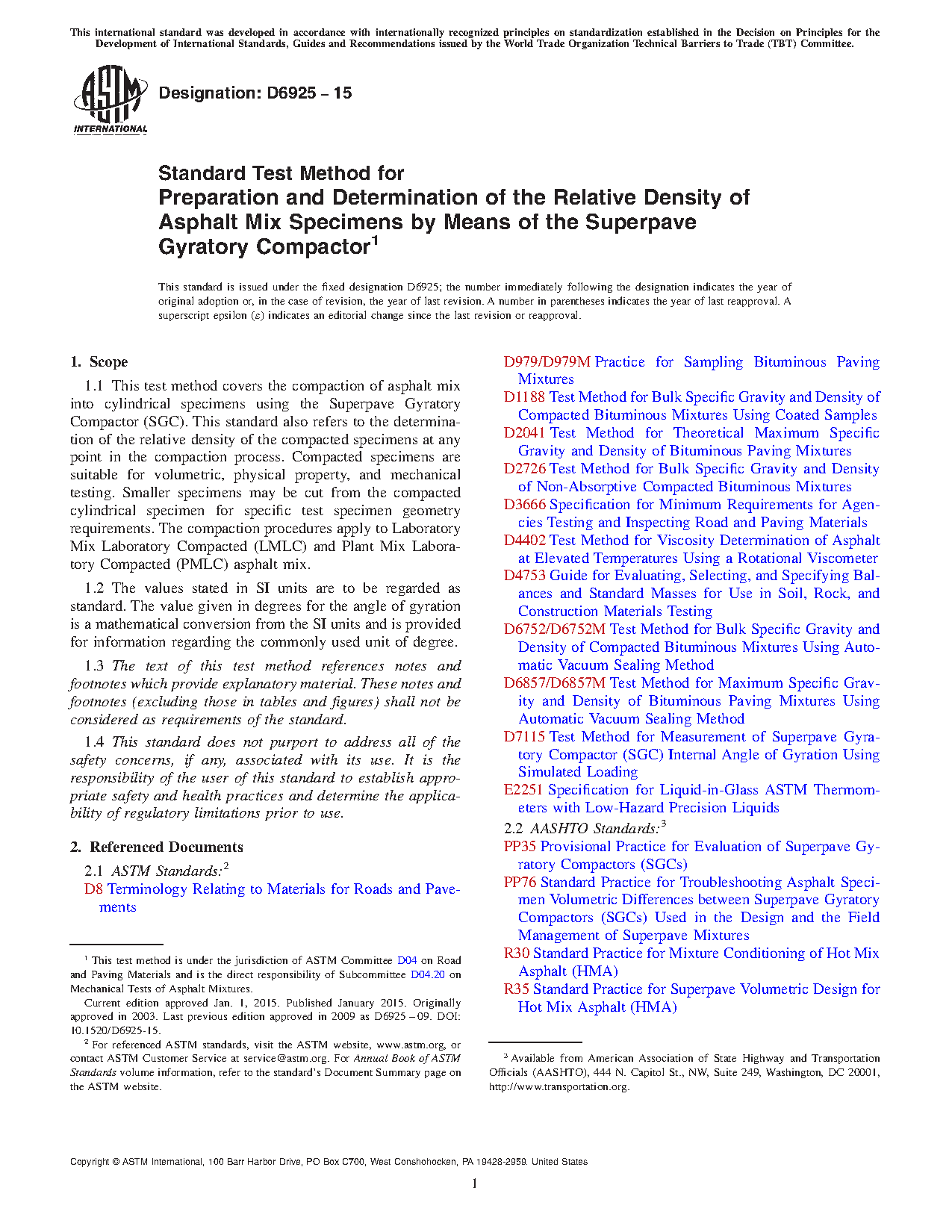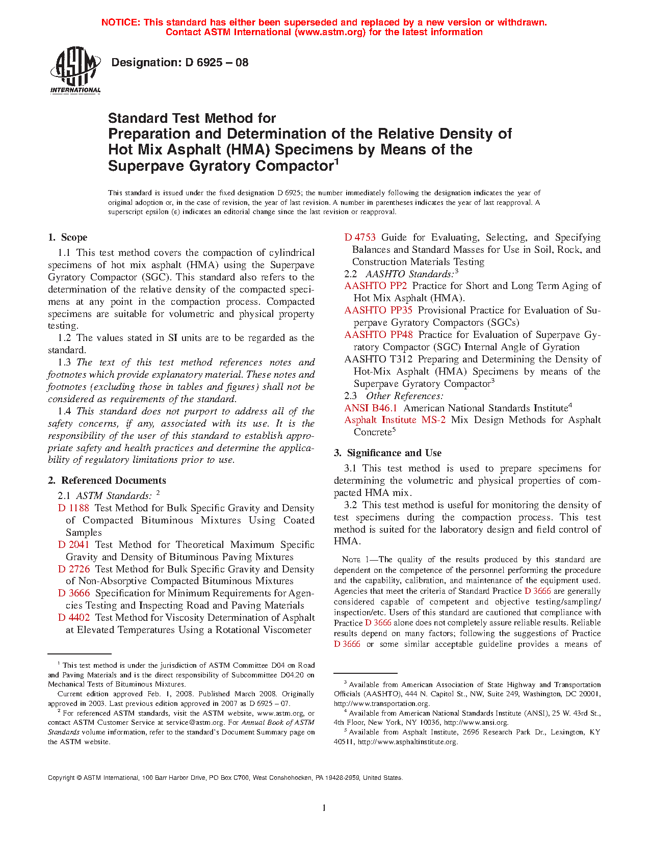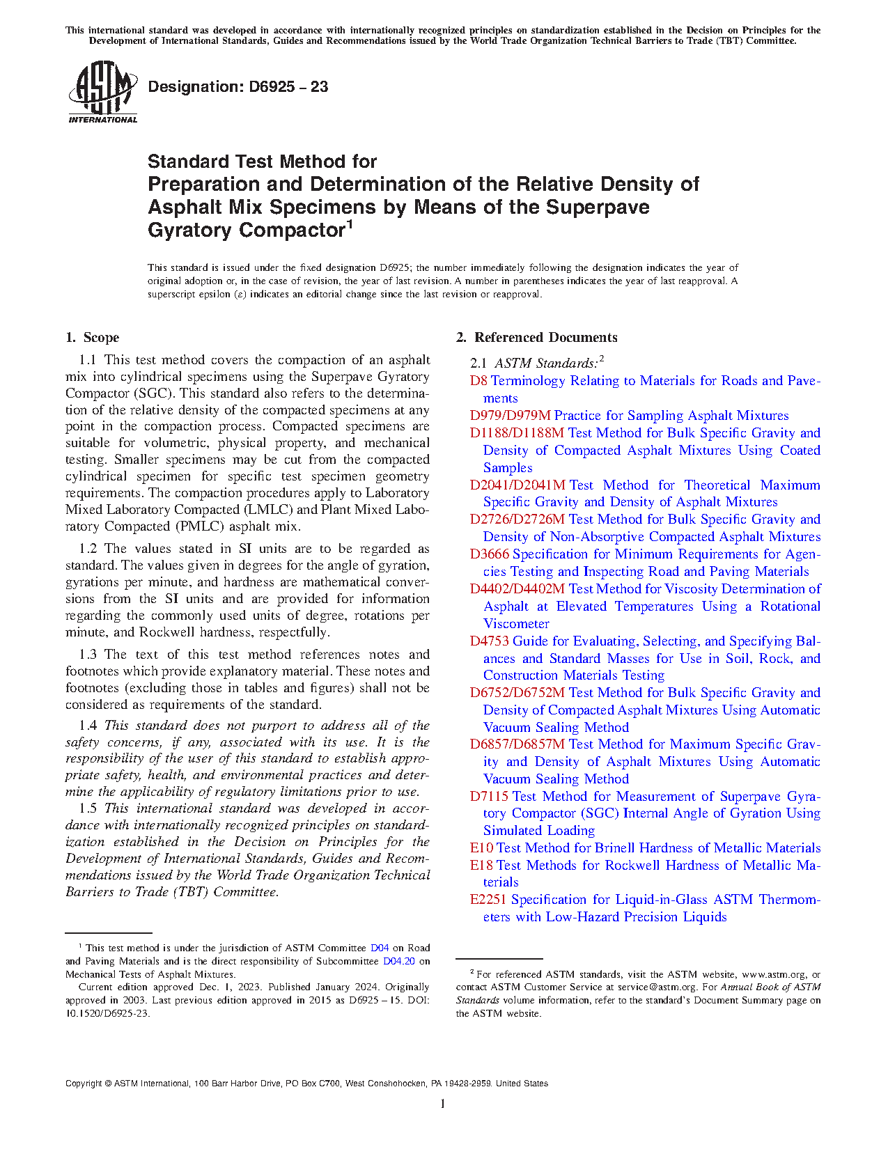 1.1 This test method covers the compaction of an asphalt mix into cylindrical specimens using the Superpave Gyratory Compactor (SGC). This standard also refers to the determination of the relative density of the compacted specimens at any point in the compaction process. Compacted specimens are suitable for volumetric, physical property, and mechanical testing. Smaller specimens may be cut from the compacted cylindrical specimen for specific test specimen geometry requirements. The compaction procedures apply to Laboratory Mixed Laboratory Compacted (LMLC) and Plant Mixed Laboratory Compacted (PMLC) asphalt mix.