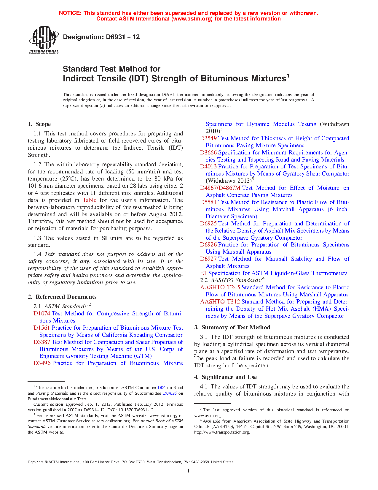 4.1 The values of IDT strength may be used to evaluate the relative quality of asphalt mixtures in conjunction with laboratory mix design testing and for estimating the potential for rutting or cracking. The results can also be used to determine the potential for field pavement moisture damage when results are obtained on both moisture-conditioned and unconditioned specimens.