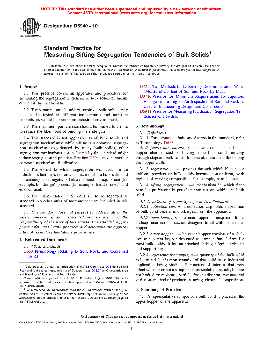 1.4 This standard is not applicable to all bulk solids and segregation mechanisms: while sifting is a common segregation mechanism experienced by many bulk solids, other segregation mechanisms not evaluated by this standard might induce segregation in practice. Practice D6941 covers another common mechanism: fluidization.