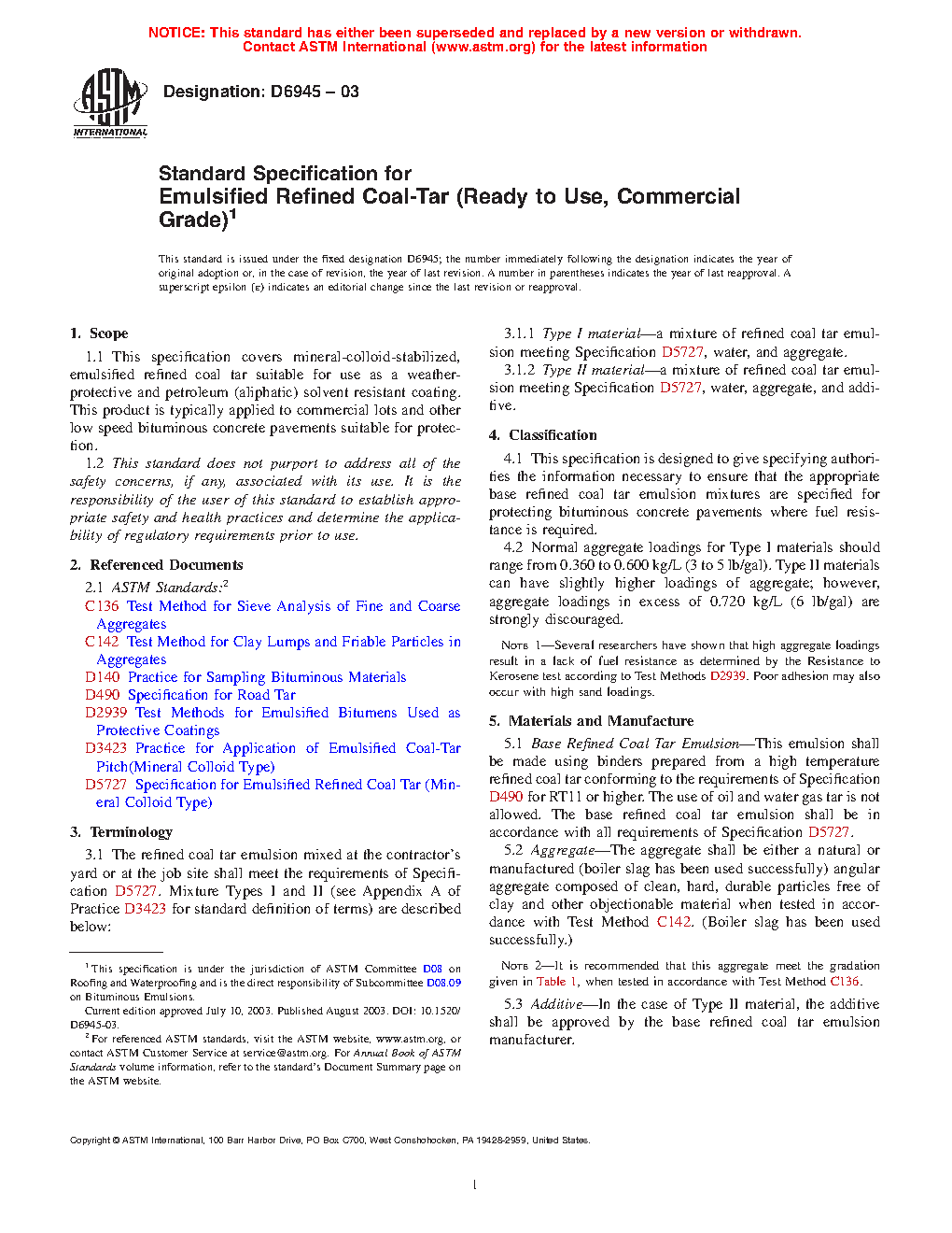 1.1 This specification covers mineral-colloid-stabilized, emulsified refined coal tar suitable for use as a weather-protective and petroleum (aliphatic) solvent resistant coating. This product is typically applied to commercial lots and other low speed bituminous concrete pavements suitable for protection.