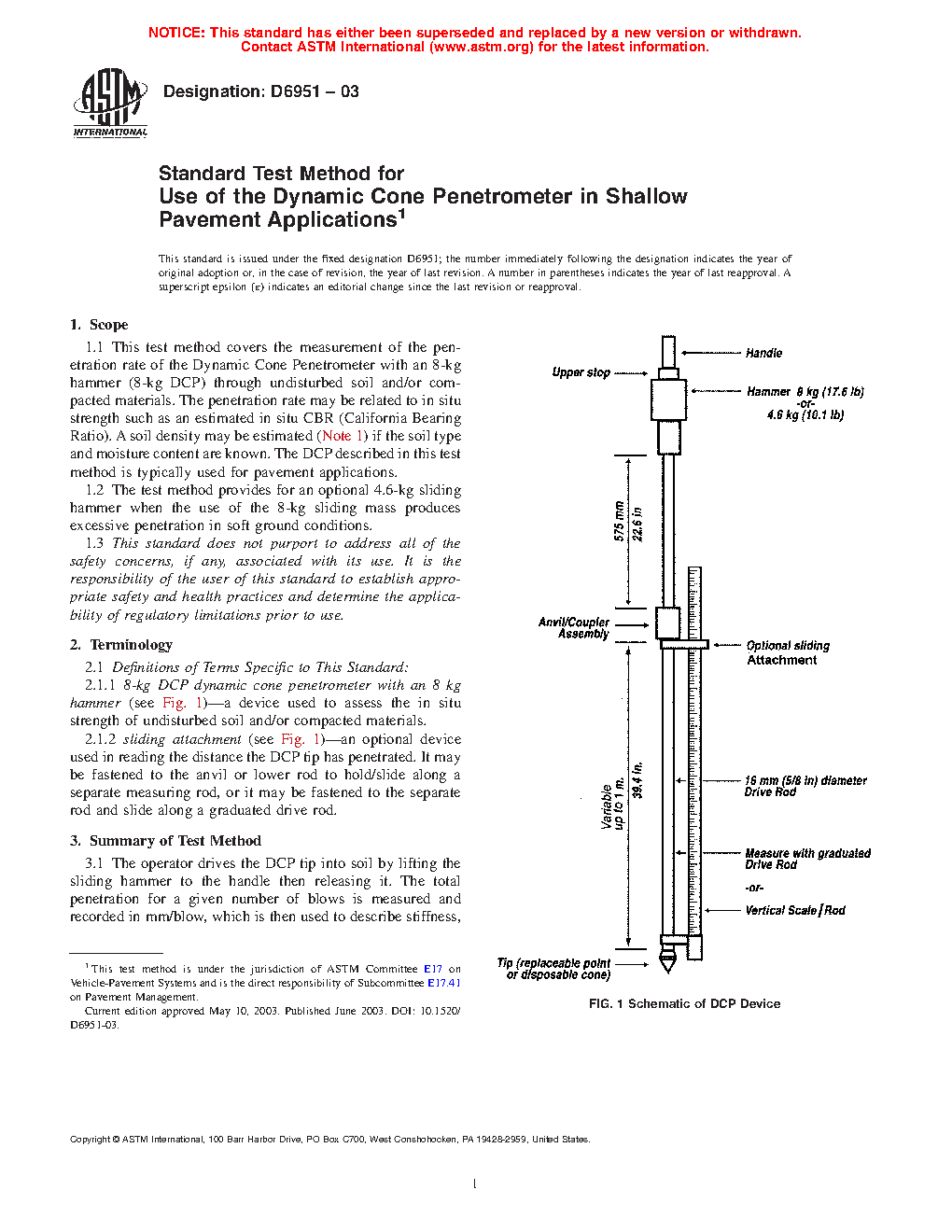 1.1 This test method covers the measurement of the penetration rate of the Dynamic Cone Penetrometer with an 8-kg [17.6-lb] hammer (8-kg [17.6-lb] DCP) through undisturbed soil or compacted materials, or both. The penetration rate may be related to in situ strength such as an estimated in situ CBR (California Bearing Ratio). A soil density may be estimated (Note 1) if the soil type and moisture content are known. The DCP described in this test method is typically used for pavement applications.