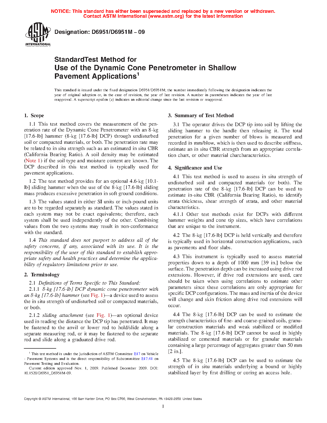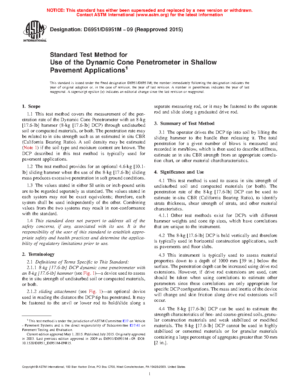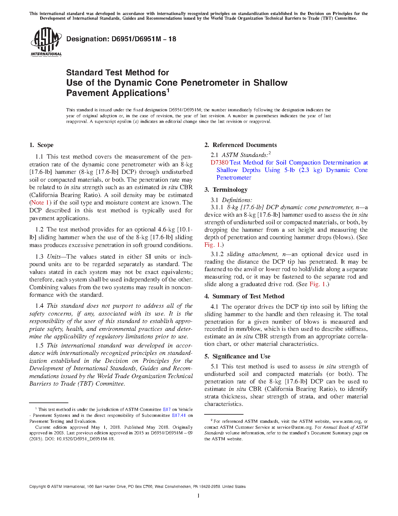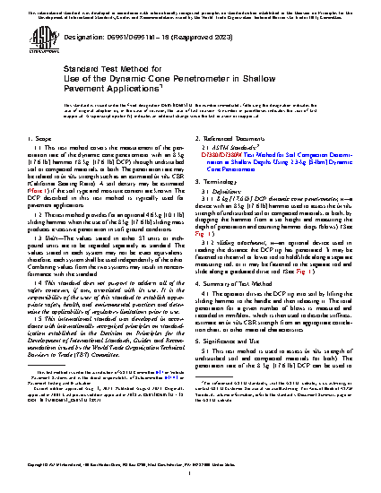 1.1 This test method covers the measurement of the penetration rate of the dynamic cone penetrometer with an 8 kg [17.6 lb] hammer (8 kg [17.6 lb] DCP) through undisturbed soil or compacted materials, or both. The penetration rate may be related to in situ strength such as an estimated in situ CBR (California Bearing Ratio). A soil density may be estimated (Note 1) if the soil type and moisture content are known. The DCP described in this test method is typically used for pavement applications.