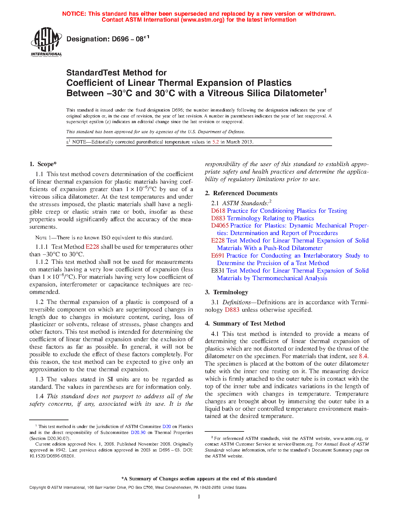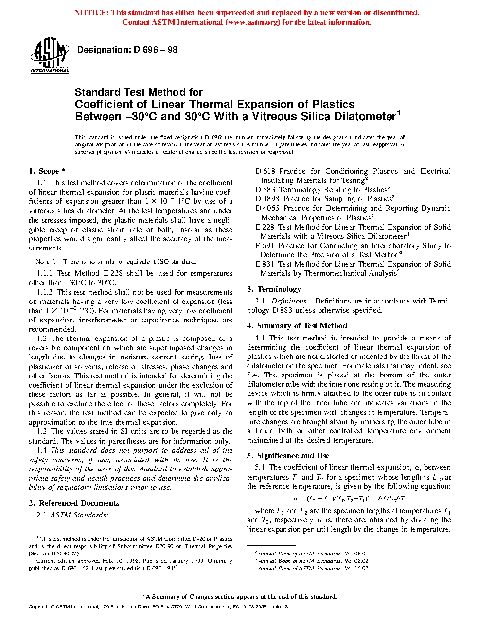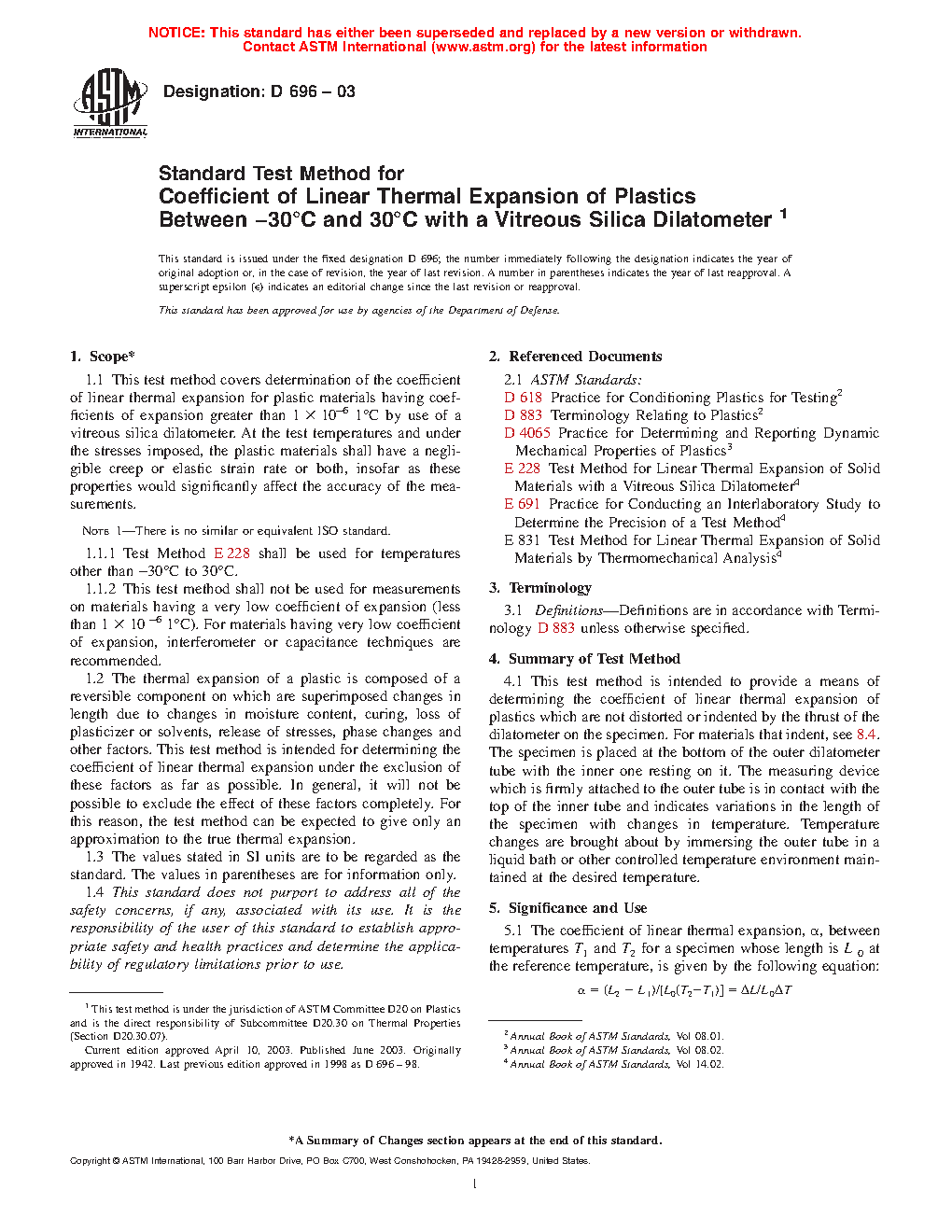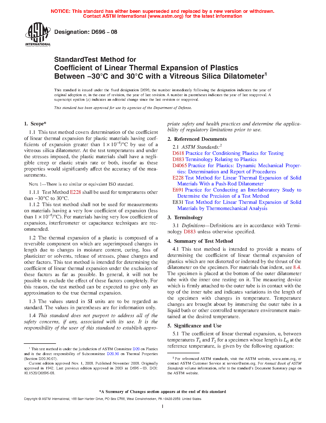 1.1 This test method covers determination of the coefficient of linear thermal expansion for plastic materials having coefficients of expansion greater than 1 µm/(m.°C) by use of a vitreous silica dilatometer. At the test temperatures and under the stresses imposed, the plastic materials shall have a negligible creep or elastic strain rate or both, insofar as these properties would significantly affect the accuracy of the measurements.