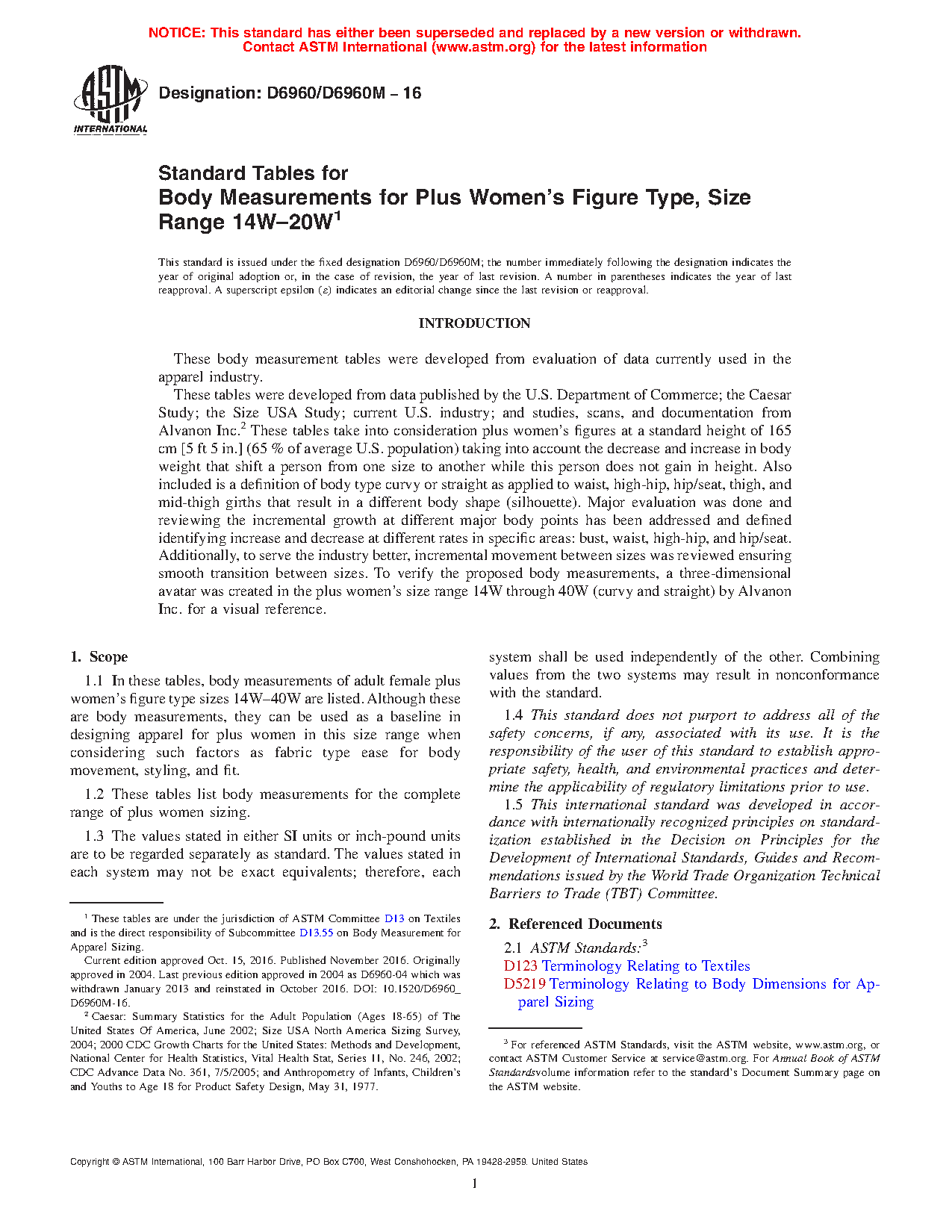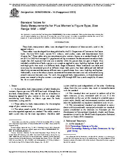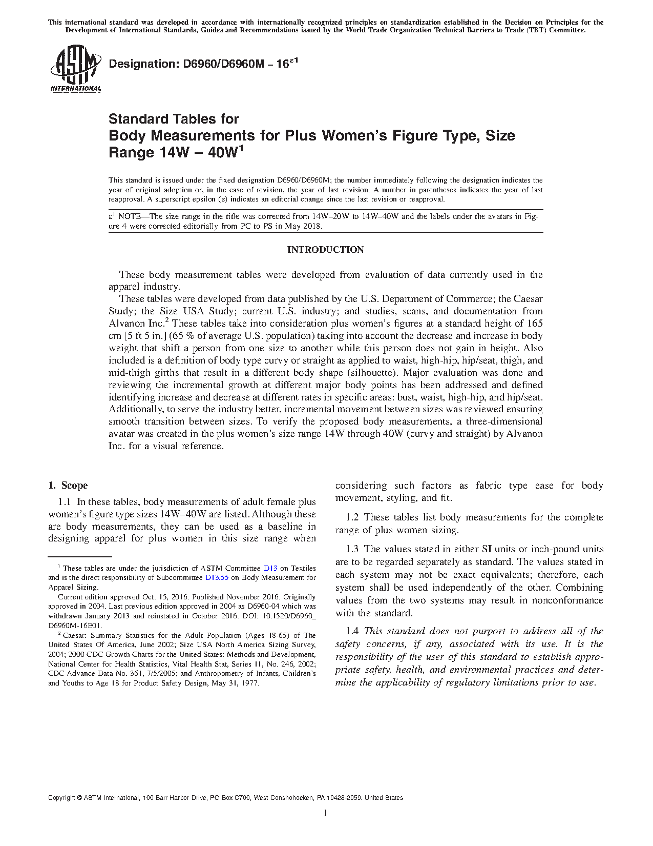 1.1 In these tables, body measurements of adult female plus women’s figure type sizes 14W–40W are listed. Although these are body measurements, they can be used as a baseline in designing apparel for plus women in this size range when considering such factors as fabric type ease for body movement, styling, and fit.