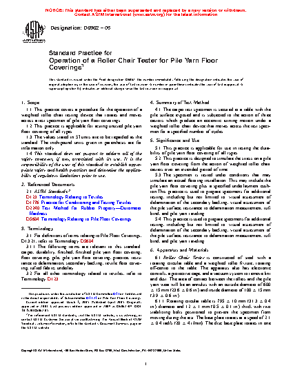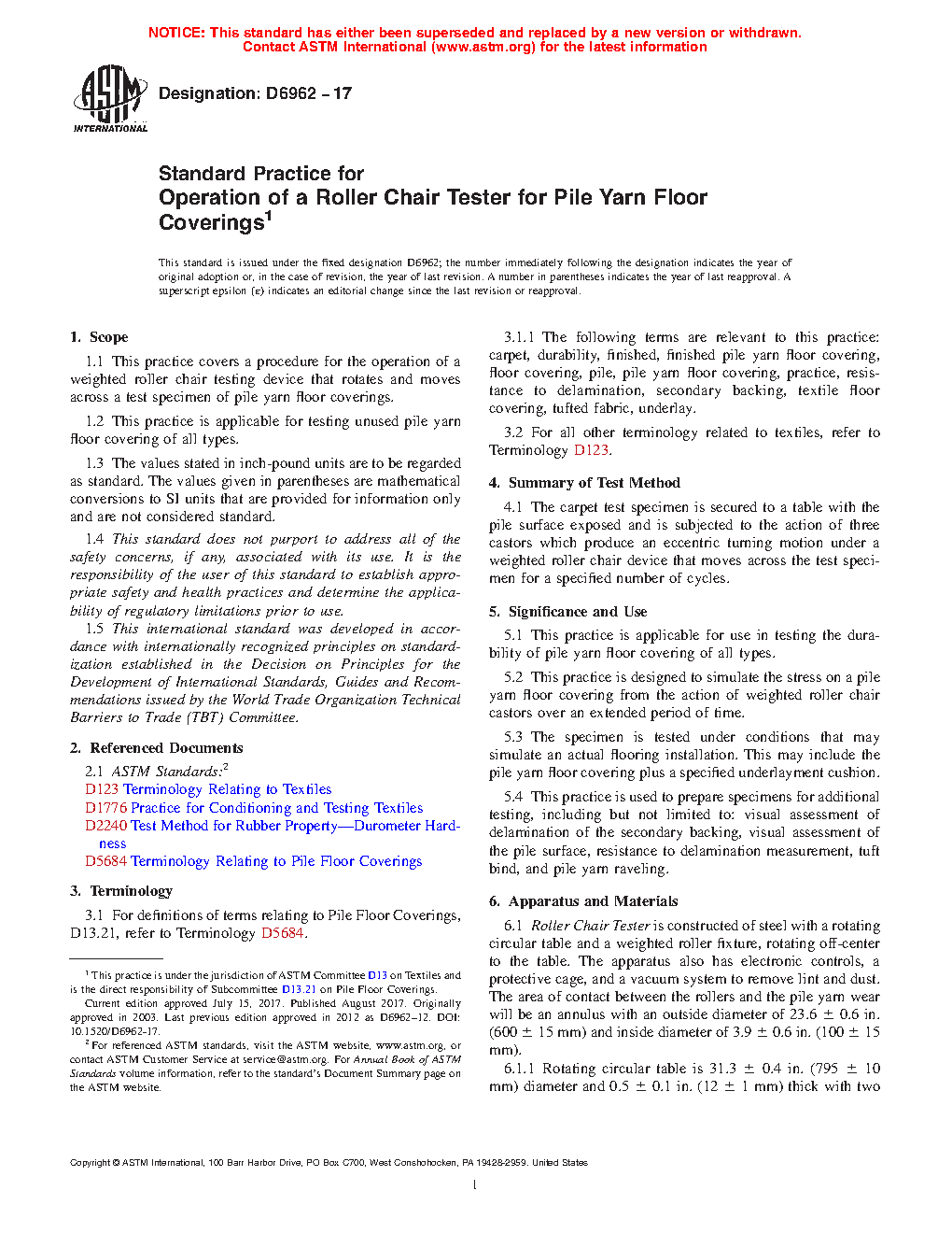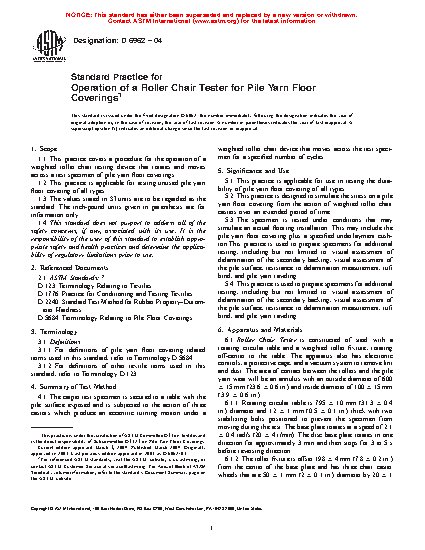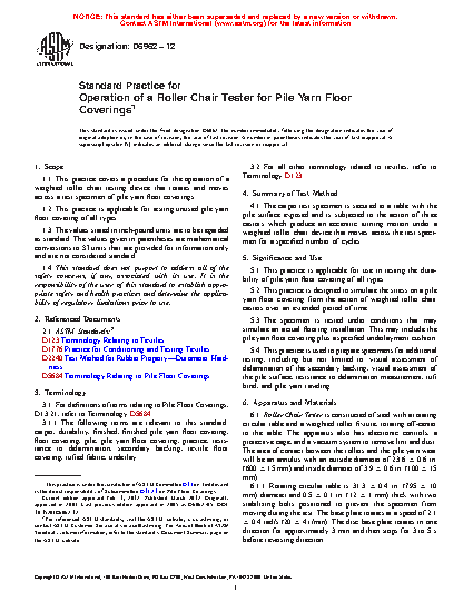 1.1 This practice covers a procedure for the operation of a weighted roller chair testing device that rotates and moves across a test specimen of pile yarn floor coverings.