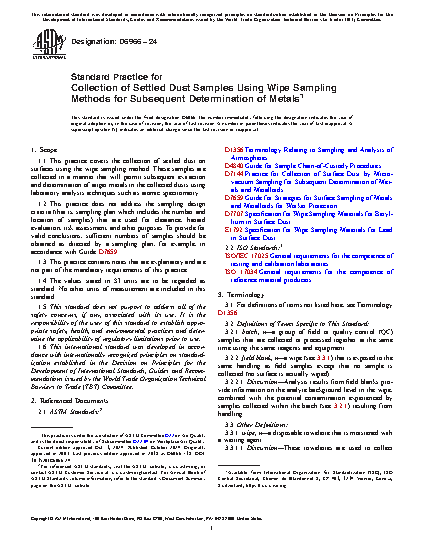 1.1 This practice covers the collection of settled dust on surfaces using the wipe sampling method. These samples are collected in a manner that will permit subsequent extraction and determination of target metals in the wipes using laboratory analysis techniques such as atomic spectrometry.