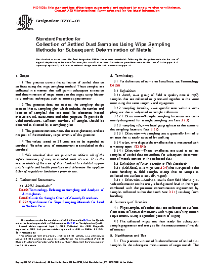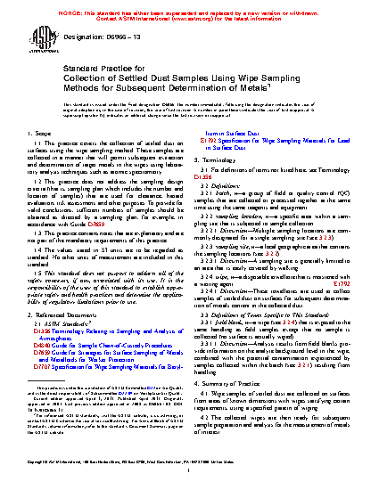 1.1 This practice covers the collection of settled dust on surfaces using the wipe sampling method. These samples are collected in a manner that will permit subsequent extraction and determination of target metals in the collected dusts using laboratory analysis techniques such as atomic spectrometry.