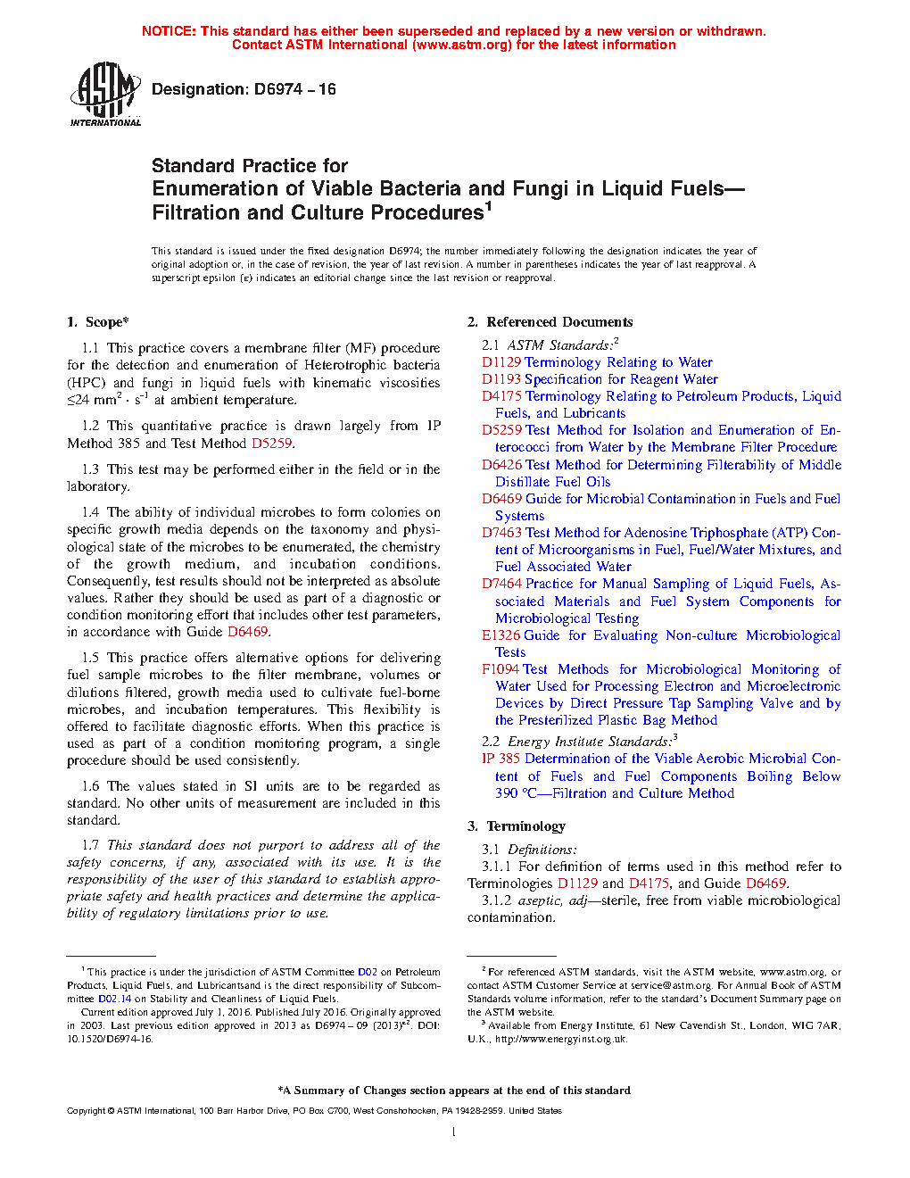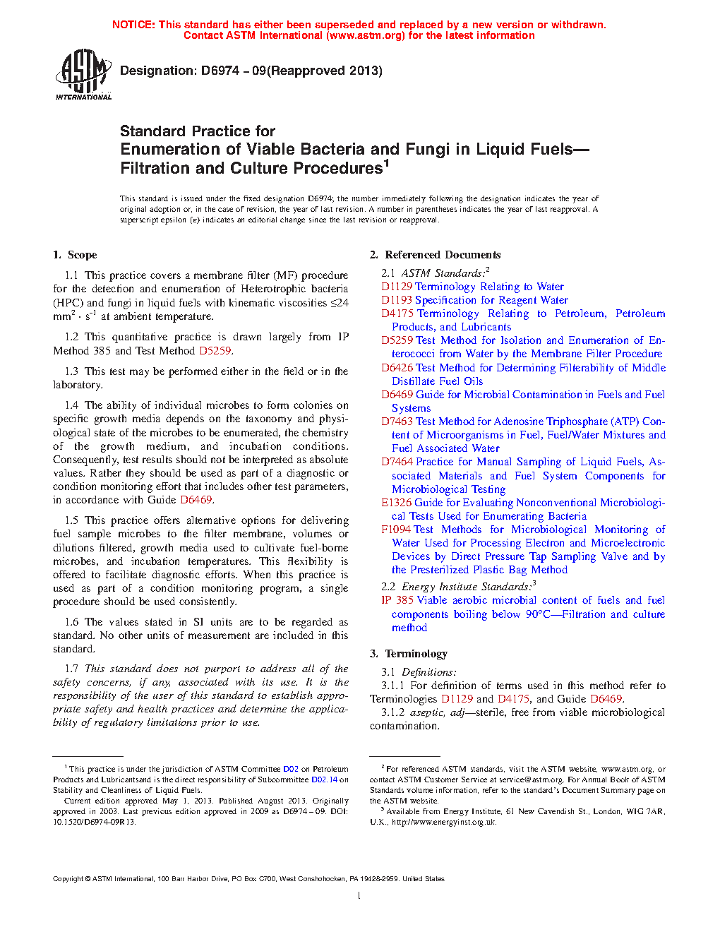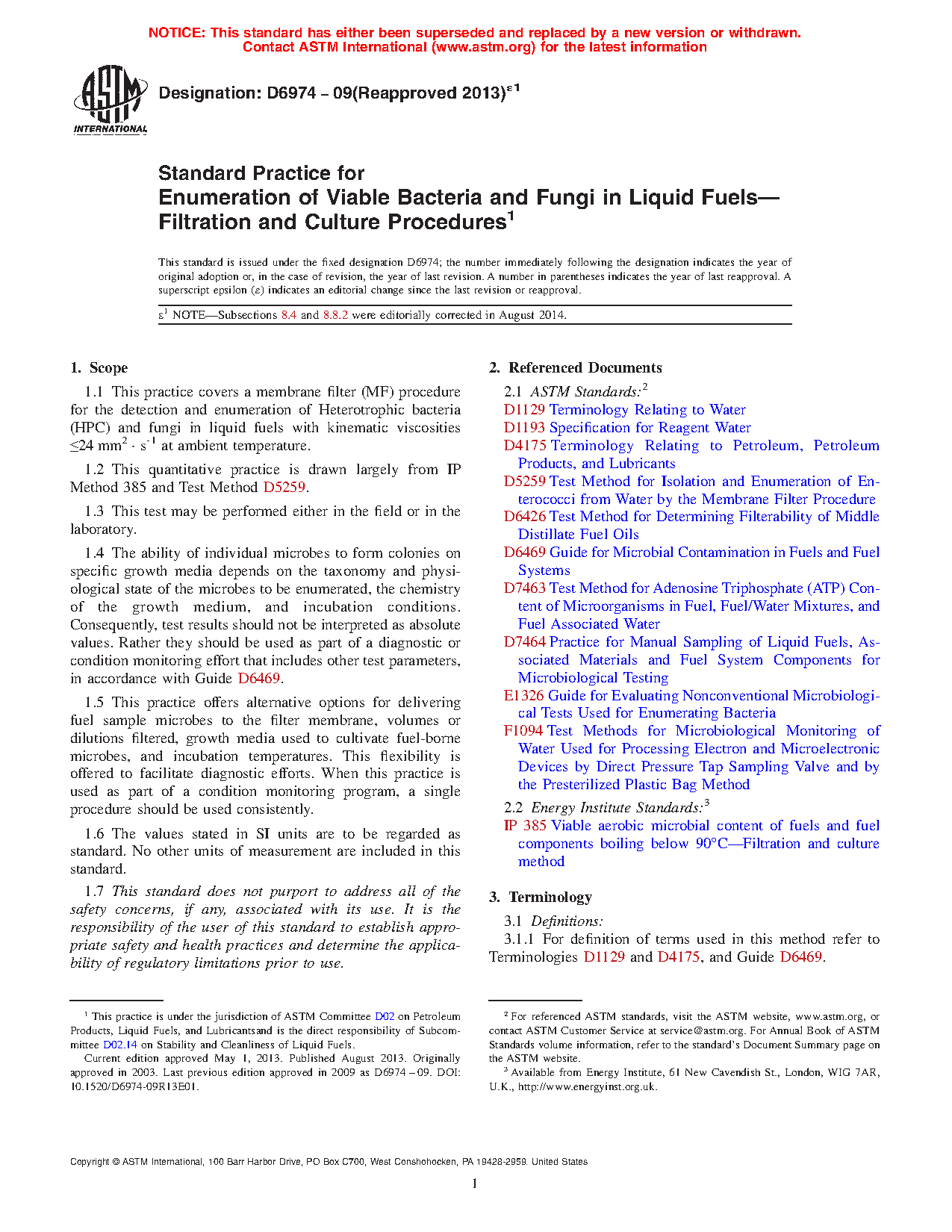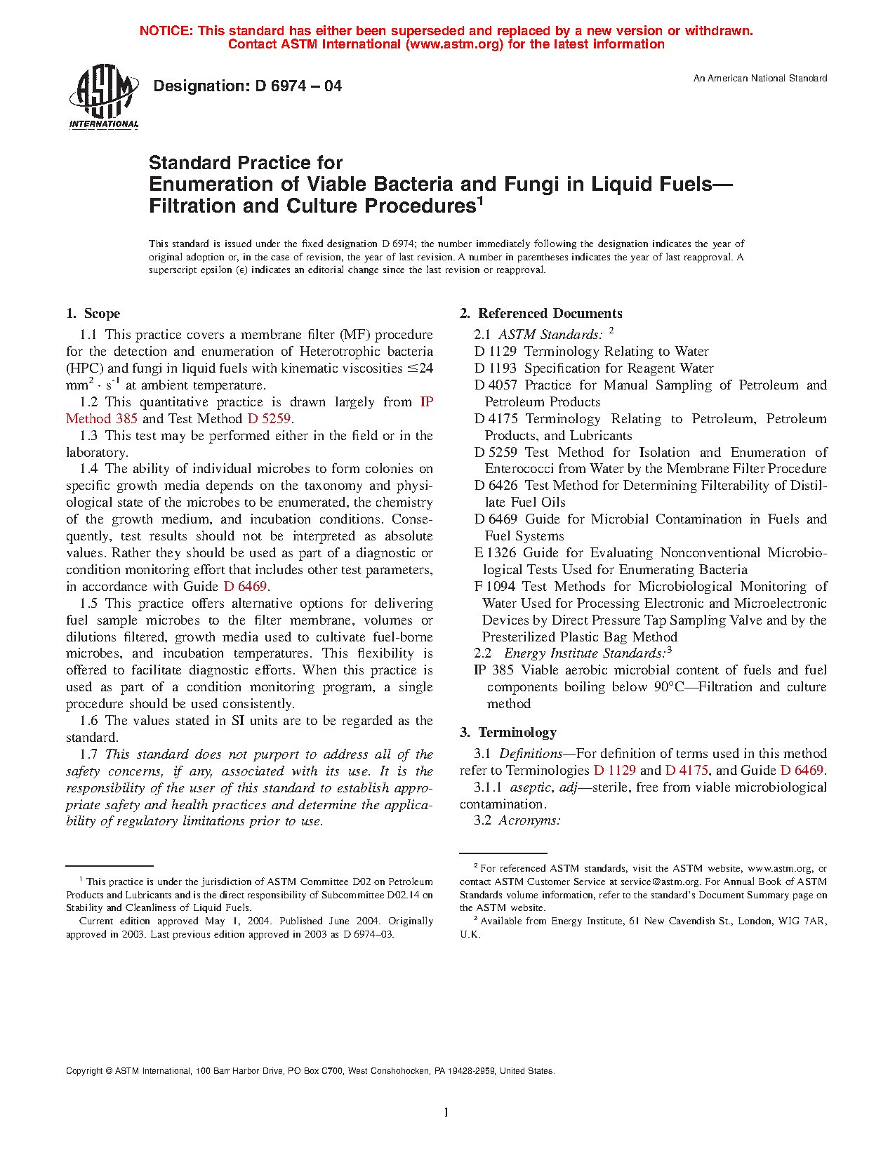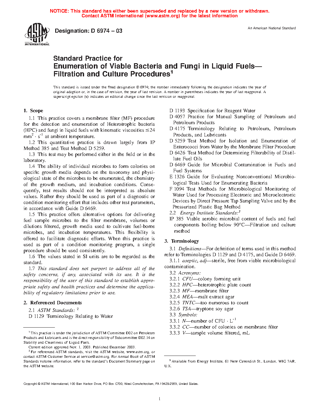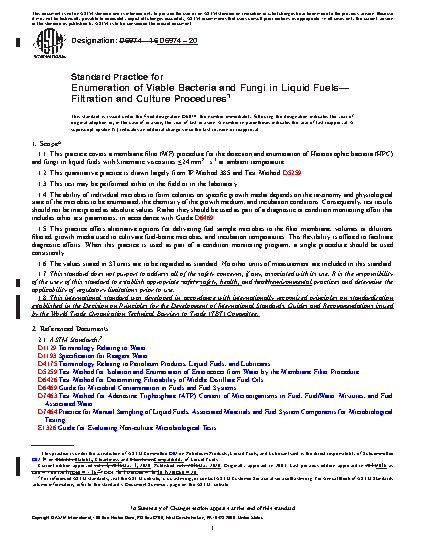 1.1 This practice covers a membrane filter (MF) procedure for the detection and enumeration of Heterotrophic bacteria (HPC) and fungi in liquid fuels with kinematic viscosities =24 mm2 · s-1 at ambient temperature.