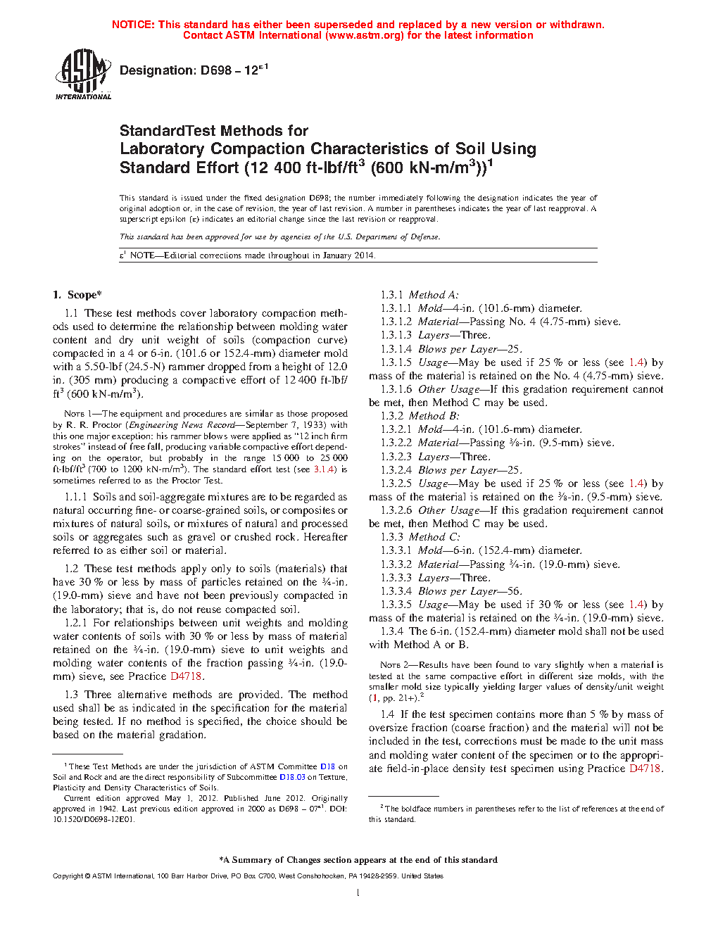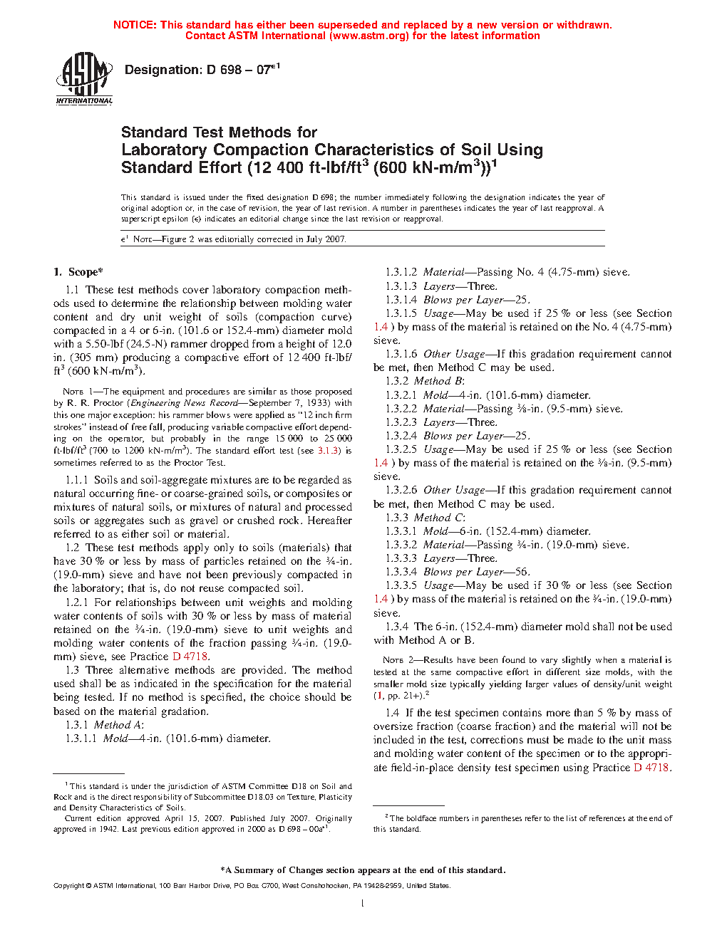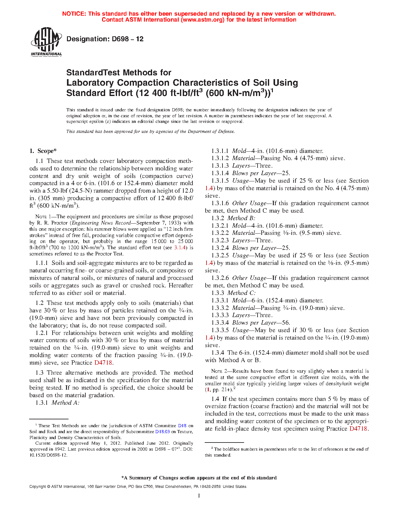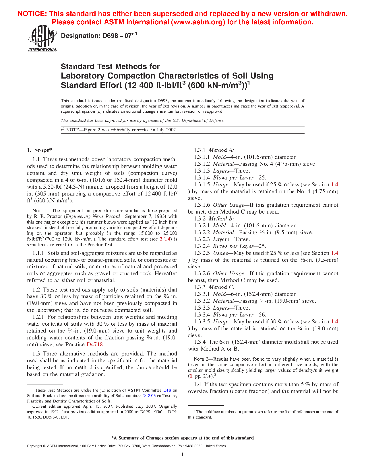 Standard Test Methods for Laboratory Compaction Characteristics of Soil Using Standard Effort (12,400 ft-lbf/ft3 (600 kN-m/m3))