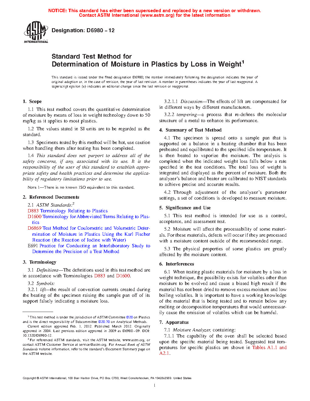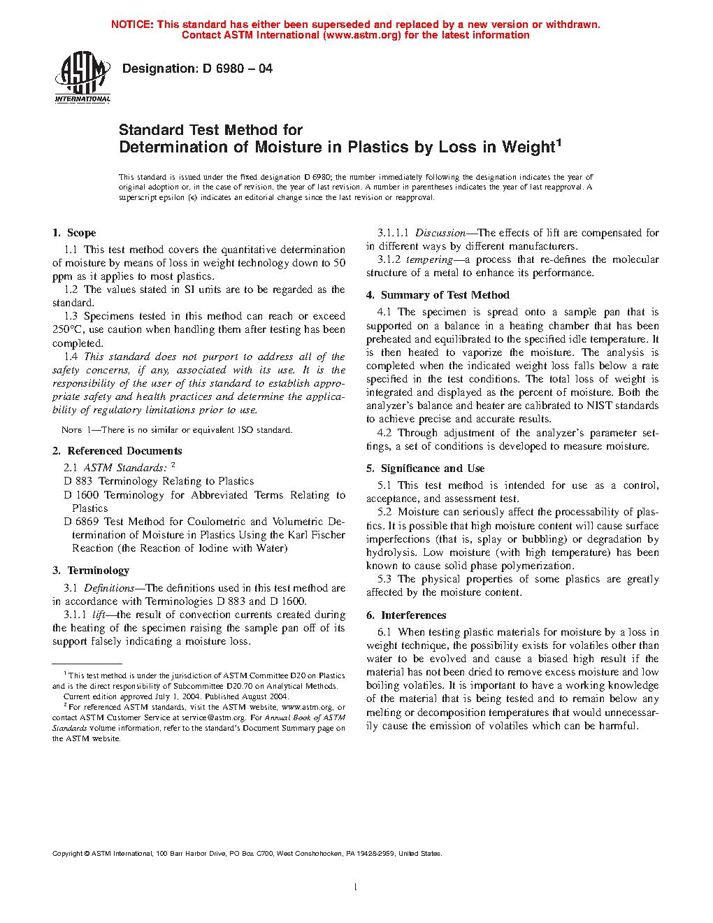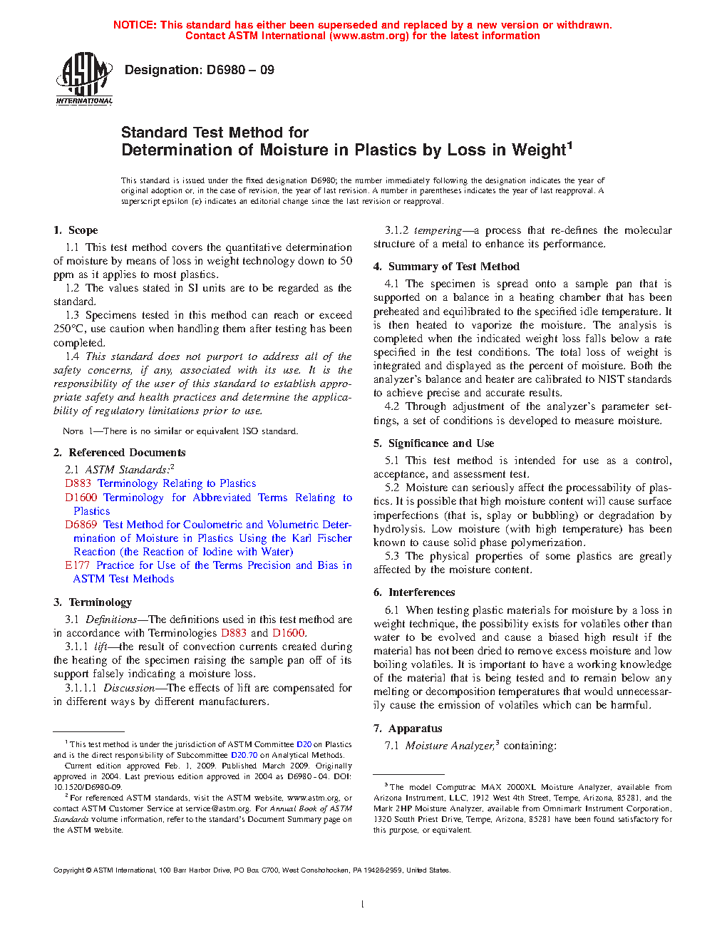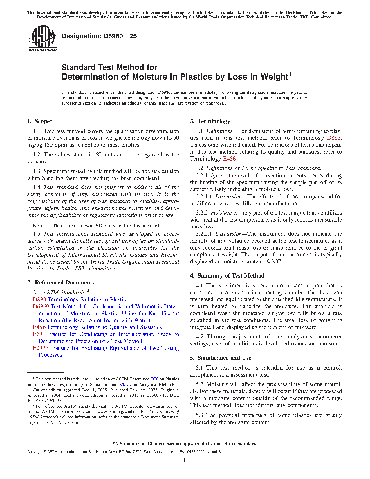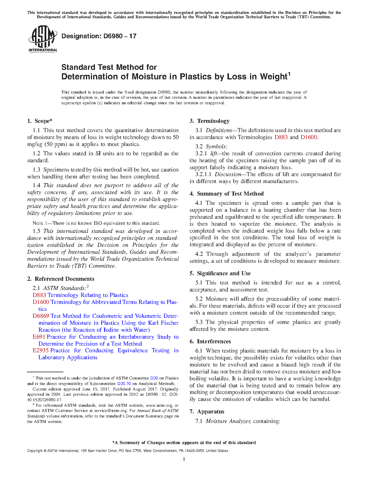 1.1 This test method covers the quantitative determination of moisture by means of loss in weight technology down to 50 mg/kg (50 ppm) as it applies to most plastics.