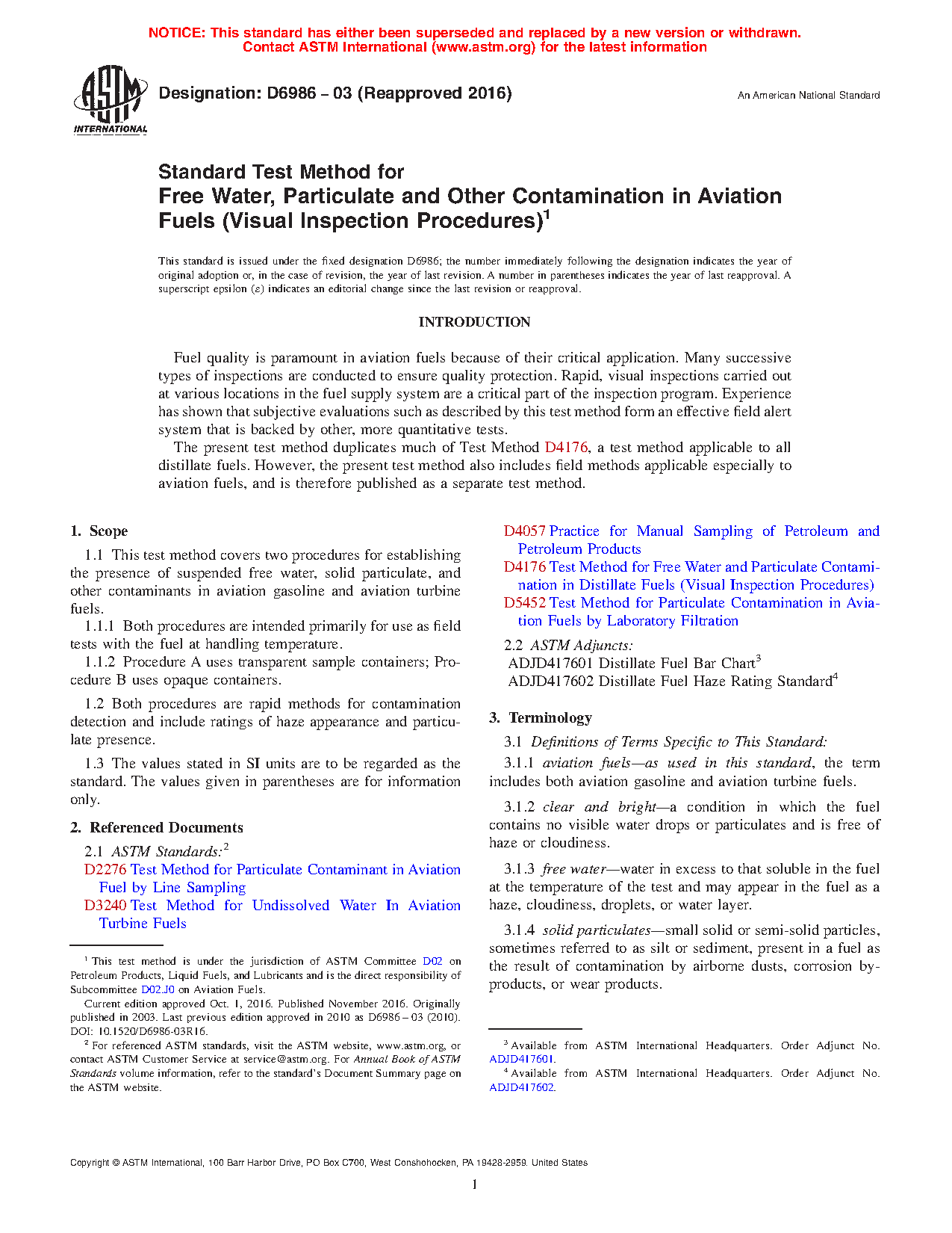 1.1 This test method covers two procedures for establishing the presence of suspended free water, solid particulate, and other contaminants in aviation gasoline and aviation turbine fuels.