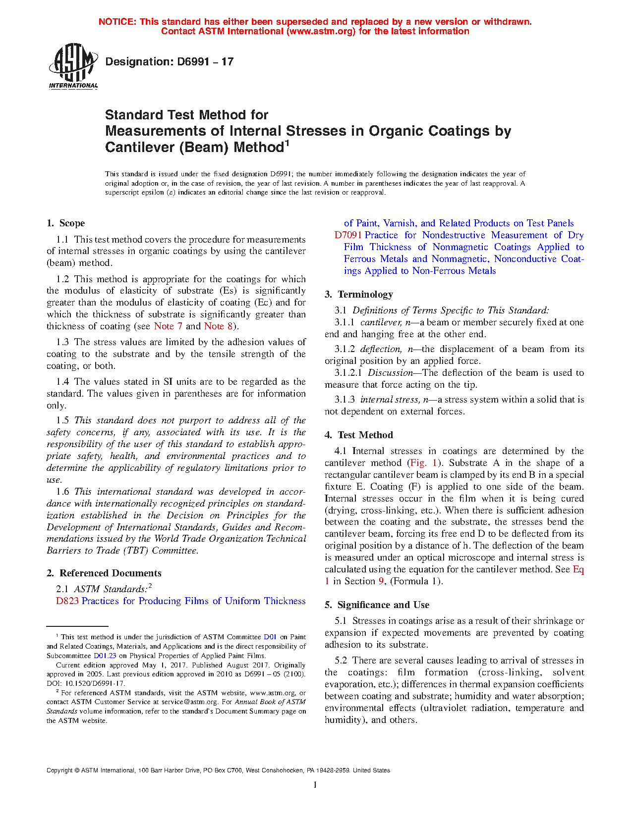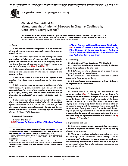 1.1 This test method covers the procedure for measurements of internal stresses in organic coatings by using the cantilever (beam) method.