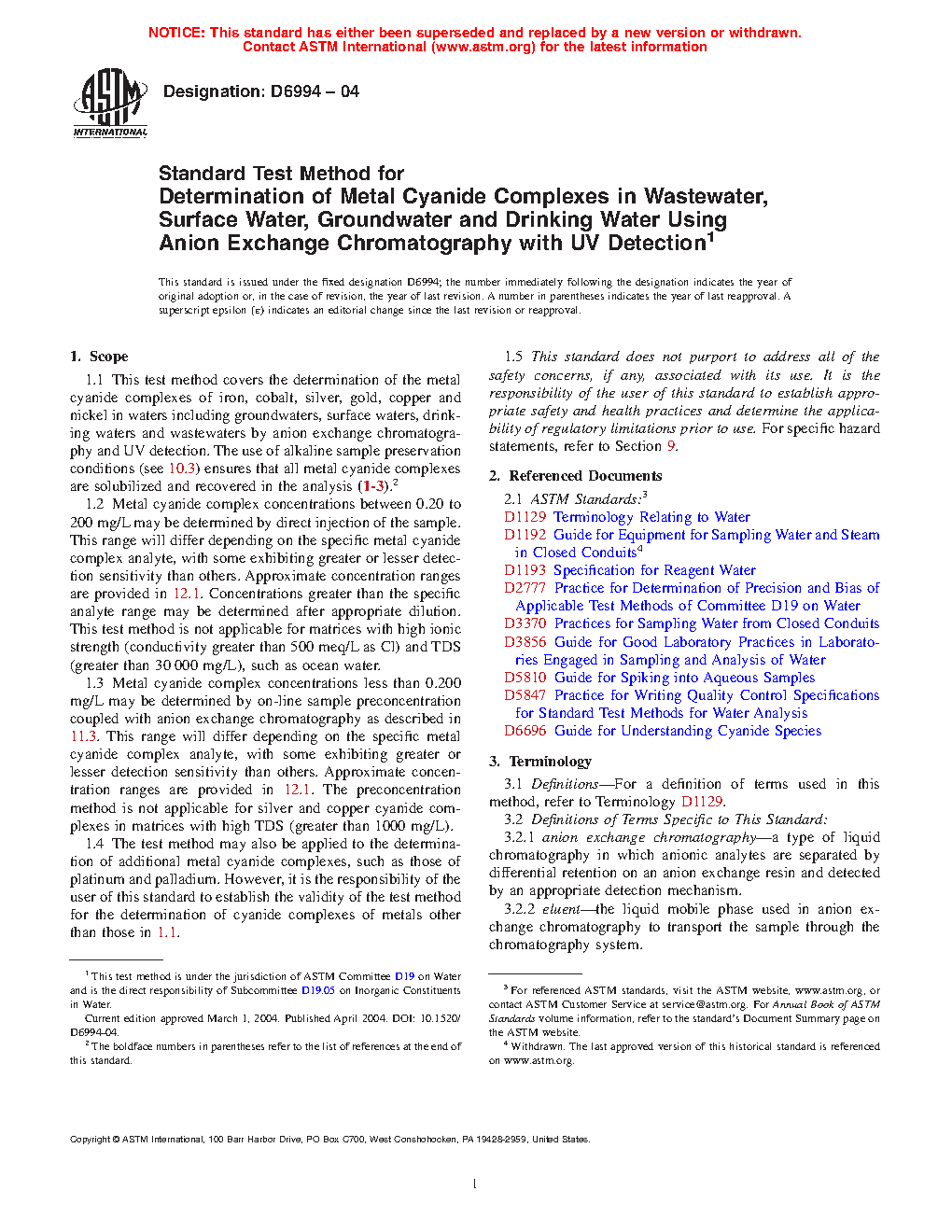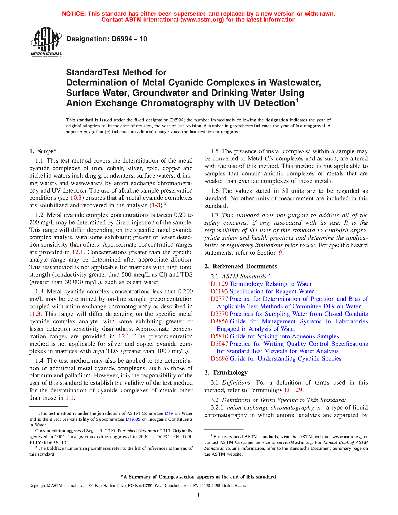 1.1 This test method covers the determination of the metal cyanide complexes of iron, cobalt, silver, gold, copper and nickel in waters including groundwaters, surface waters, drinking waters and wastewaters by anion exchange chromatography and UV detection. The use of alkaline sample preservation conditions (see 10.3) ensures that all metal cyanide complexes are solubilized and recovered in the analysis (1-3).2