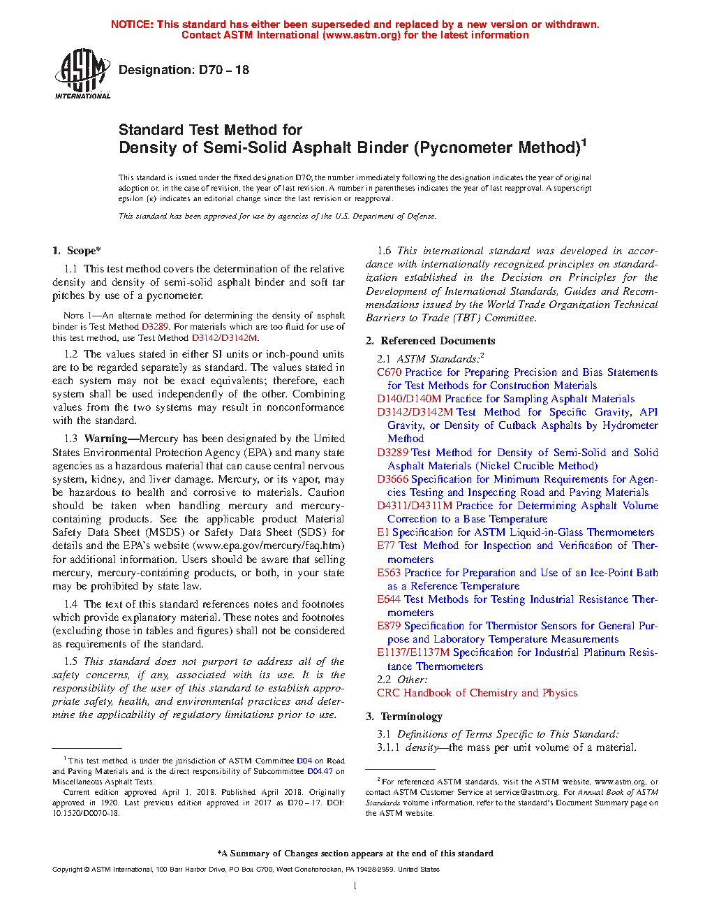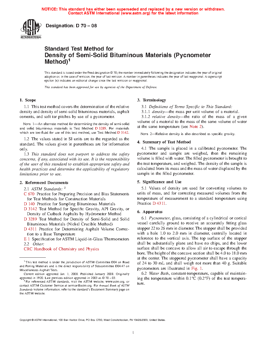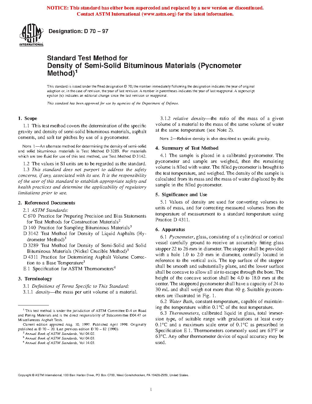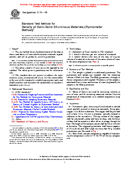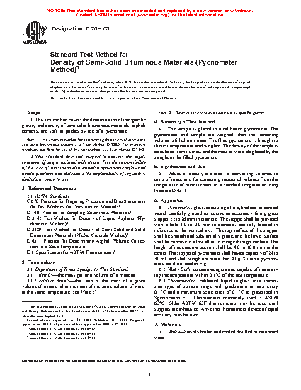1.1 This test method covers the determination of the relative density and density of semi-solid asphalt binder by use of a pycnometer.