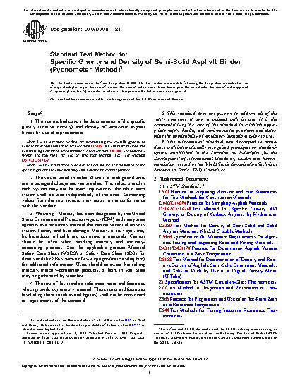 1.1 This test method covers the determination of the specific gravity (relative density) and density of semi-solid asphalt binder by use of a pycnometer.