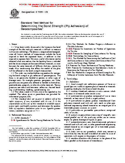 1.2 This index test method defines a procedure for comparing the bond strength or ply adhesion of geocomposites. The focus is on geotextiles bonded to geonets or other types of drainage cores; for example, geomats, geospacers, etc. Other possible uses are geotextiles adhered or bonded to themselves, geomembranes, geogrids, or other dissimilar materials. Various processes can make such laminates: adhesives, thermal bonding, stitch bonding, needling, spread coating, etc.