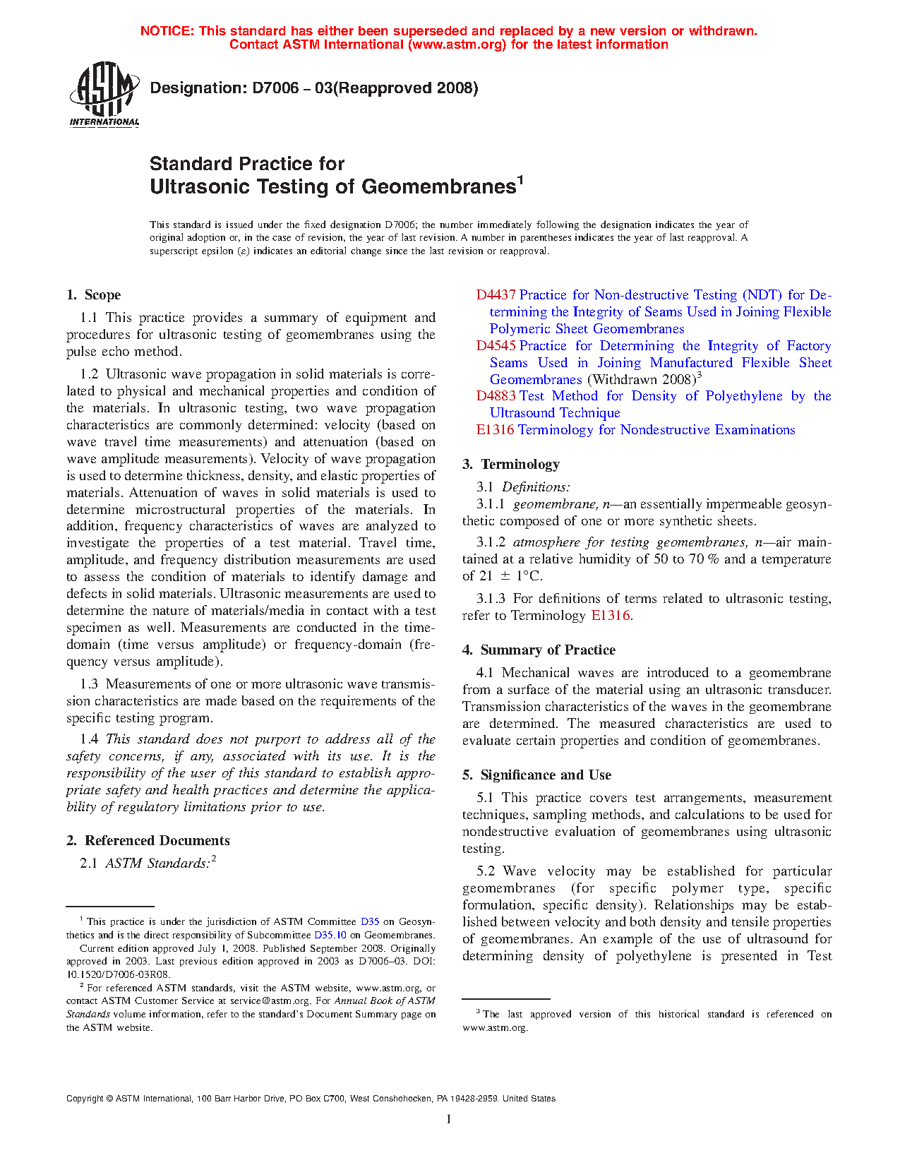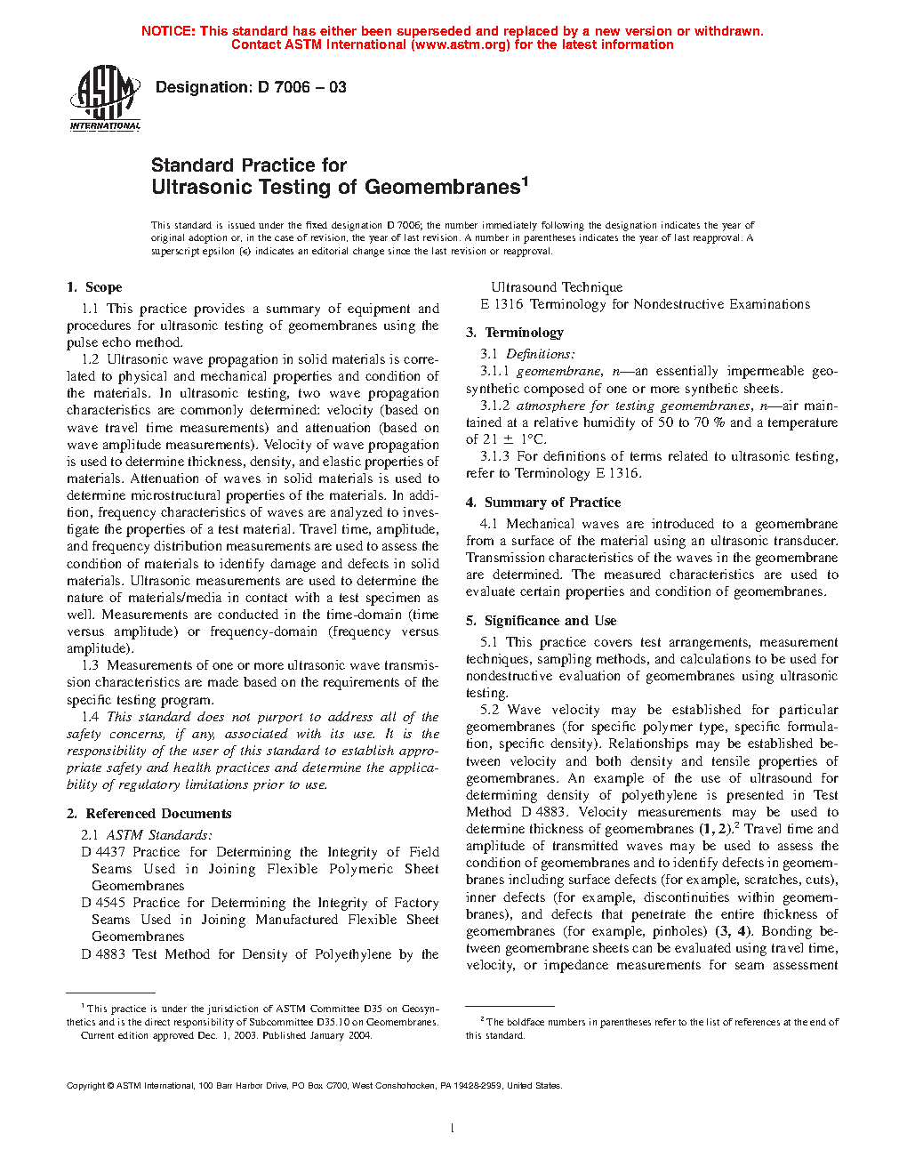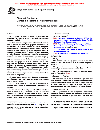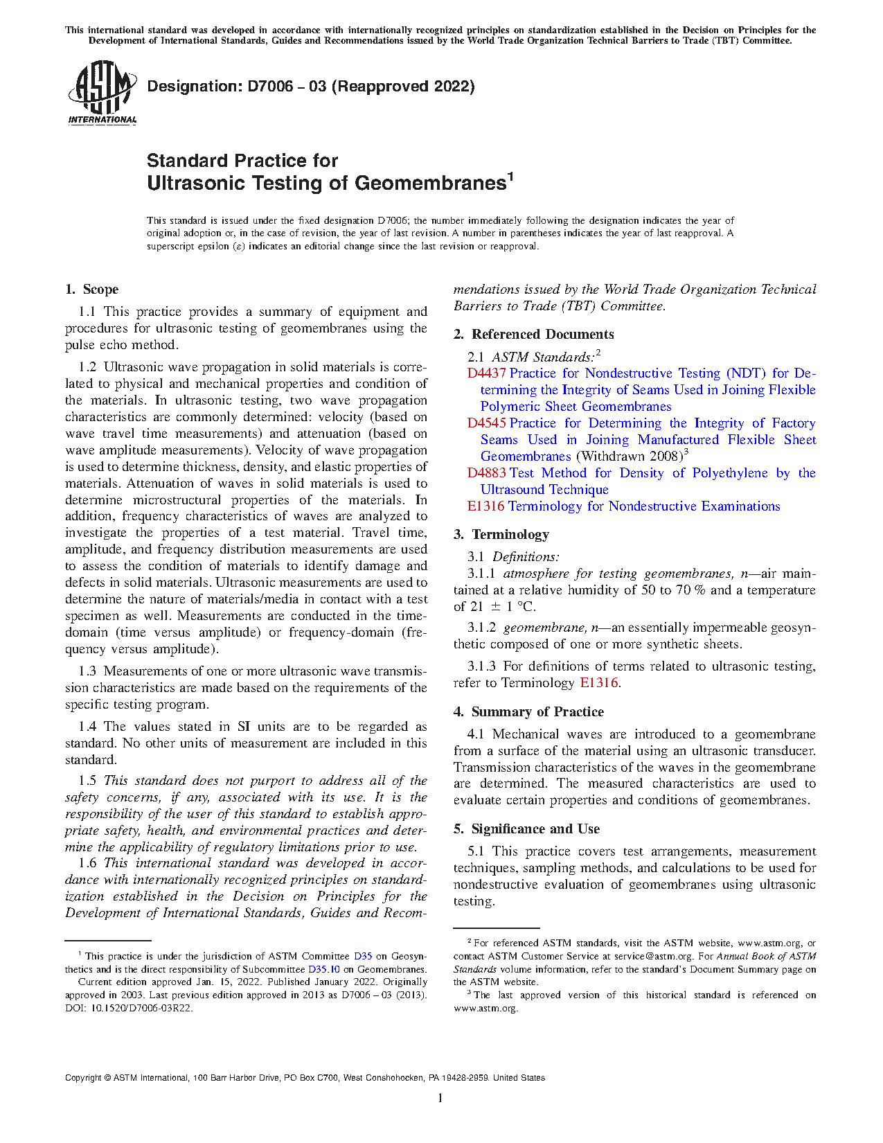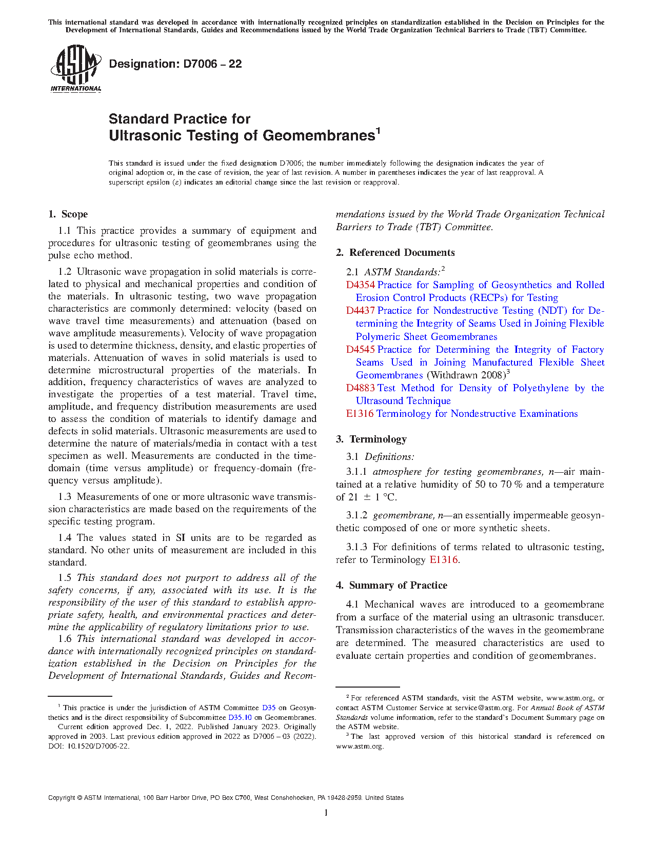 5.1 This practice covers test arrangements, measurement techniques, sampling methods, and calculations to be used for nondestructive evaluation of geomembranes using ultrasonic testing.
