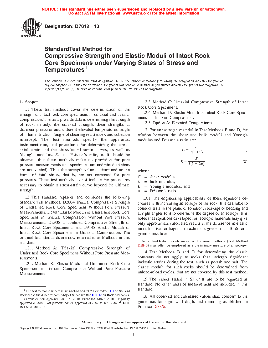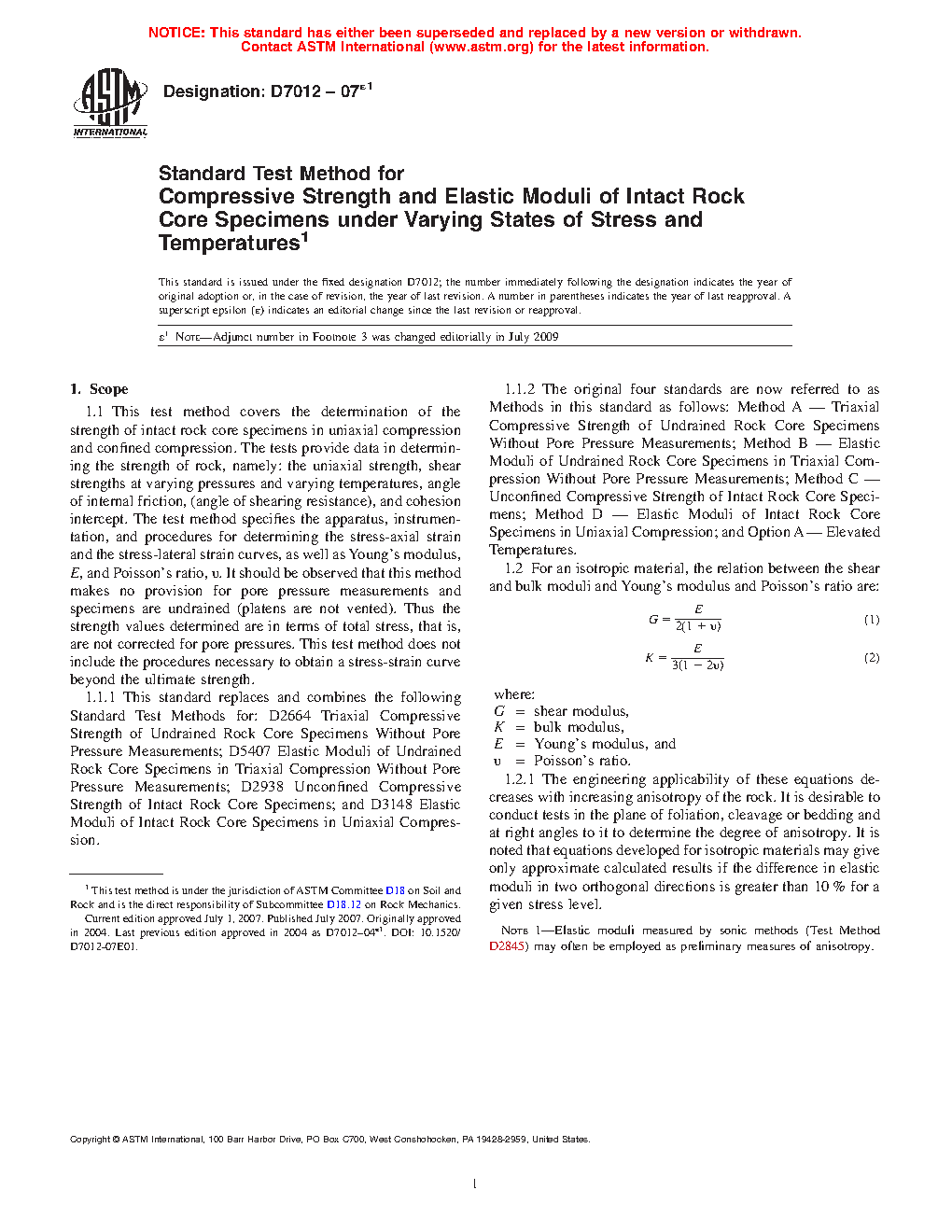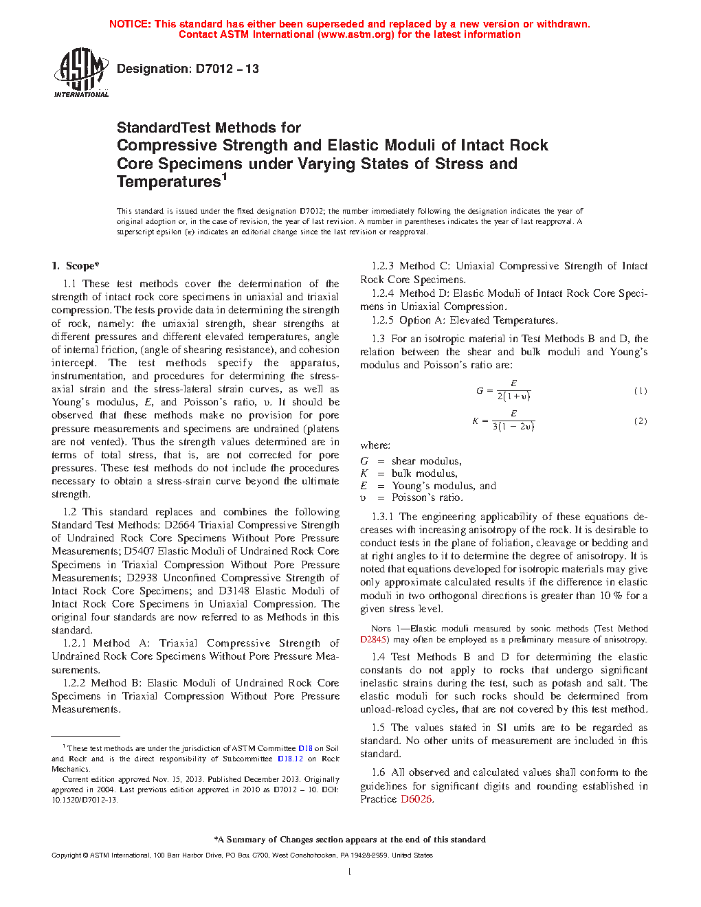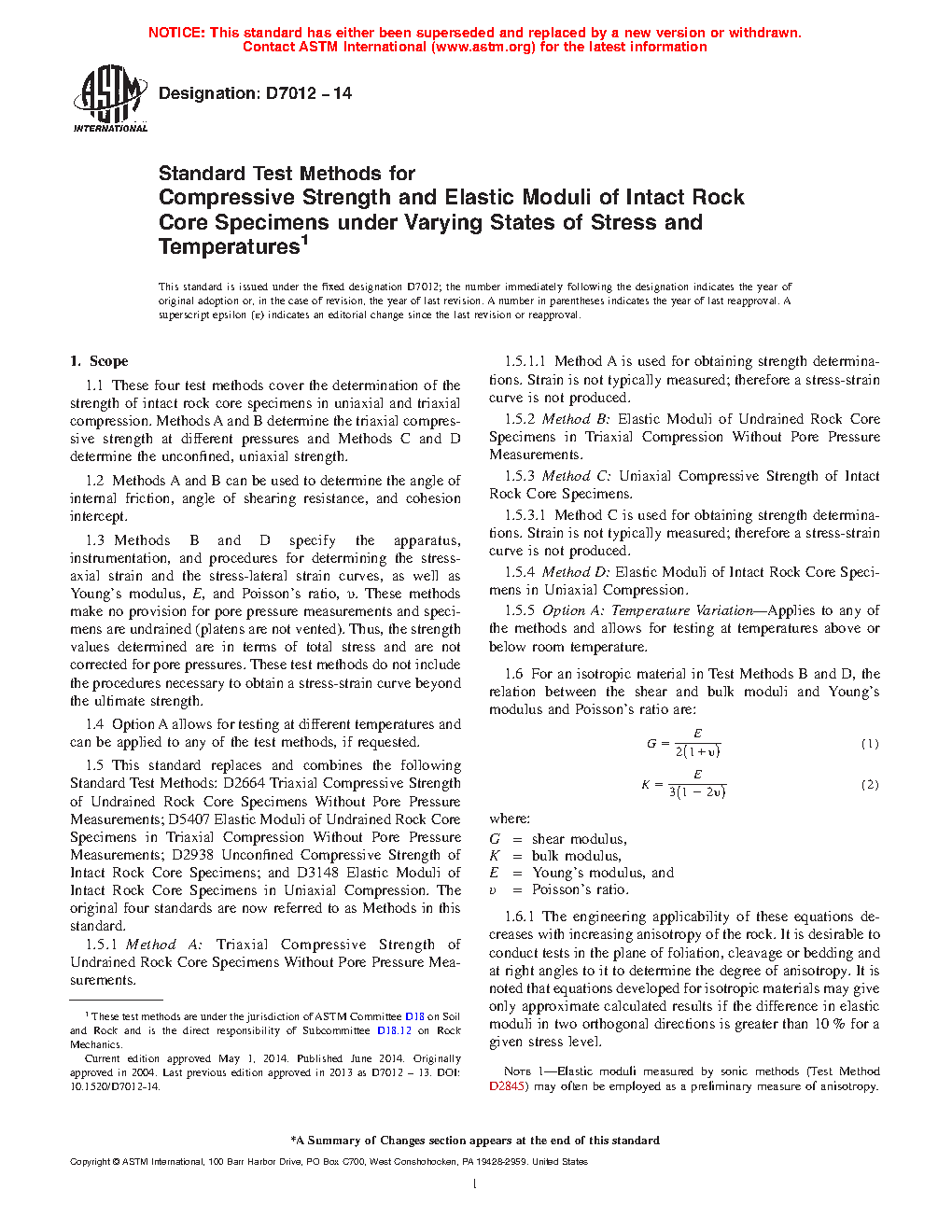 1.5 This standard replaces and combines the following Standard Test Methods: D2664 Triaxial Compressive Strength of Undrained Rock Core Specimens Without Pore Pressure Measurements; D5407 Elastic Moduli of Undrained Rock Core Specimens in Triaxial Compression Without Pore Pressure Measurements; D2938 Unconfined Compressive Strength of Intact Rock Core Specimens; and D3148 Elastic Moduli of Intact Rock Core Specimens in Uniaxial Compression. The original four standards are now referred to as Methods in this standard.